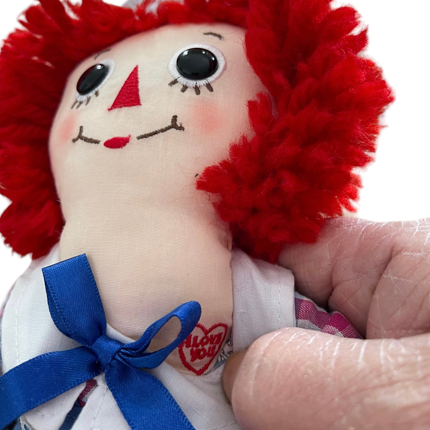 Adorable classic 12" Raggedy Andy Doll complete with 'I Love you" embroidered heart and traditional outfit. Black Button Eyes and traditional outfit. Perfect size for little hands!