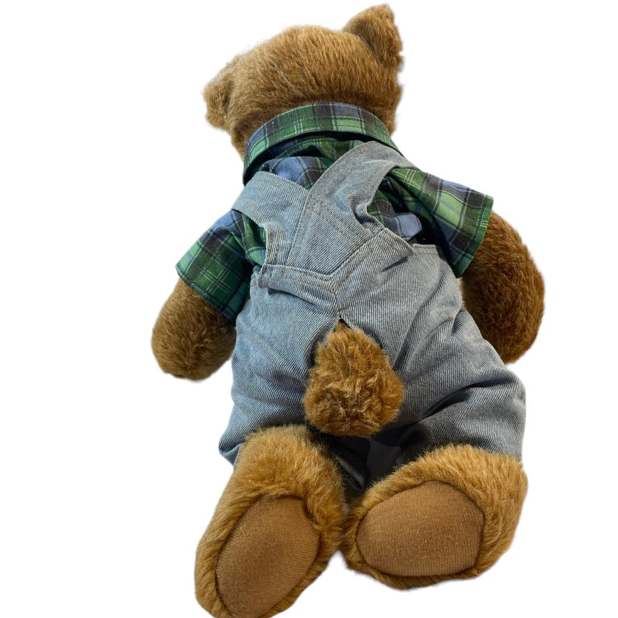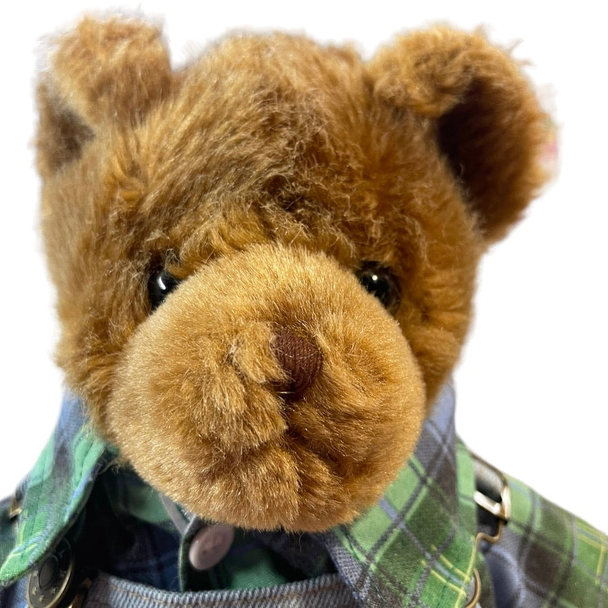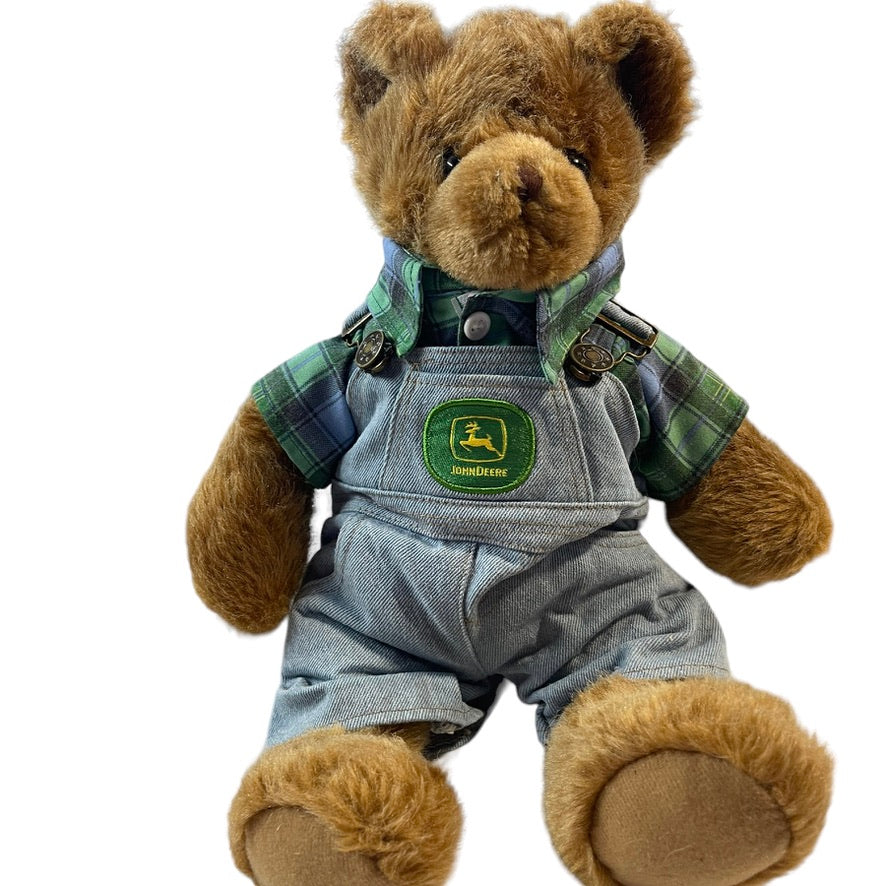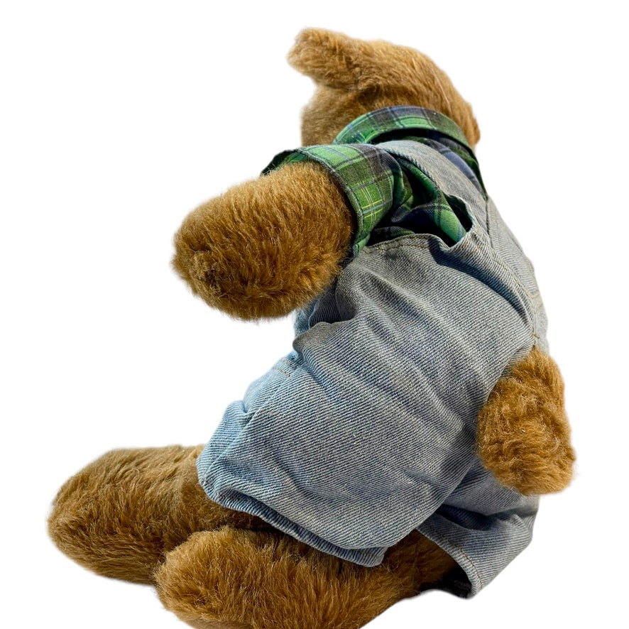 Cuddly 15" Bear Works Teddy in John Deere Coveralls & Green Plaid Shirt
