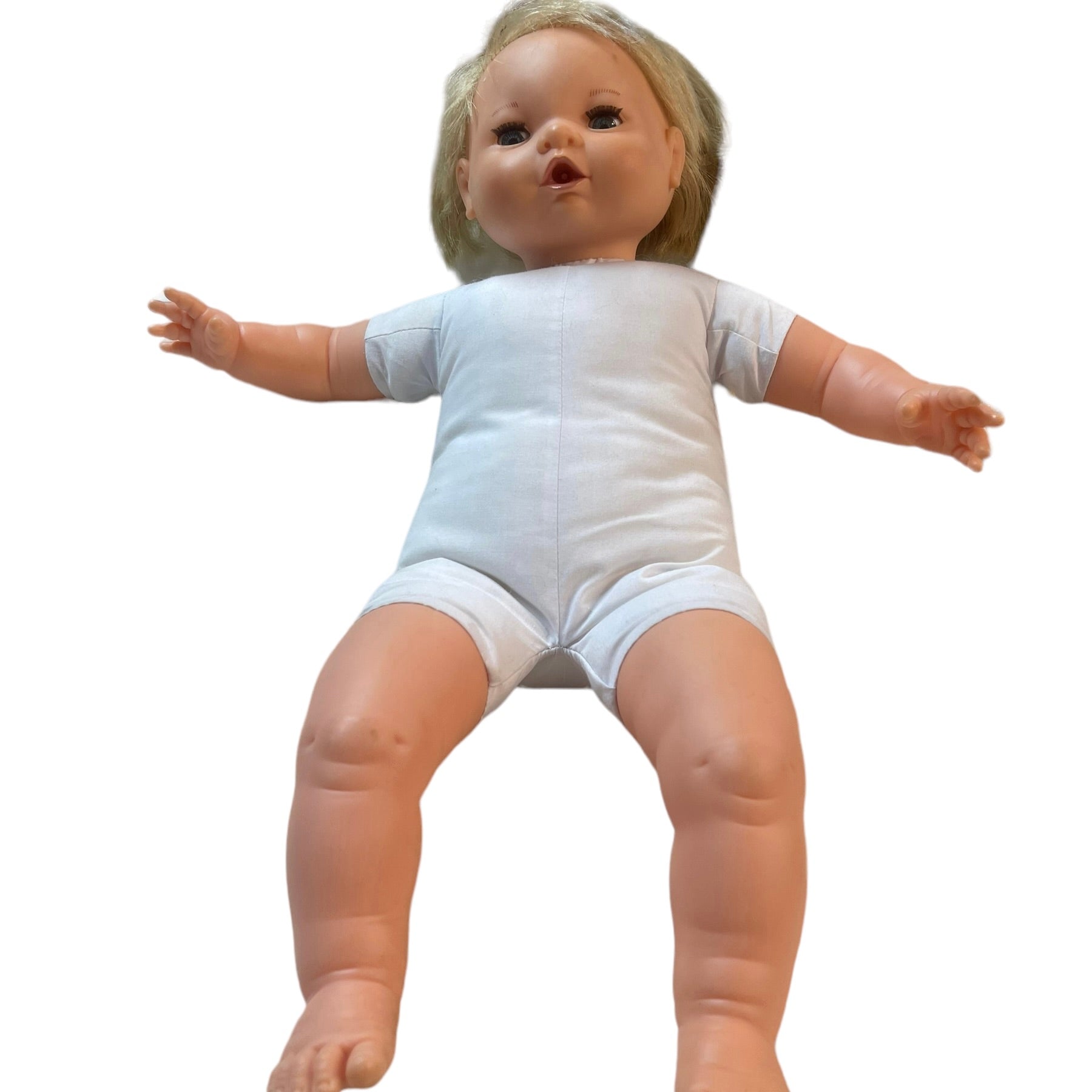 This beautiful, weighted vintage Irwin baby doll is in excellent preowned and working condition, with shiny blond hair and bright blue sleepy eyes with black lashes. A really lovely baby doll for a collector or for new little parents!