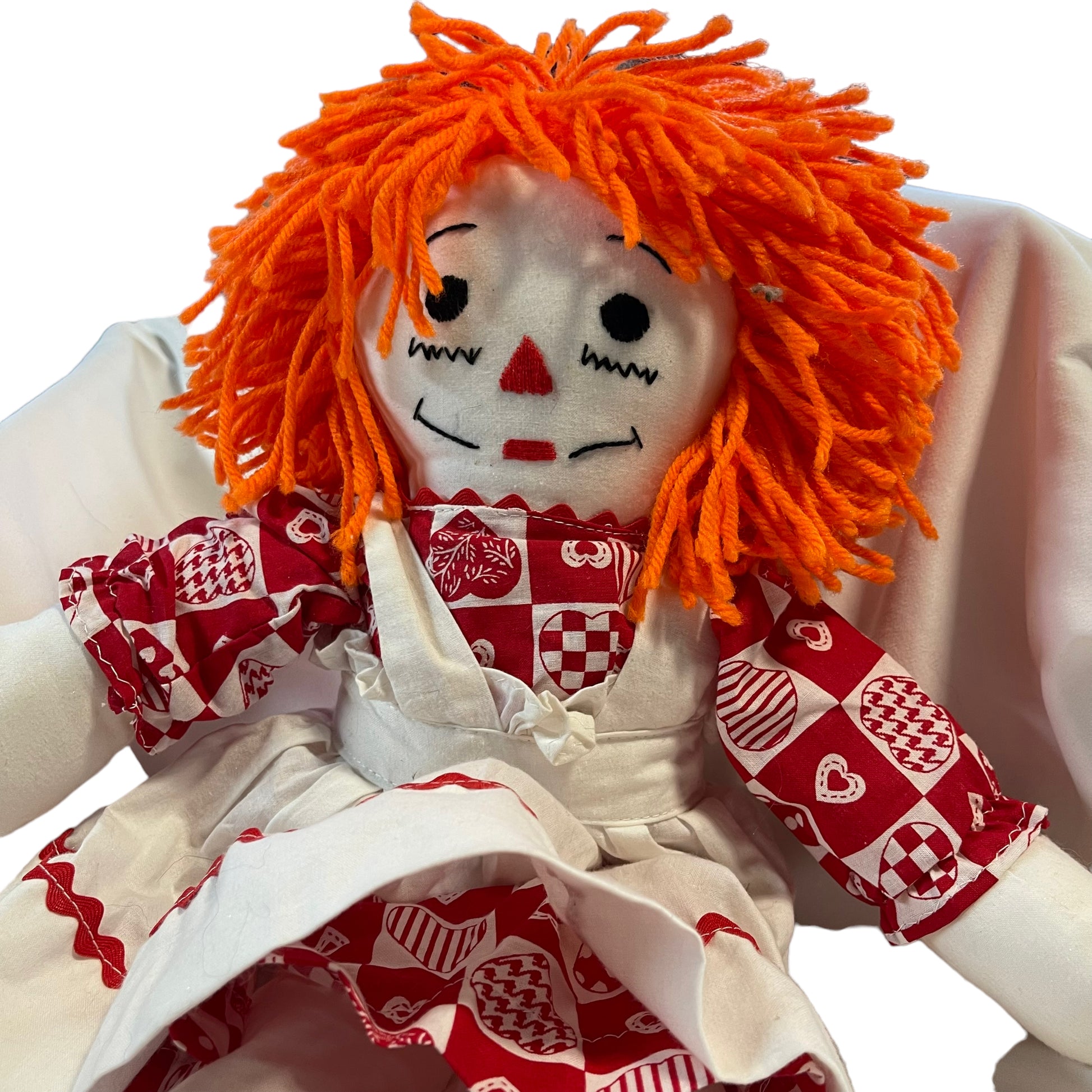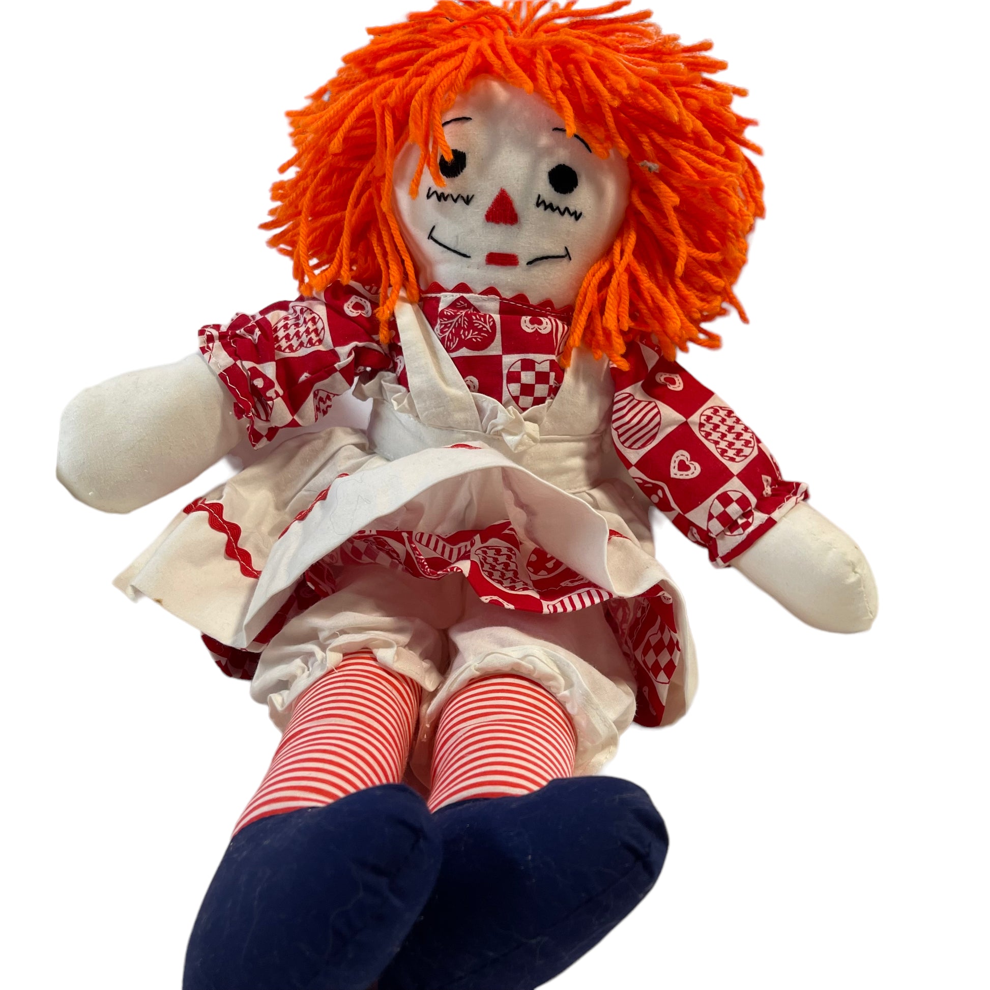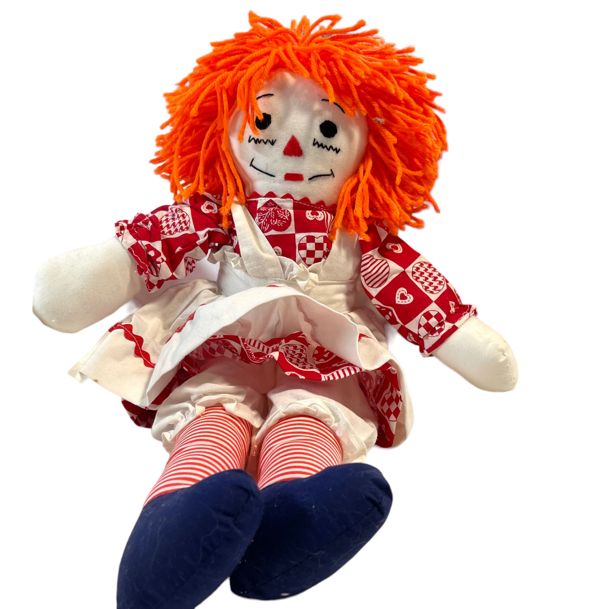 Adorable Classic 20" Stuffed Raggedy Ann, appears handmade, dressed in traditional Red and White outfit complete with pinafore. Embroidered face and heart on chest. Excellent preowned condition. A real treasure.