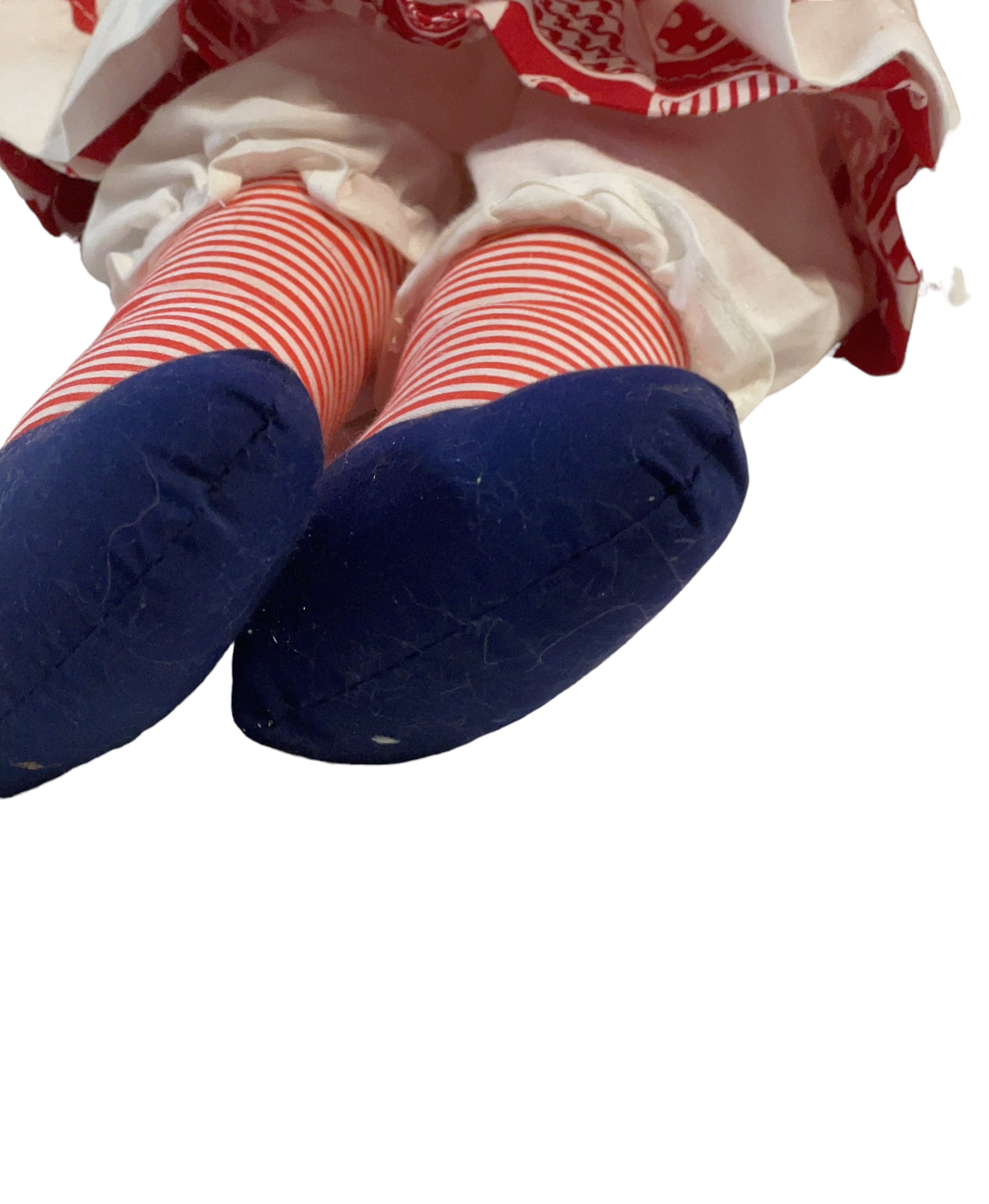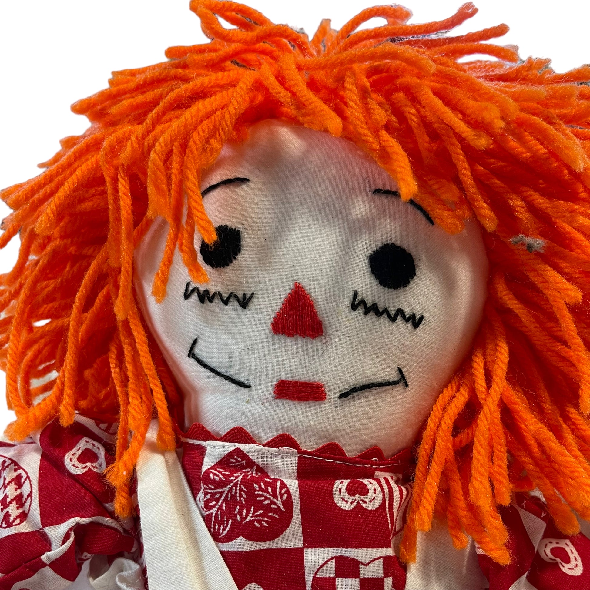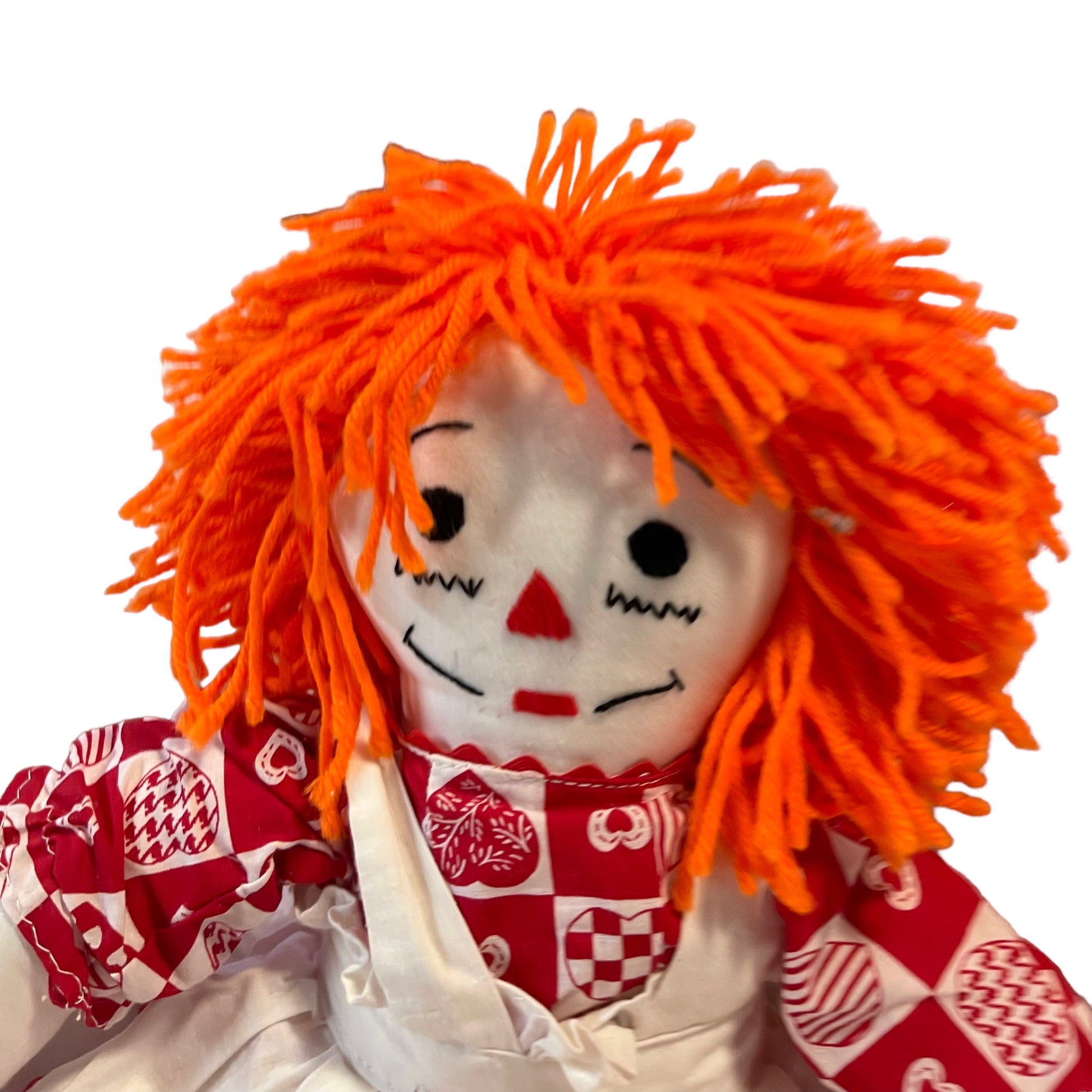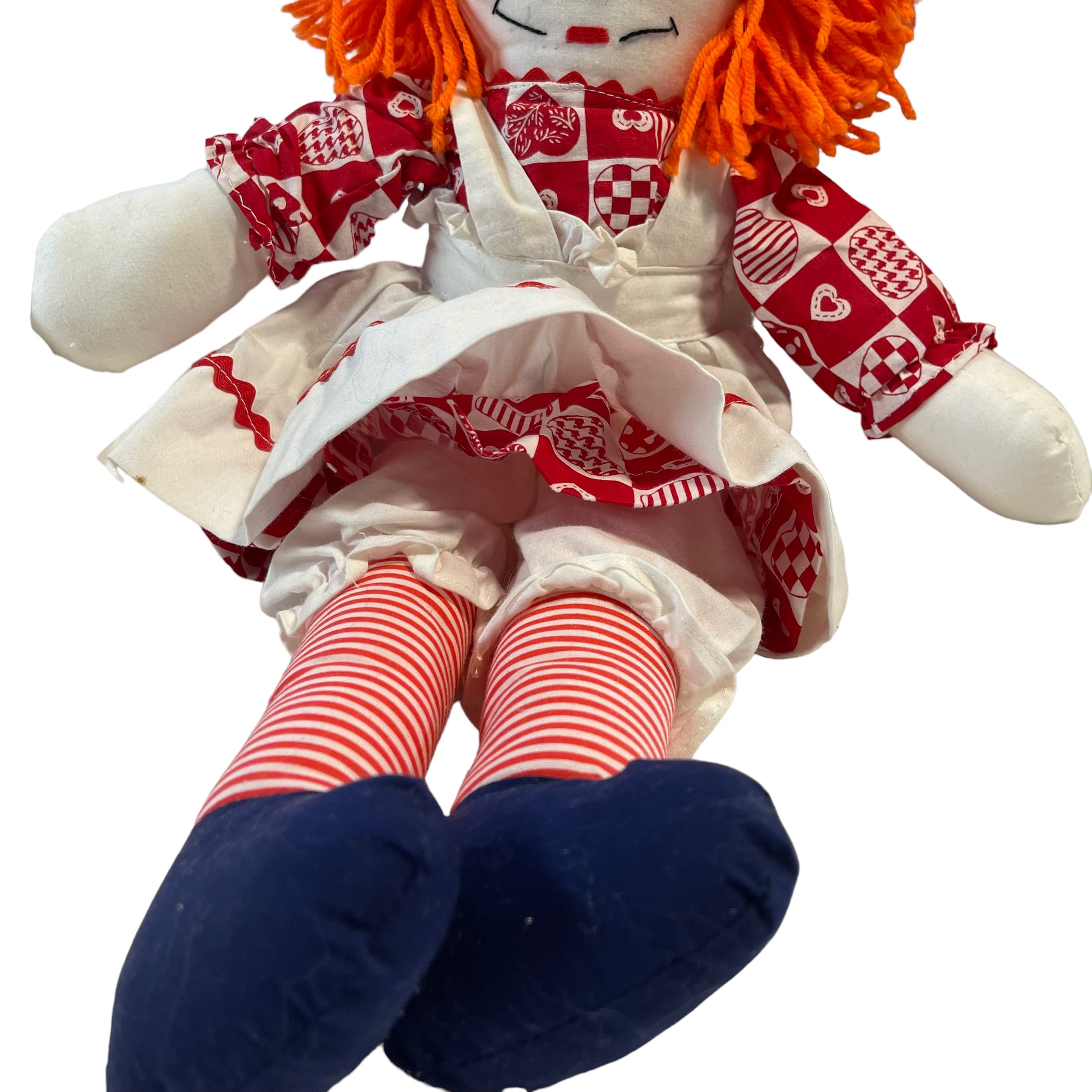 Adorable Classic 20" Stuffed Raggedy Ann, appears handmade, dressed in traditional Red and White outfit complete with pinafore. Embroidered face and heart on chest. Excellent preowned condition. A real treasure.