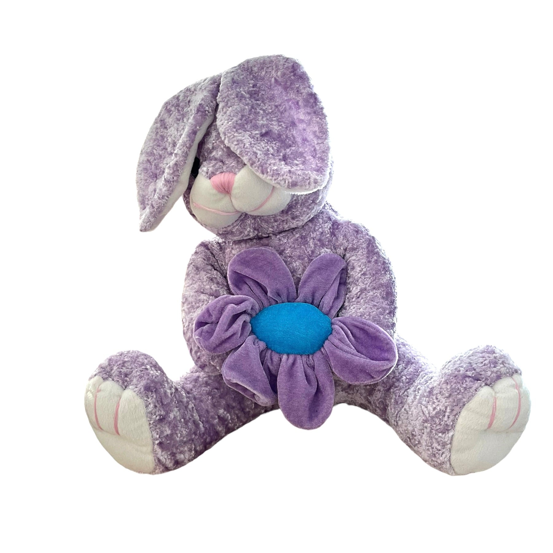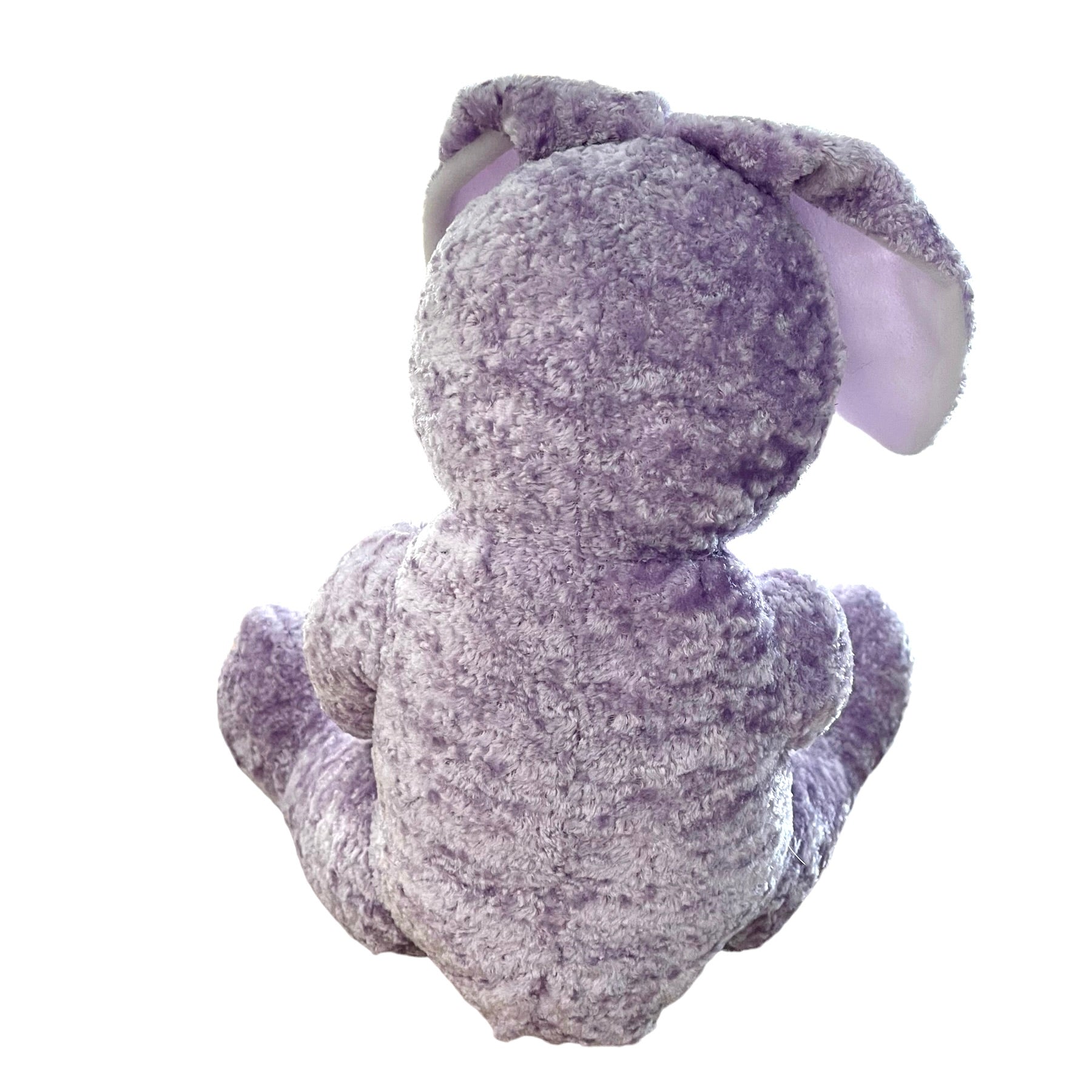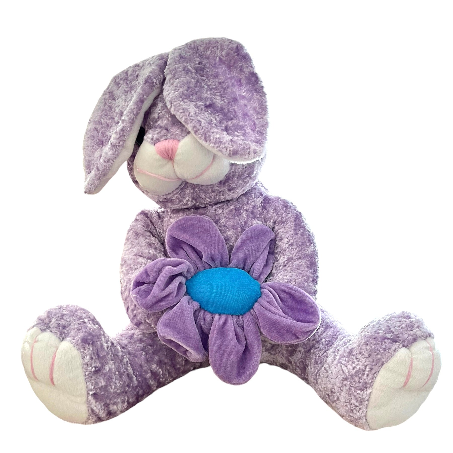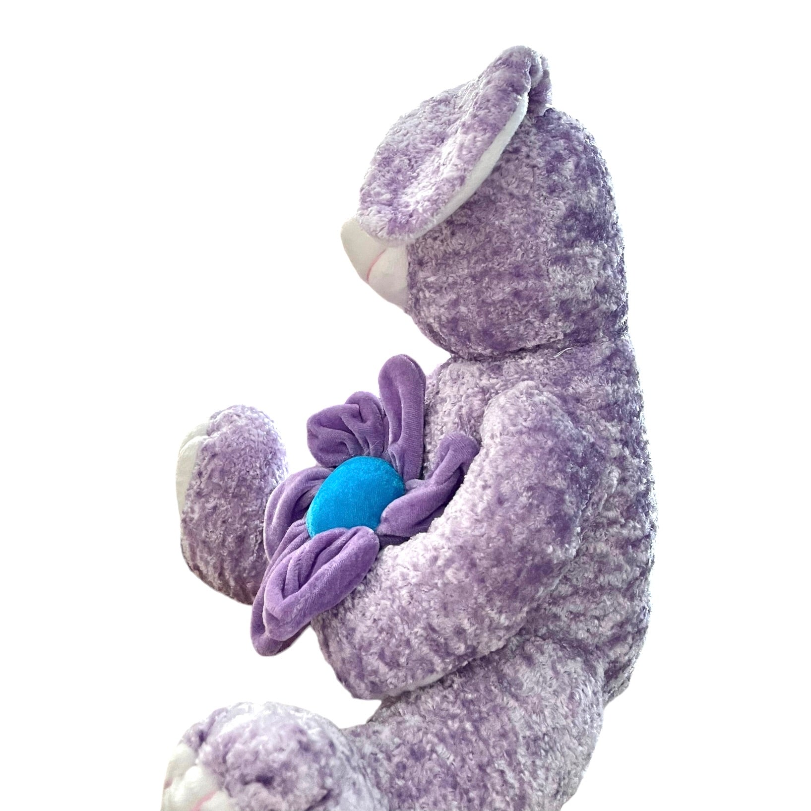 Velvety Frosted Lavender Bunny Plush with Large Purple Flower, Vintage.