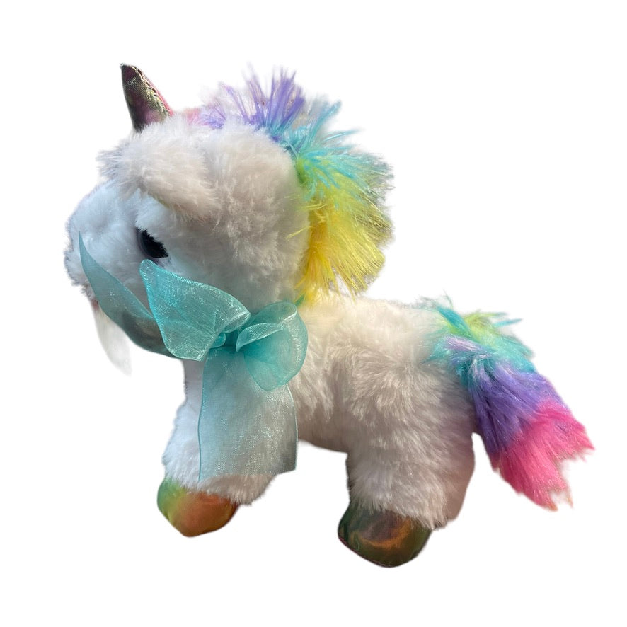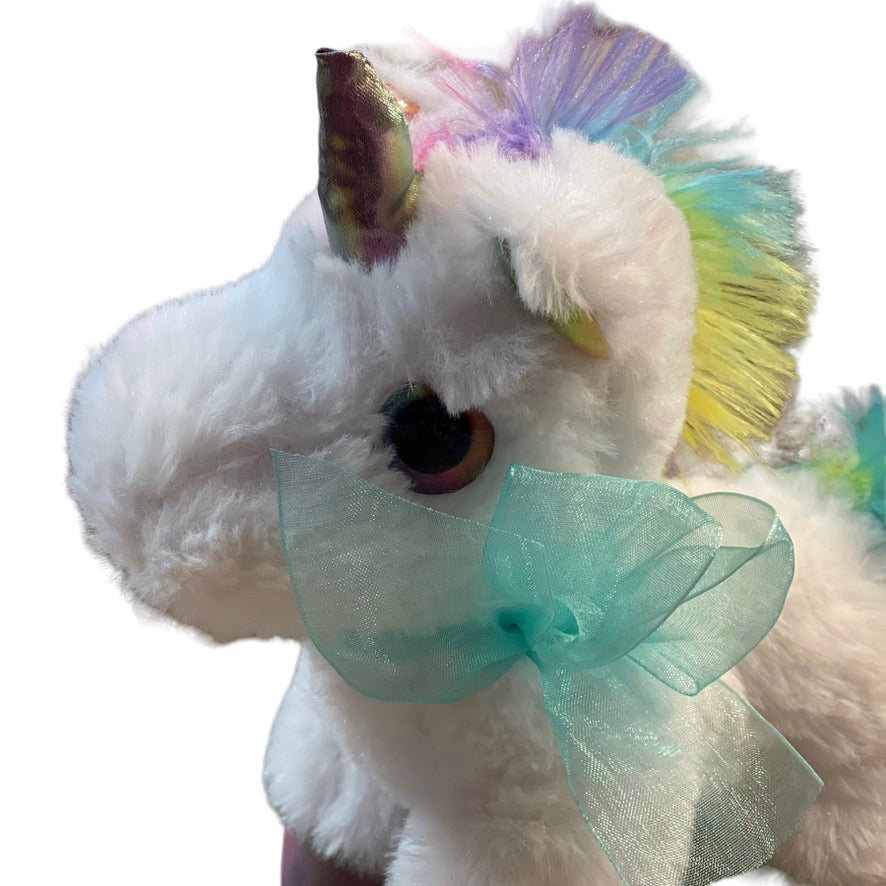 7" White Unicorn Stuffed Animal Plush With Beautiful Pastel Rainbow Horn, Hooves, Ears and Tail all accented with a shimmery aqua chiffon bow. This pretty baby is just waiting for a new friend.