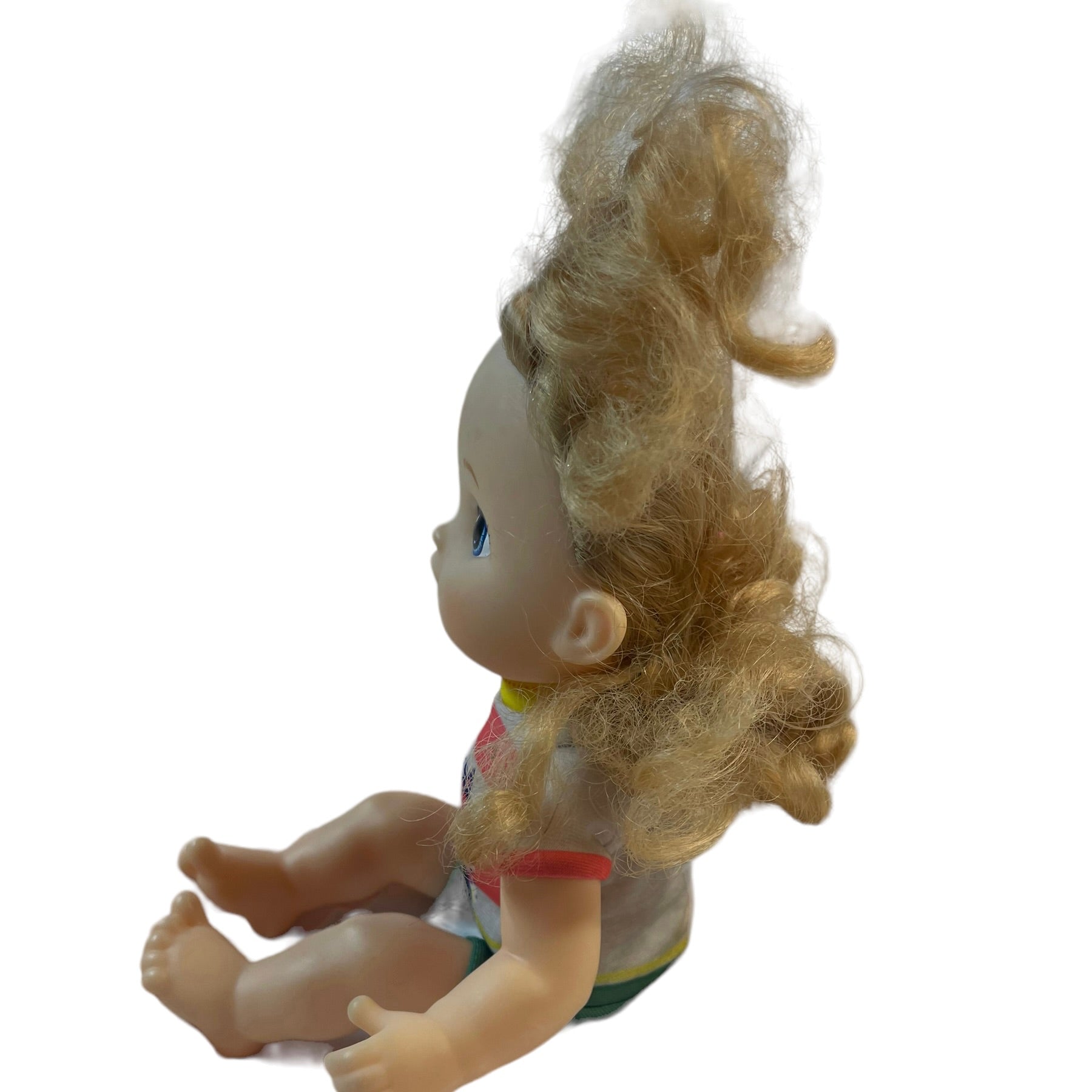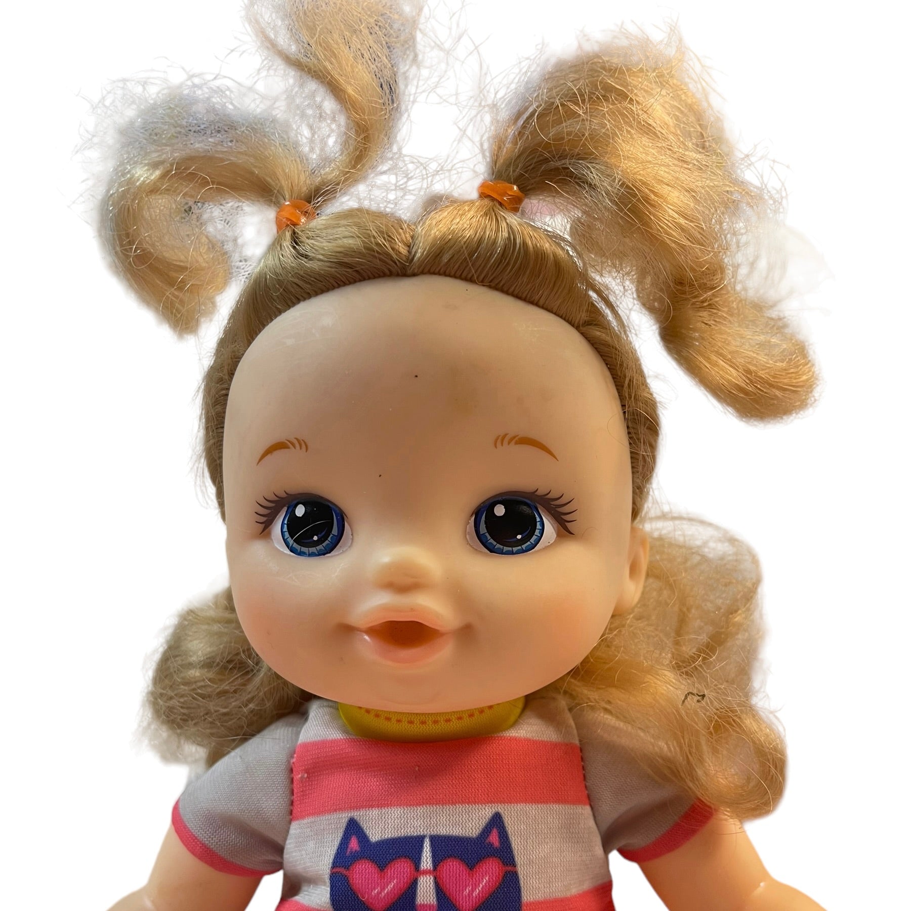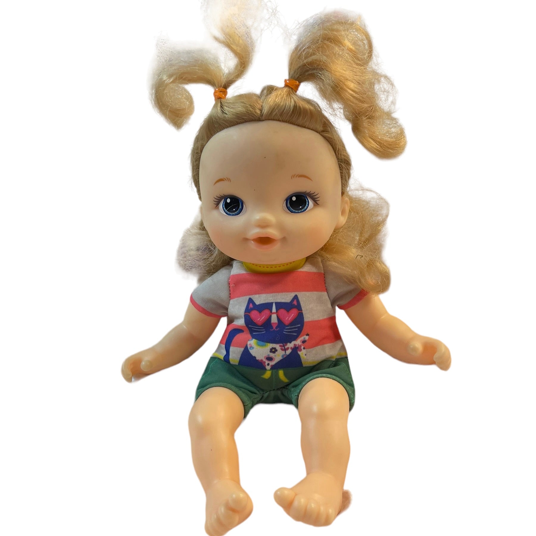 9" Baby Alive Doll Painted Blue Eyes, Kitten Onesie & Blond Hair GUC