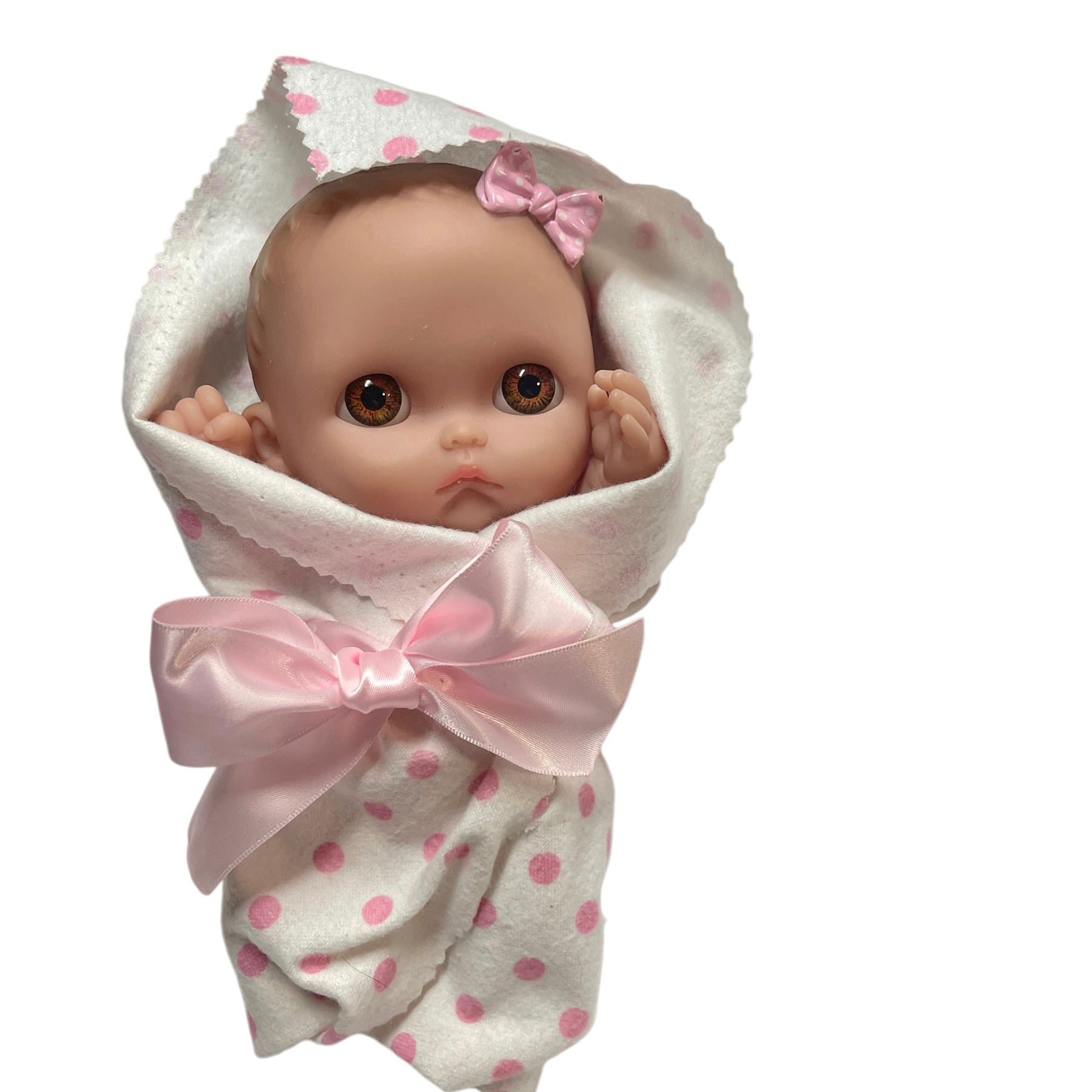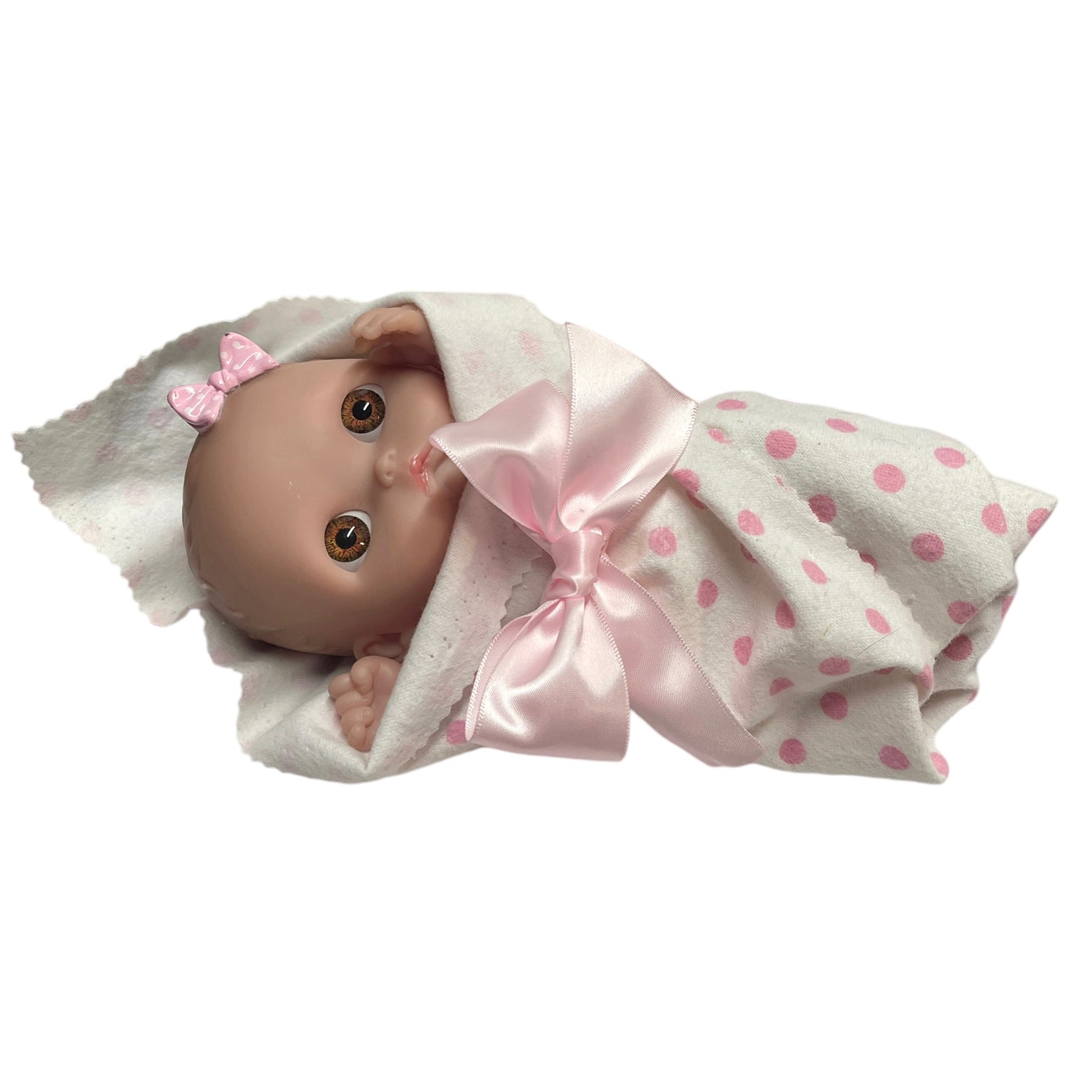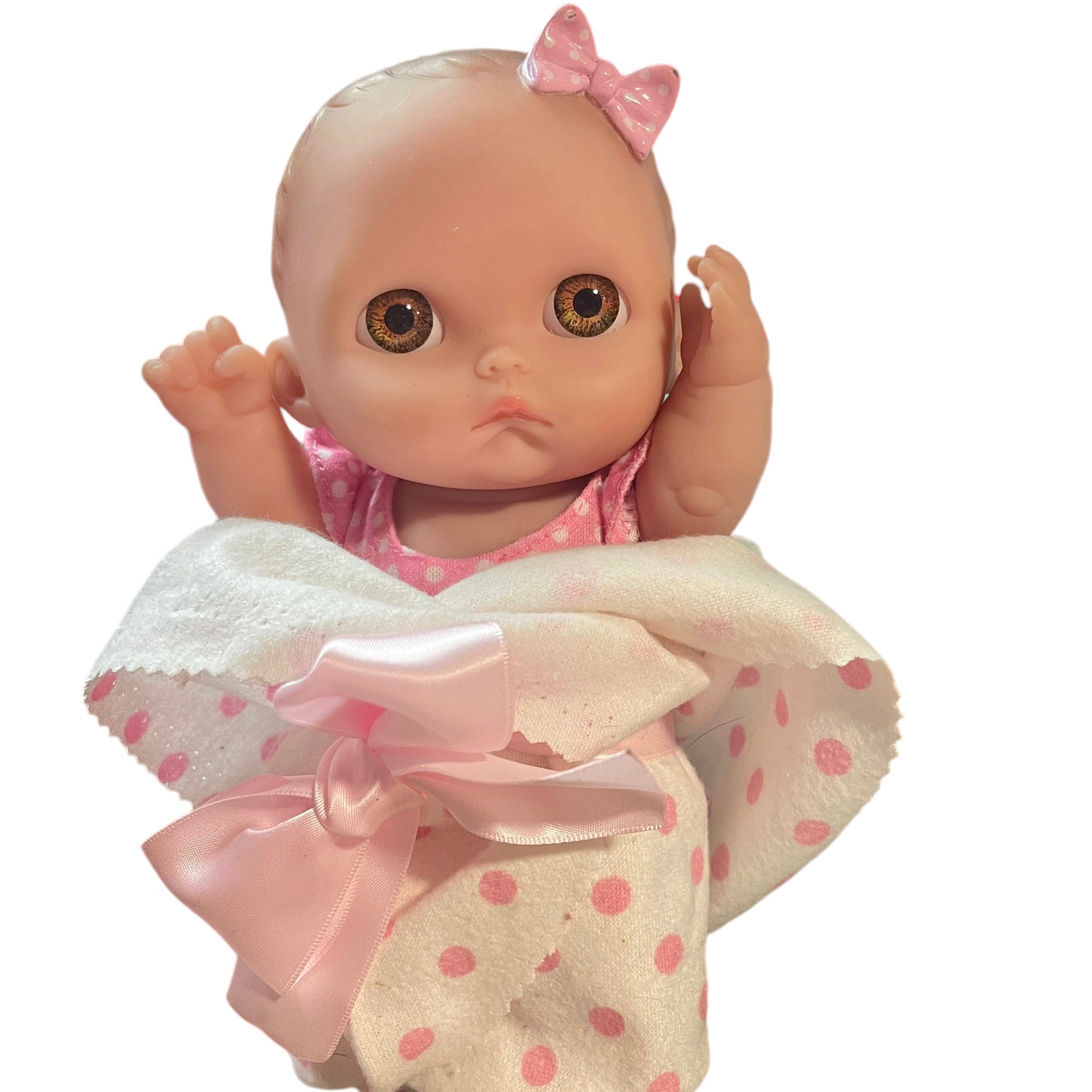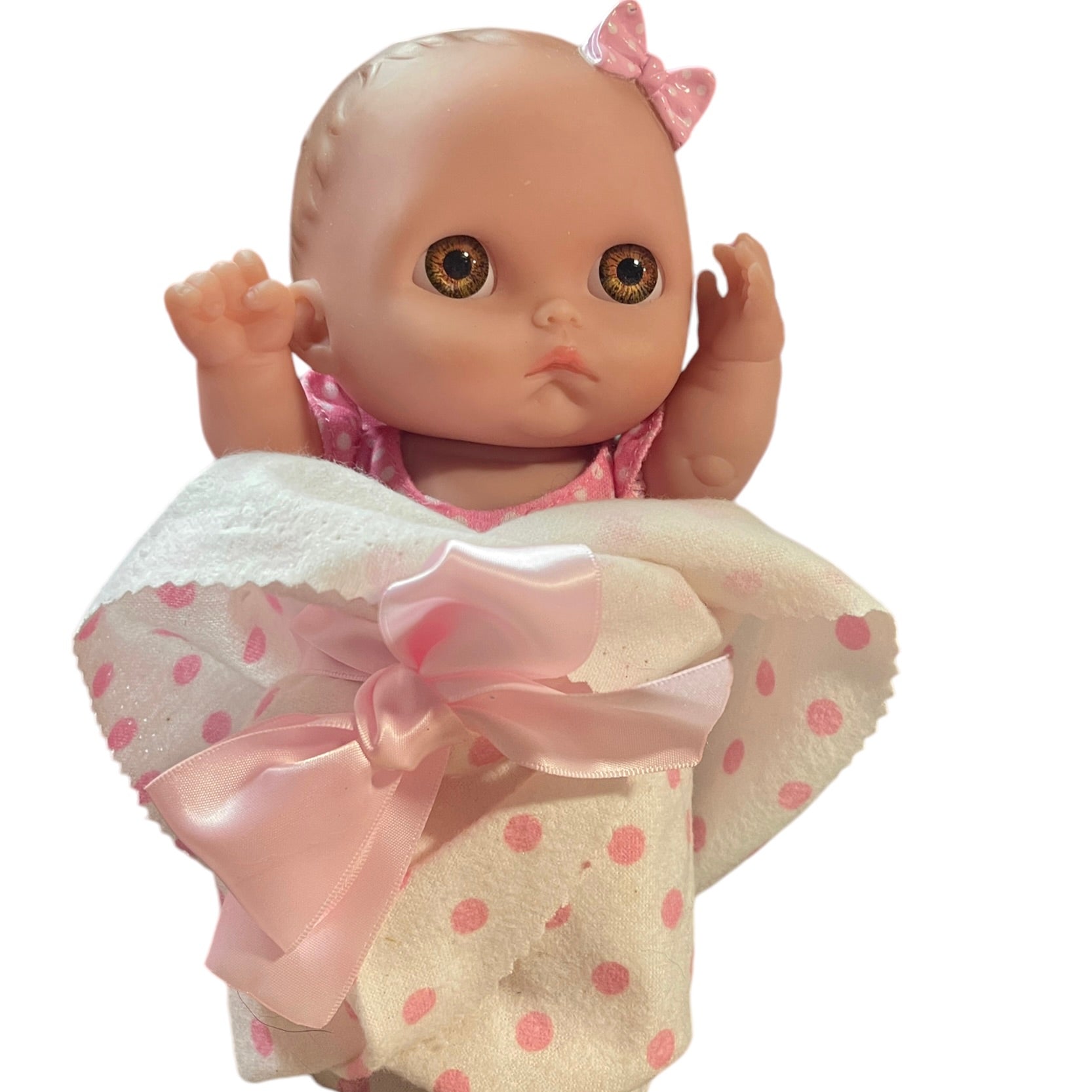 This beautifully detailed Pouting Baby has vinyl hair with pink bow and a cute ladybug romper. She is washable and posable and is wrapped in a light flannel blanket. SO SWEET!