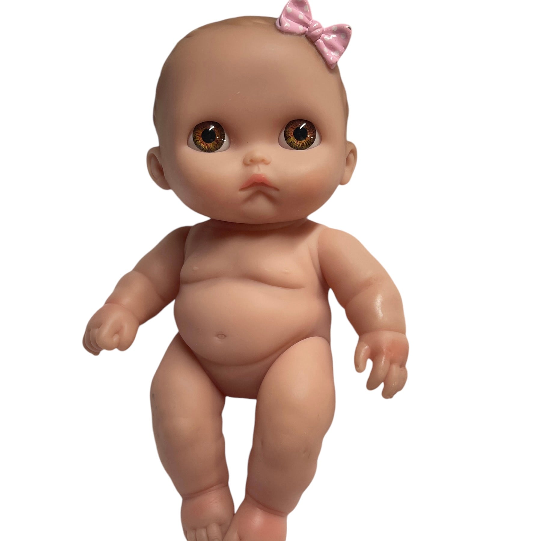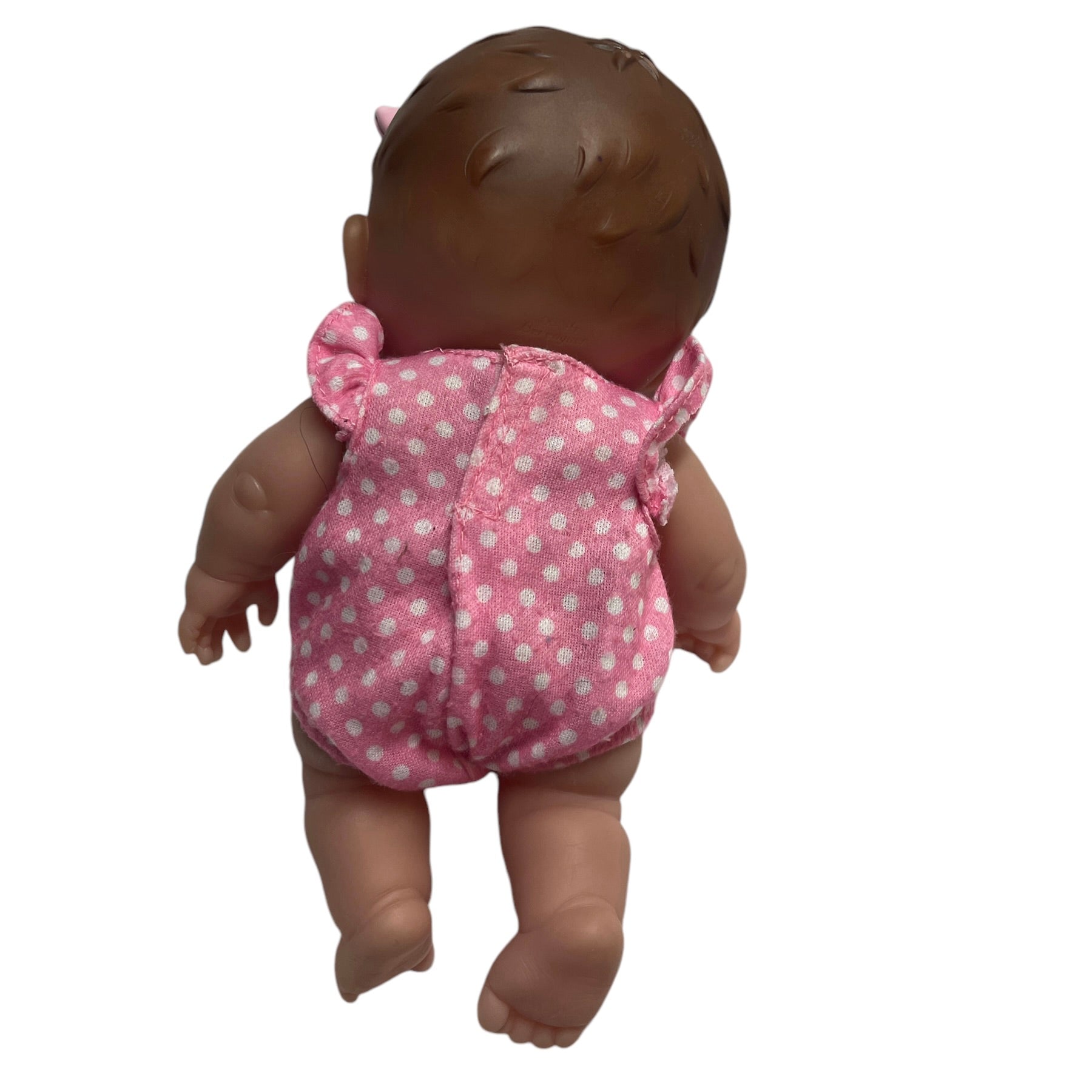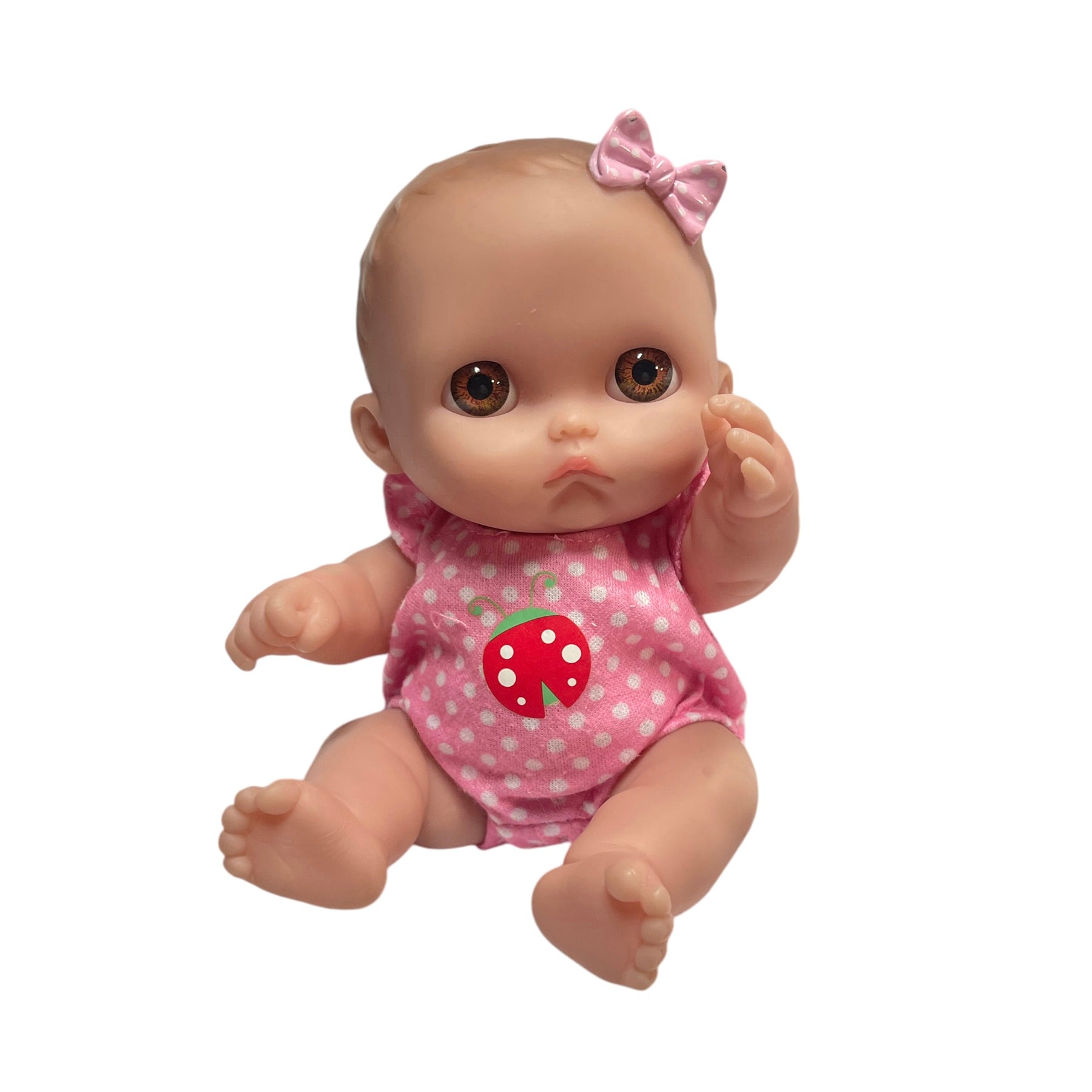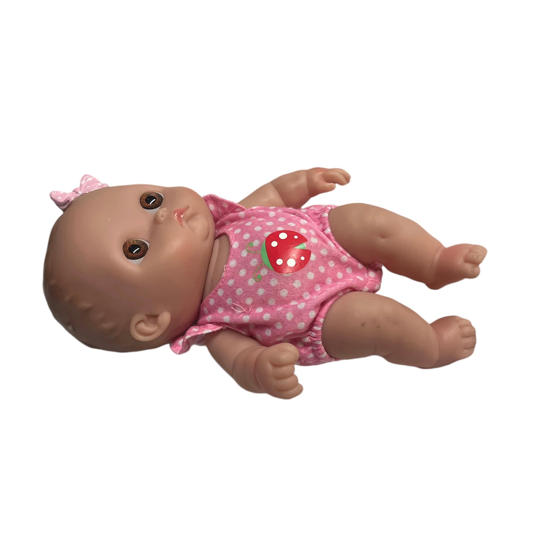 9" Berenguer Posable Pouting L'il Cutie Vinyl Baby Doll, Vinyl Bow & Sweet Ladybug Romper EUC
