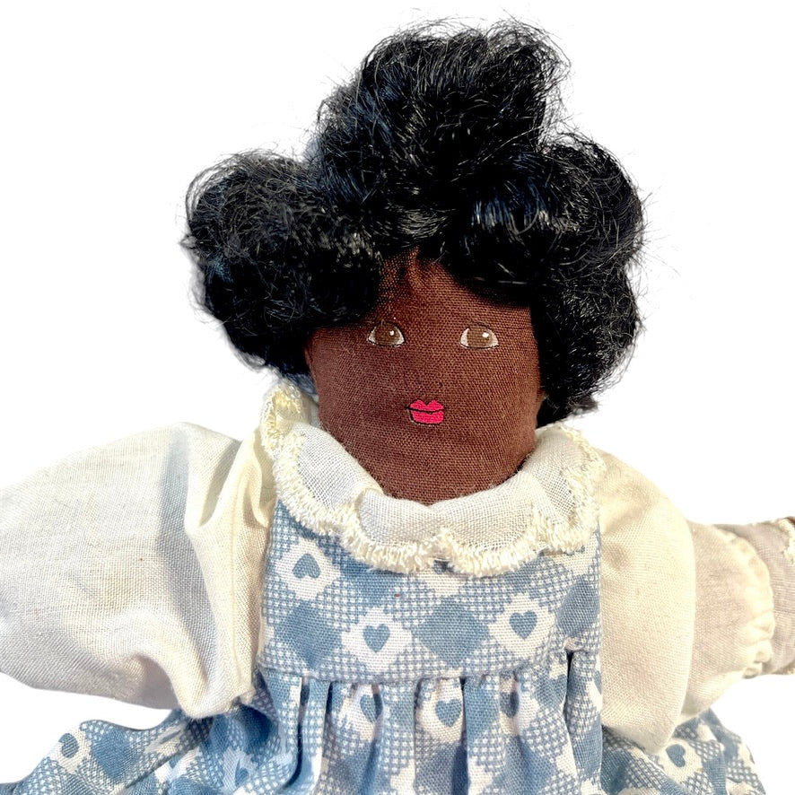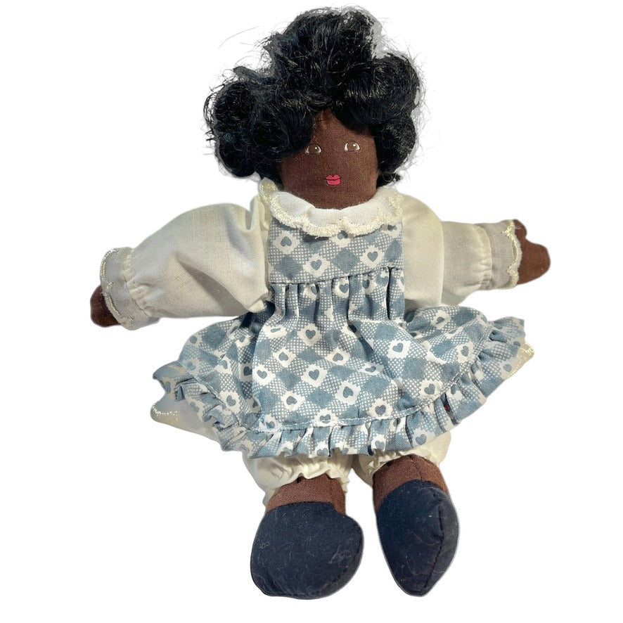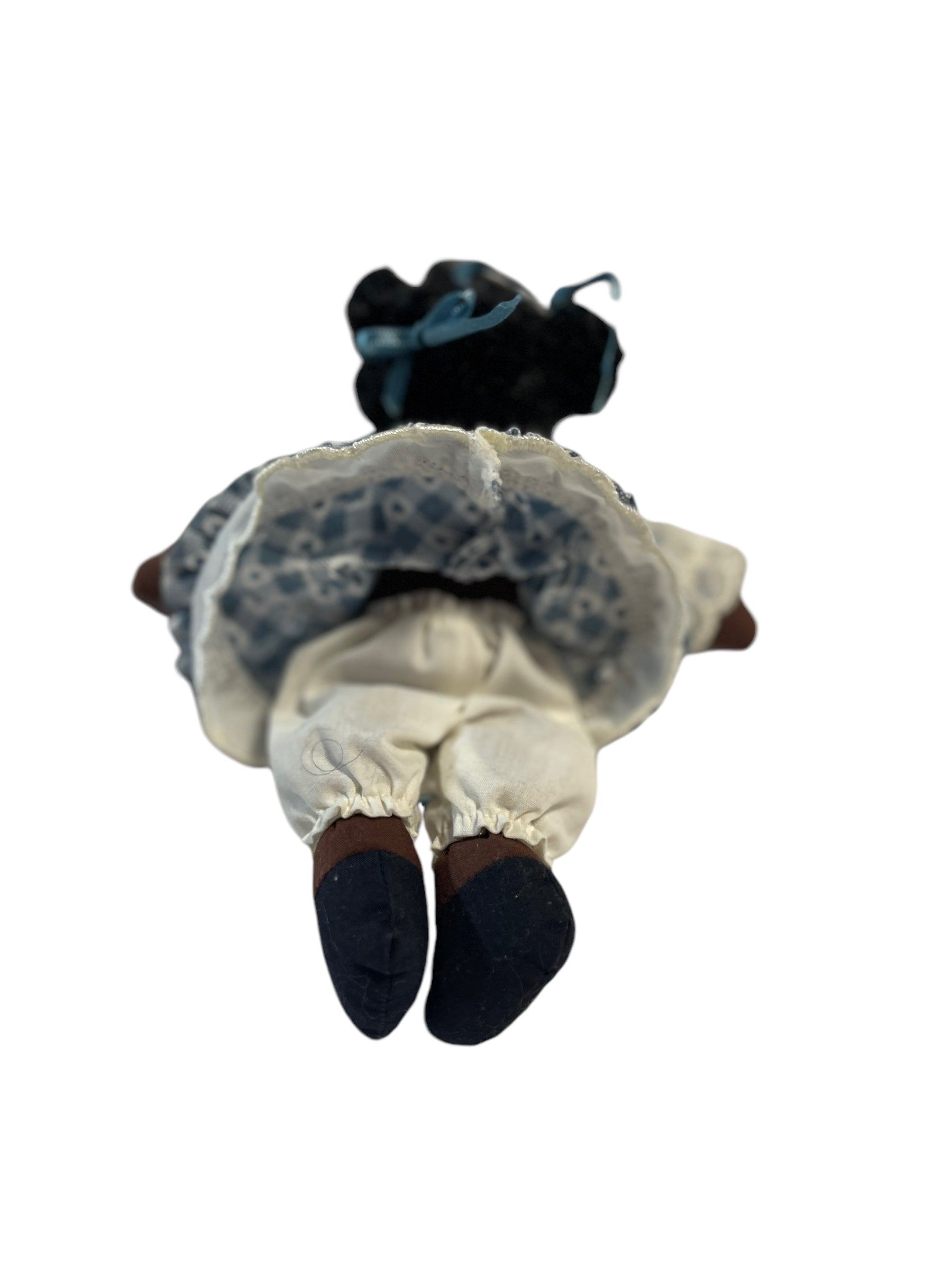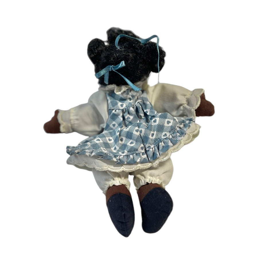 This sweet 8" stuffed Folk Art Dolly has a painted face and lots of fluffy black hair dressed with blue ribbons. Her dress ad bloomers are perfect for this sweet girl. A real treasure