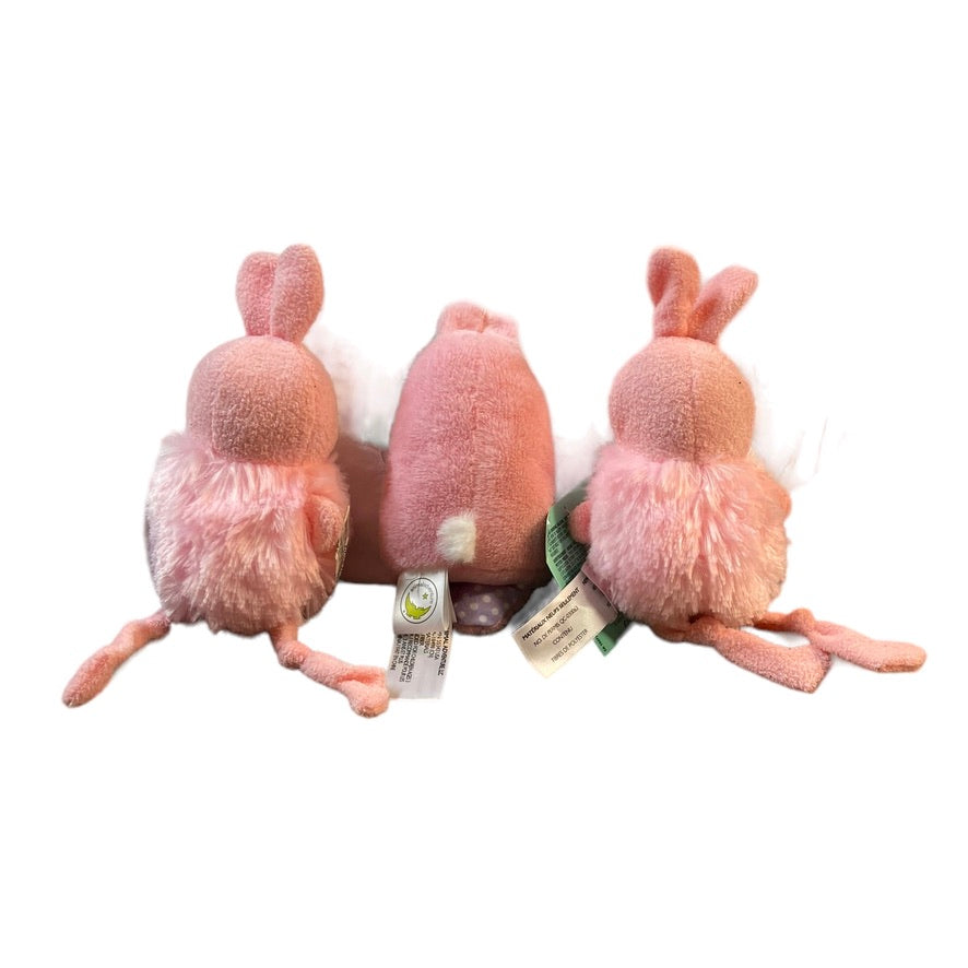 Fun lot of 3 pink Animal Adventure stuffed bunny rabbit Easter plush. Two embroidered Flat Bunnies and one long legged Roly-Poly in like new preowned condition with tags.