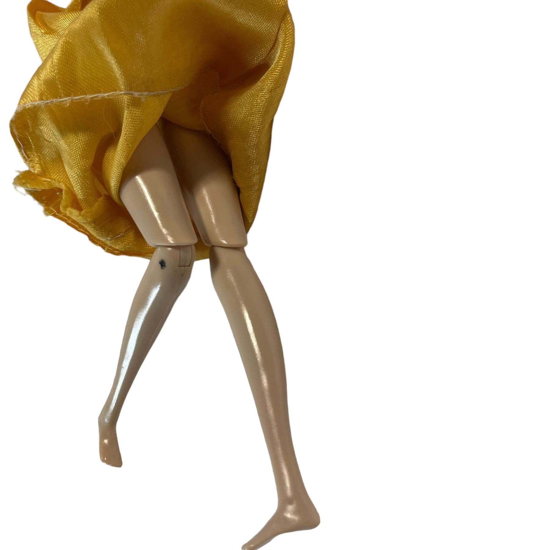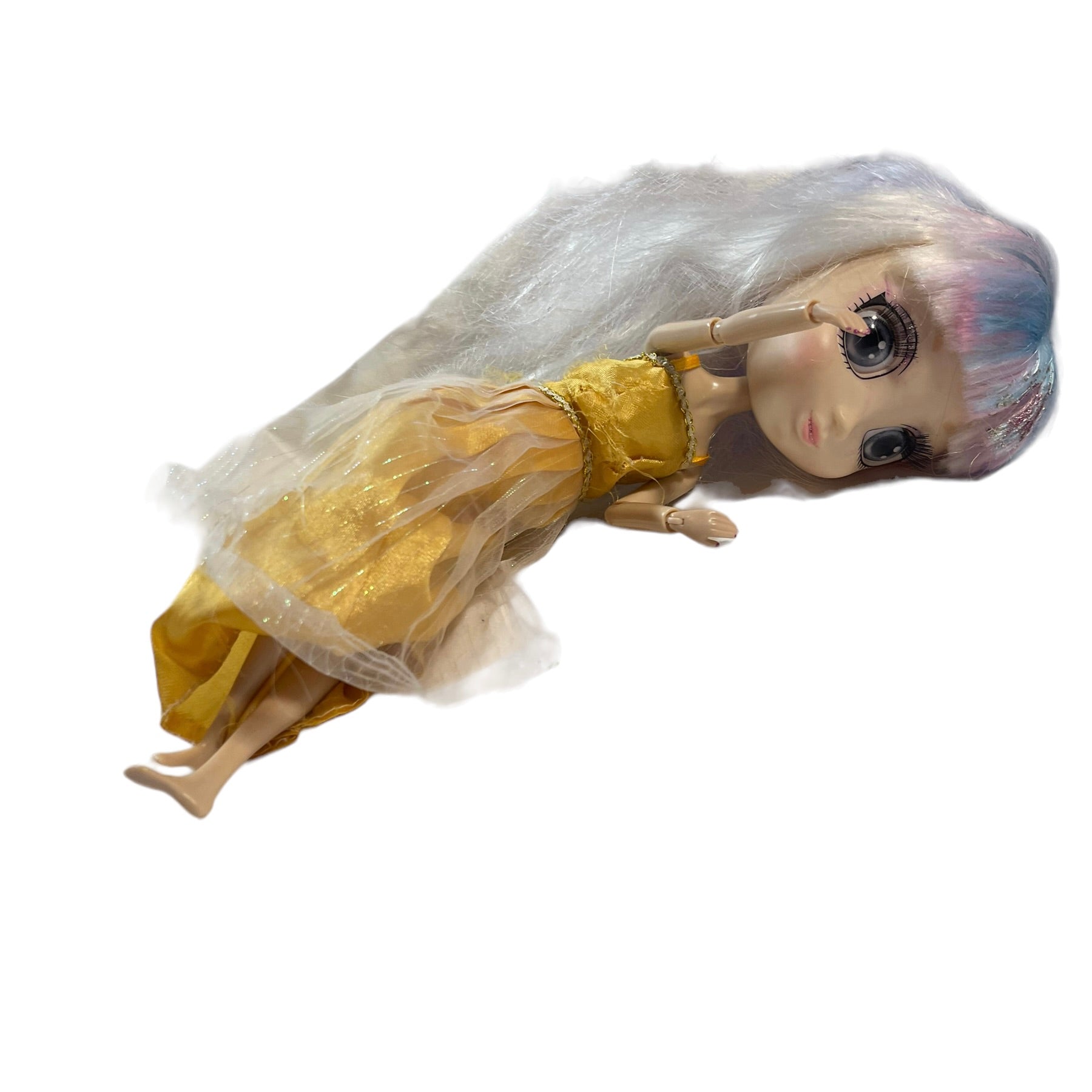 This Beautiful Shibauku Fashion Doll has platinum hair with pastel streaks and sparkles and her gorgeous HUGE grey eyes are fringed with long black lashes. The yellow, full length dress shows lots of wear, but she is otherwise in excellent preowned condition.
