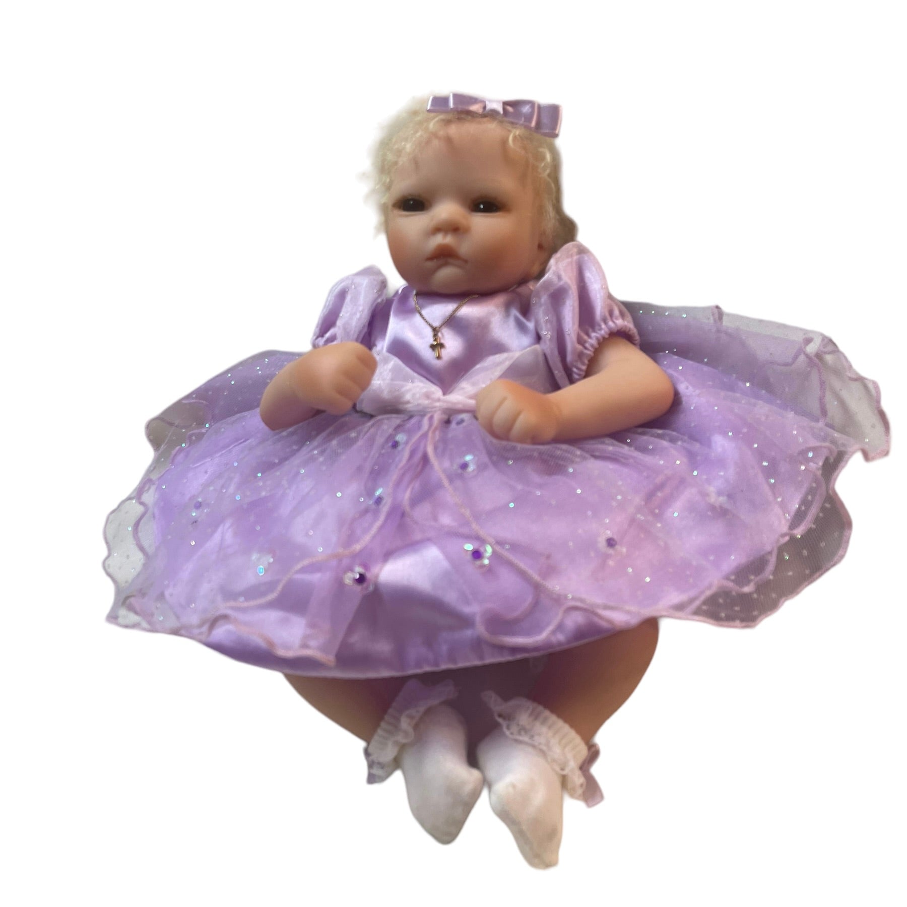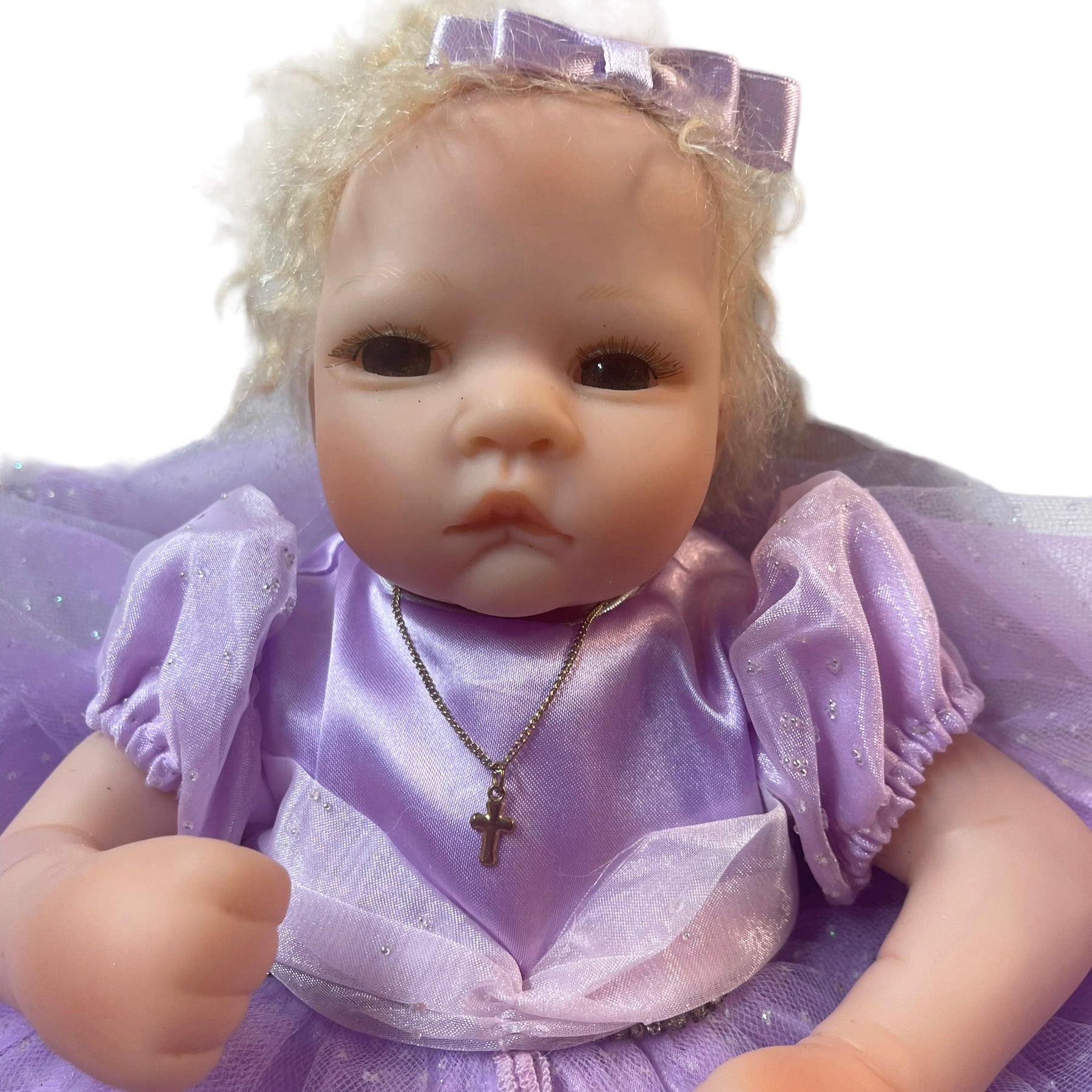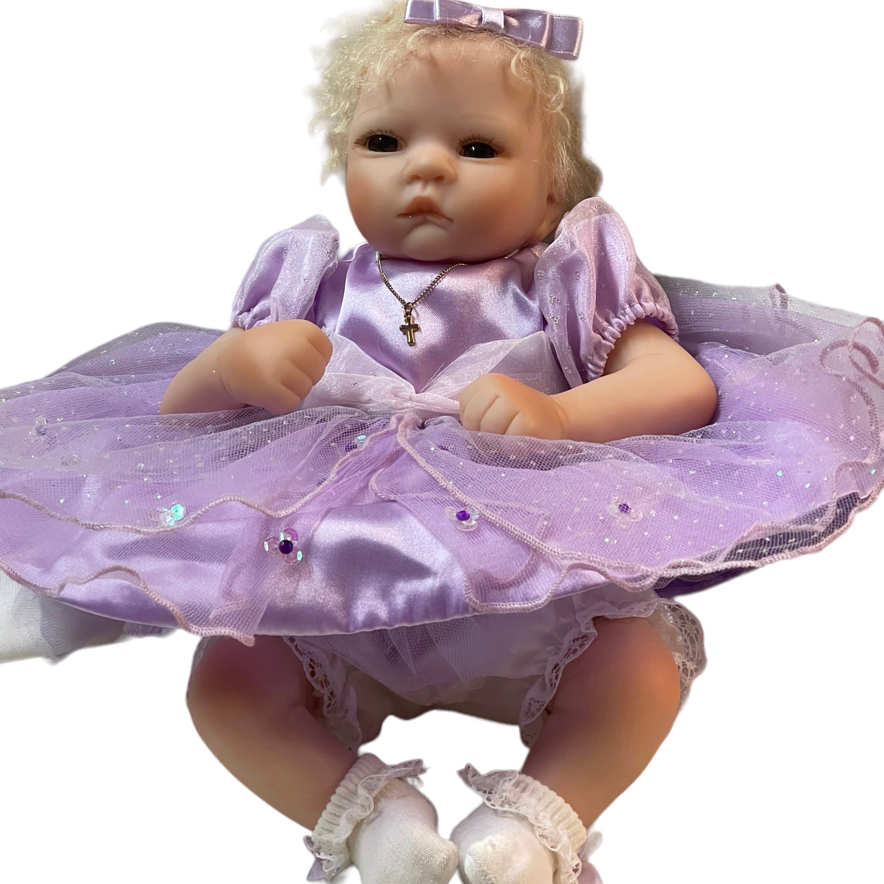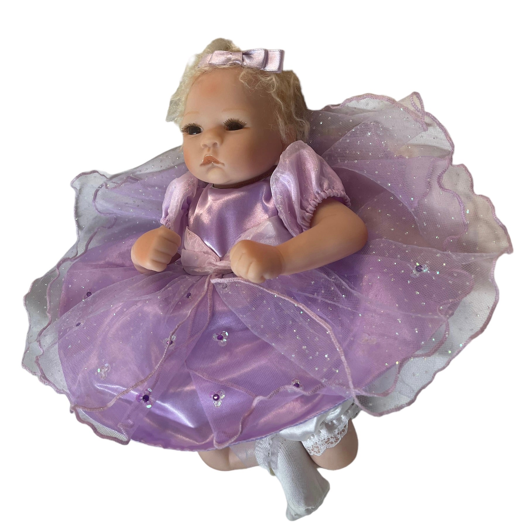 This exquisite Baby Doll is beautifully scented and moulded with dark shiny eyes, lashes and wispy, curly blond hair. Grace is dressed in Lavender satin, tulle and sparkles and has ribbons on her socks and in her hair. This beautiful doll is wearing a silver cross & chain, and her music box plays 'Amazing Grace.' A beautiful baby to play with, or a lovely addition to your collection.