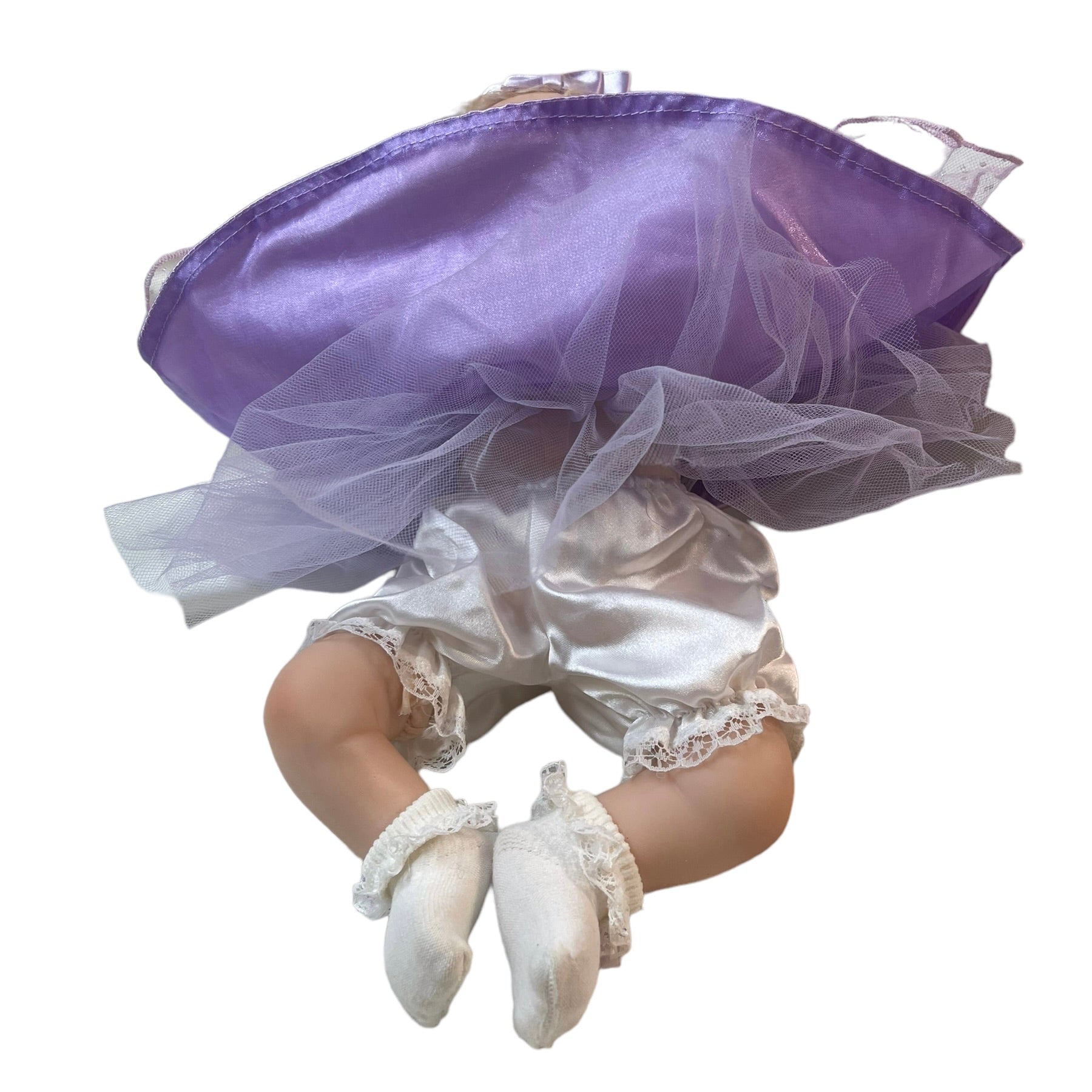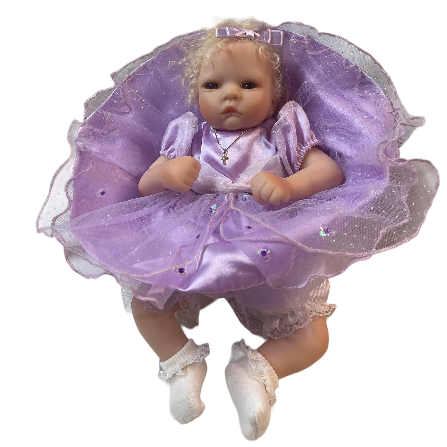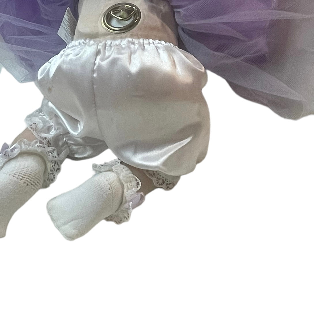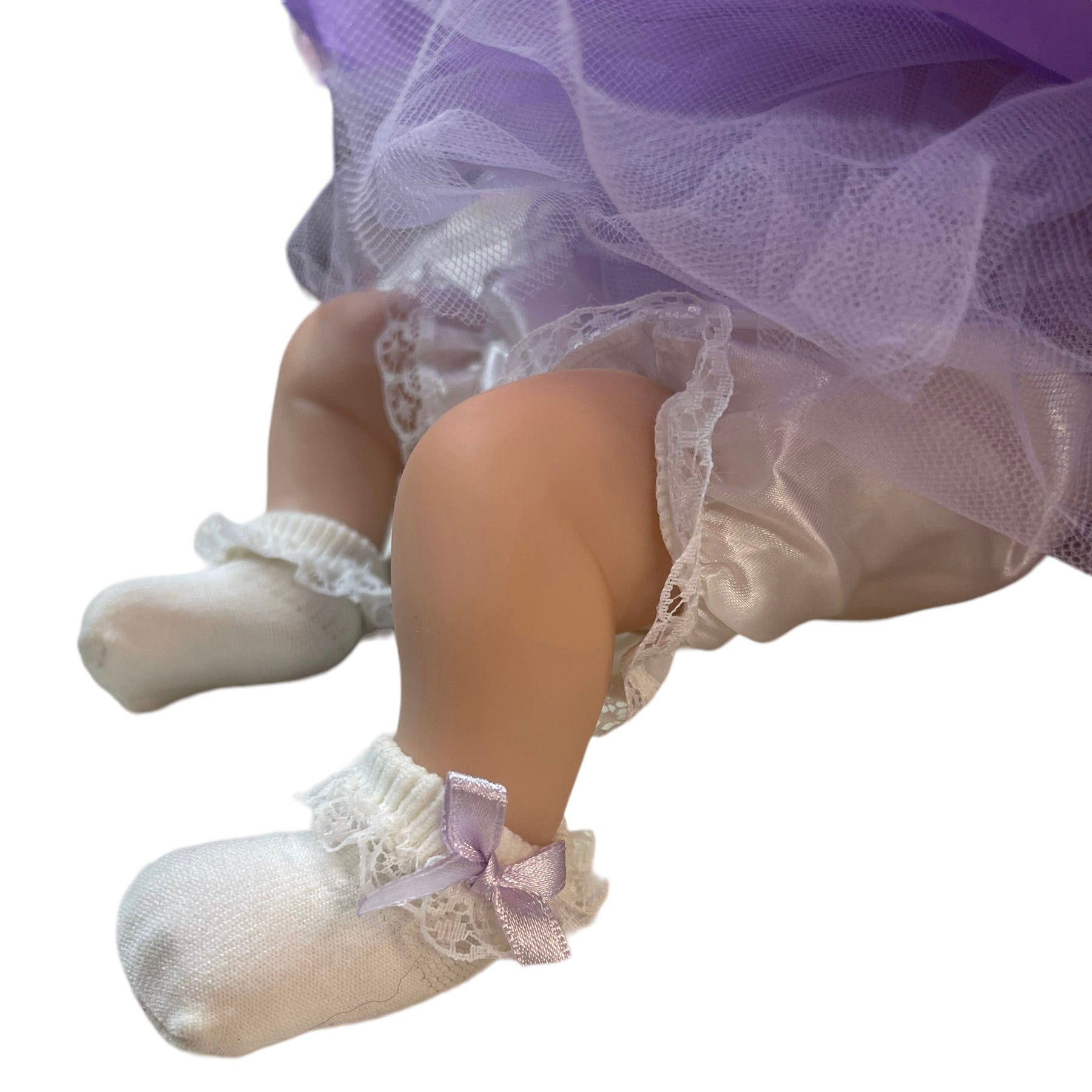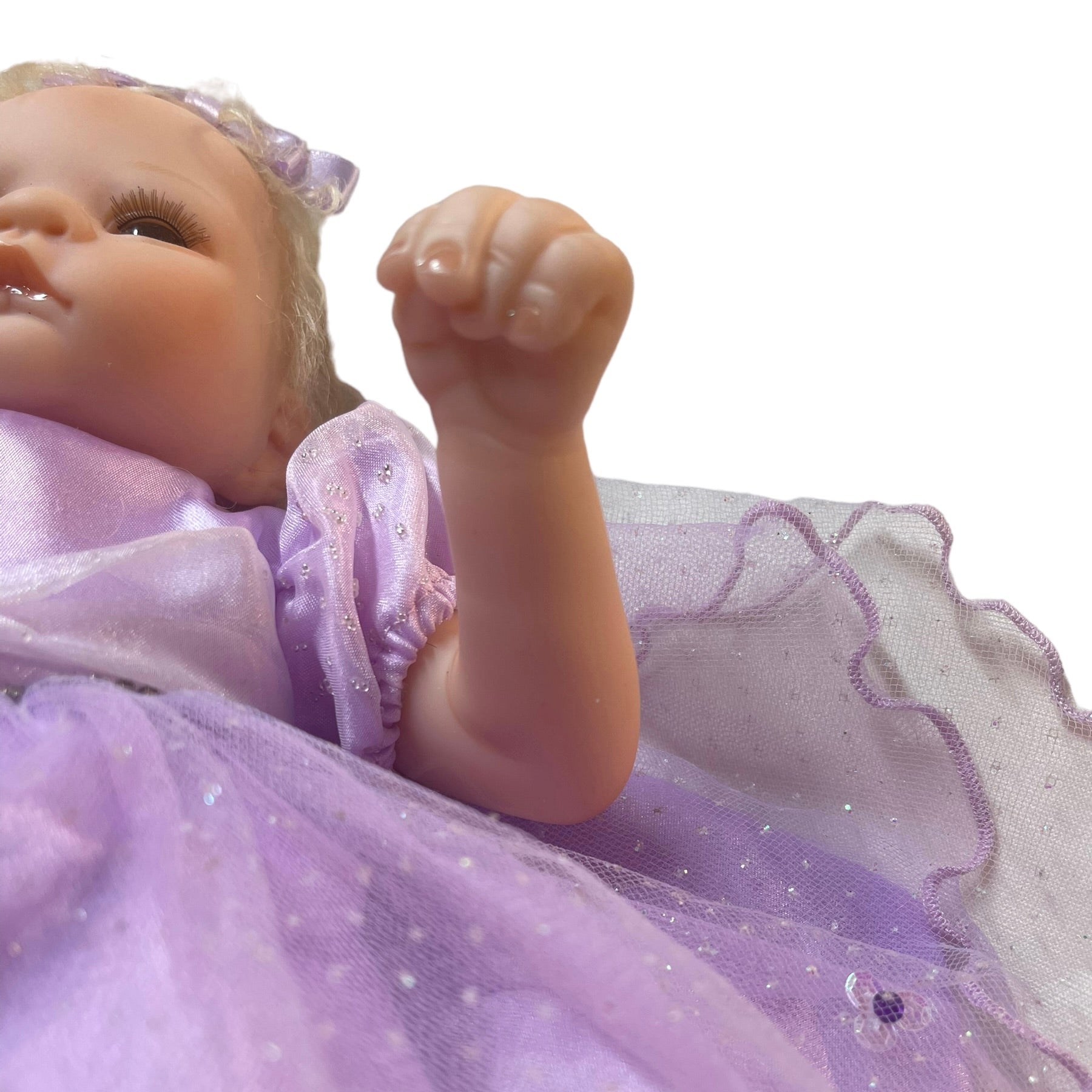 This exquisite Baby Doll is beautifully scented and moulded with dark shiny eyes, lashes and wispy, curly blond hair. Grace is dressed in Lavender satin, tulle and sparkles and has ribbons on her socks and in her hair. This beautiful doll is wearing a silver cross & chain, and her music box plays 'Amazing Grace.' A beautiful baby to play with, or a lovely addition to your collection.