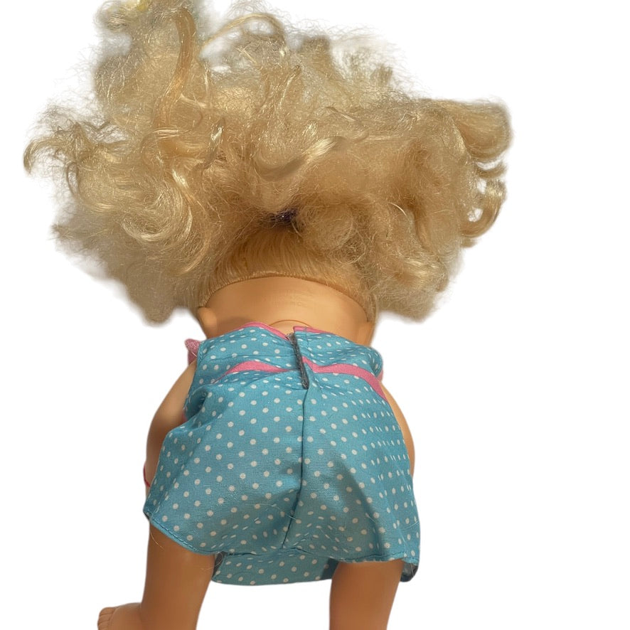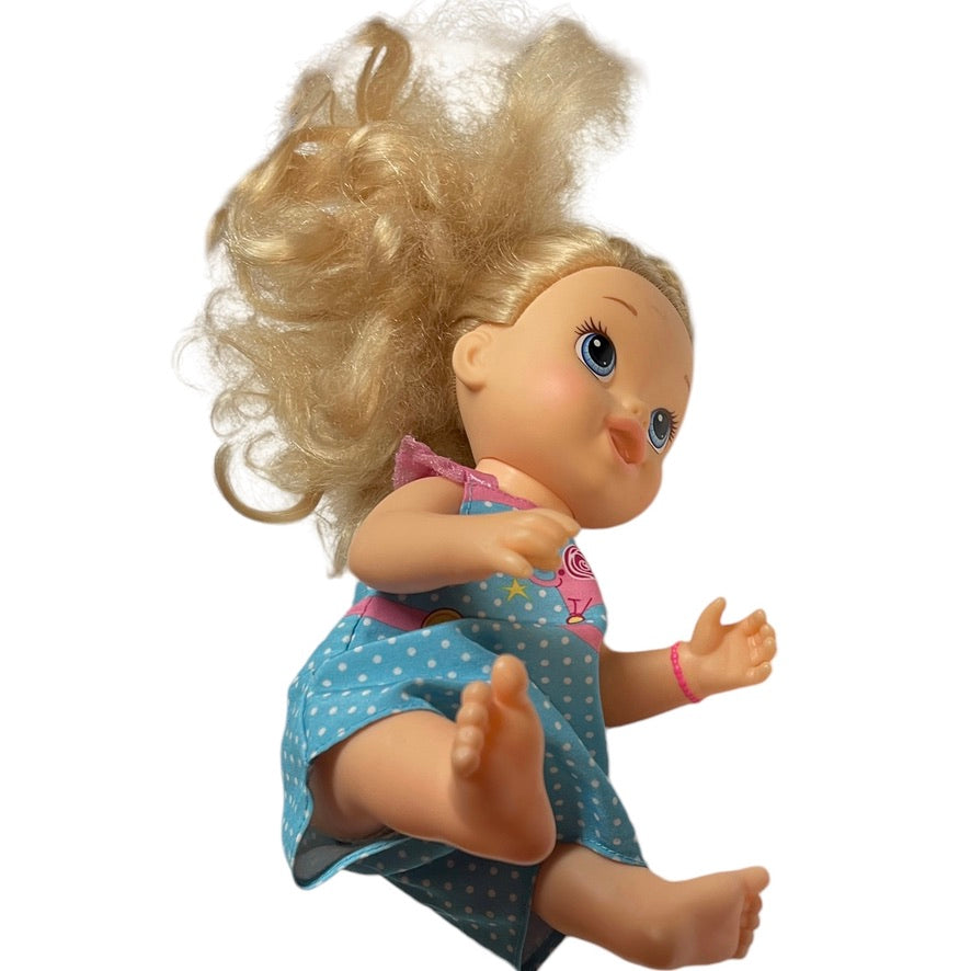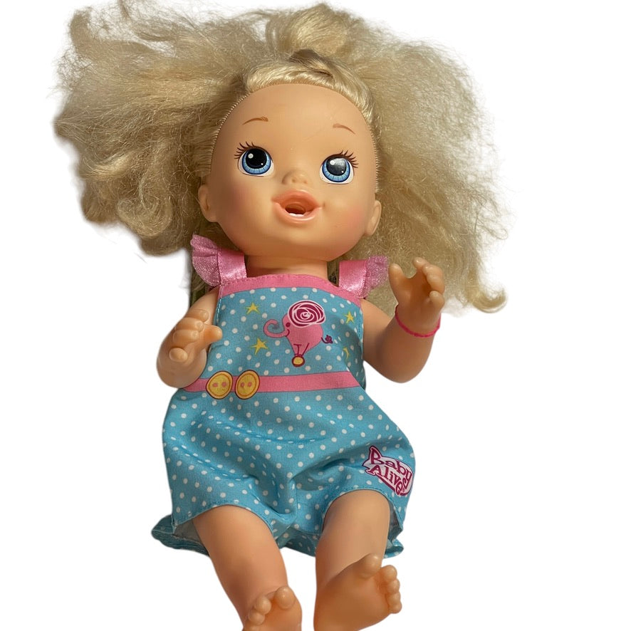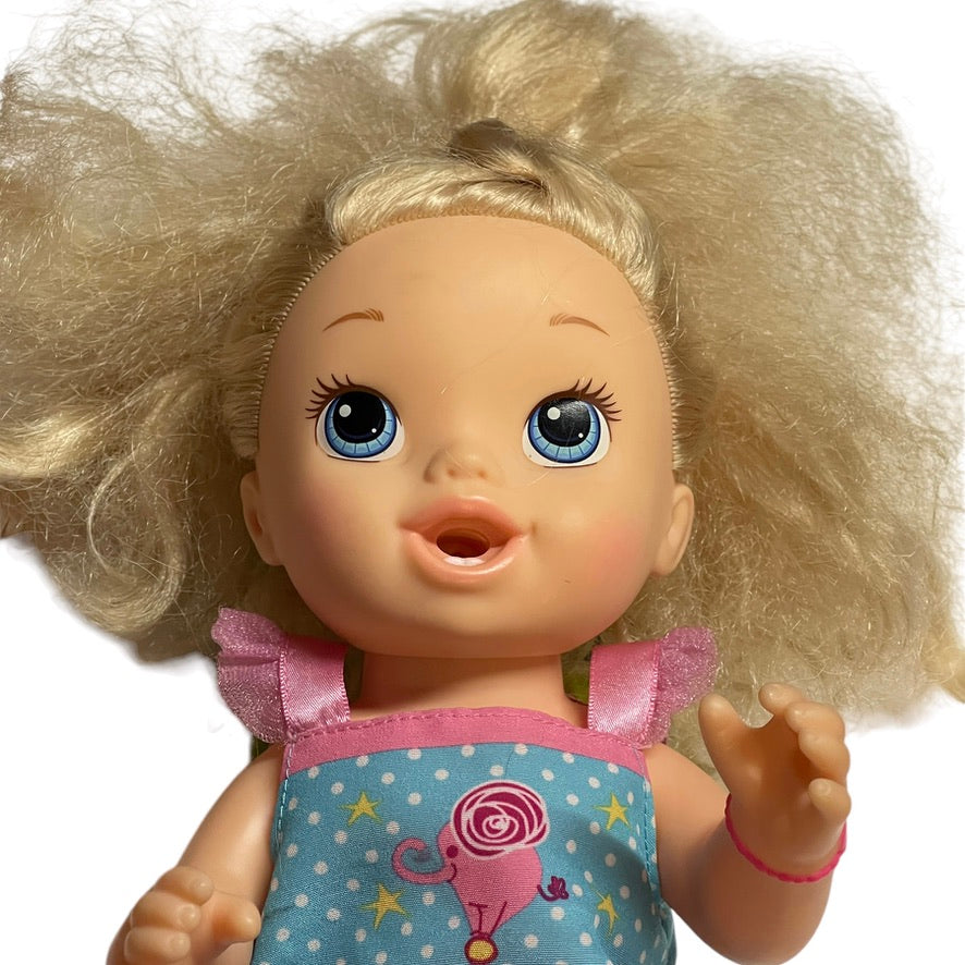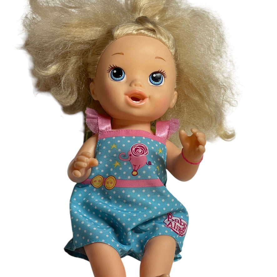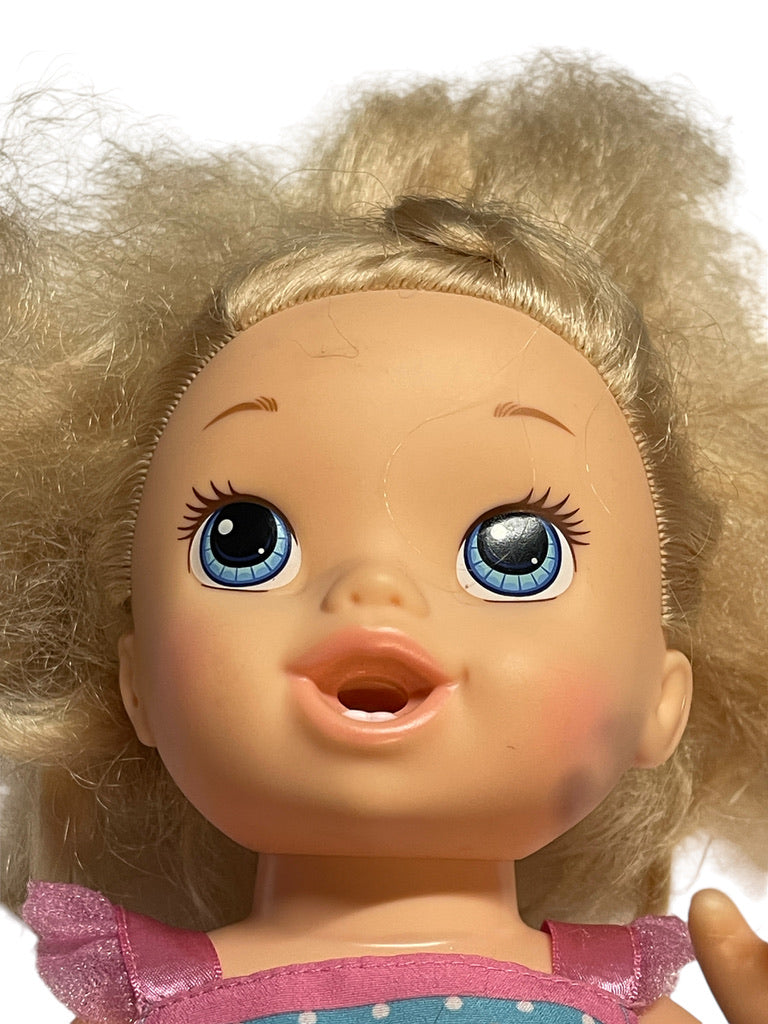 Beautiful 2013 Baby Alive with luxurious long blond hair Just right for styling! This sweet baby drinks from a bottle and wets, just like a real baby! She even has 2 little bottom teeth! Baby is in excellent preowned condition in a branded romper & a heart bracelet on her left wrist. A real treasure!