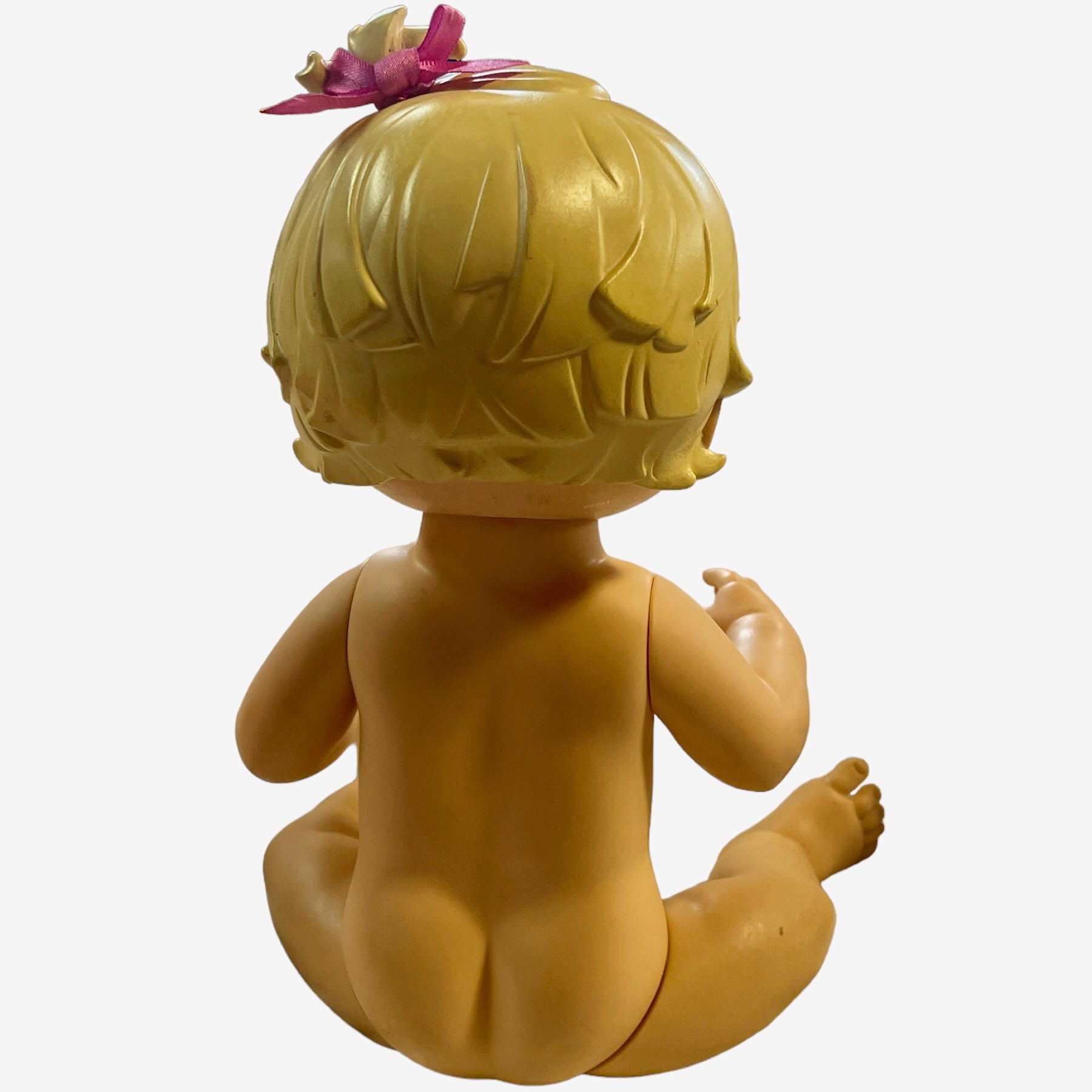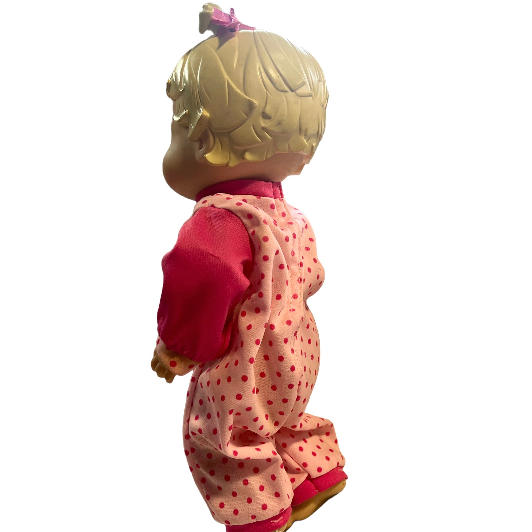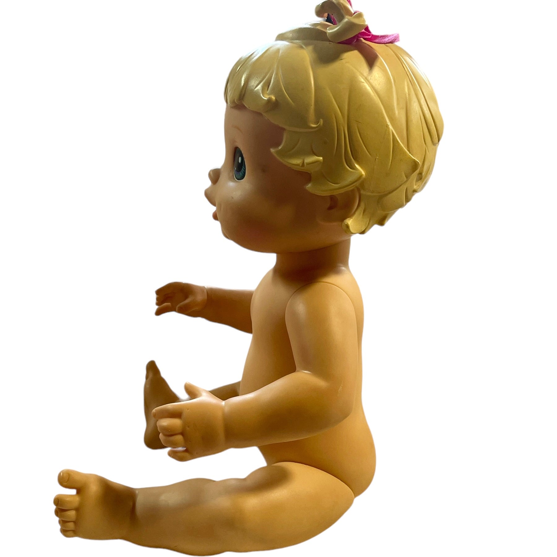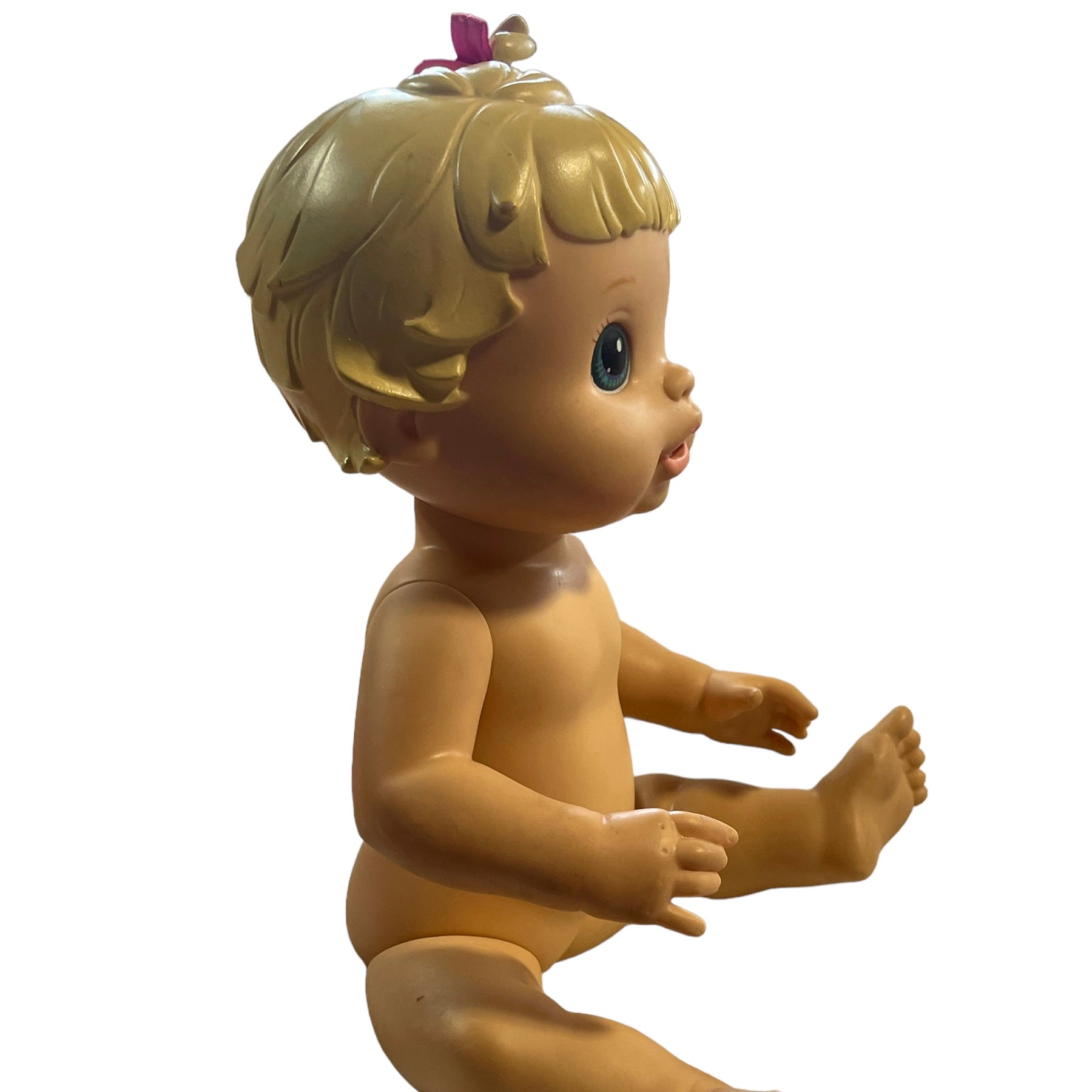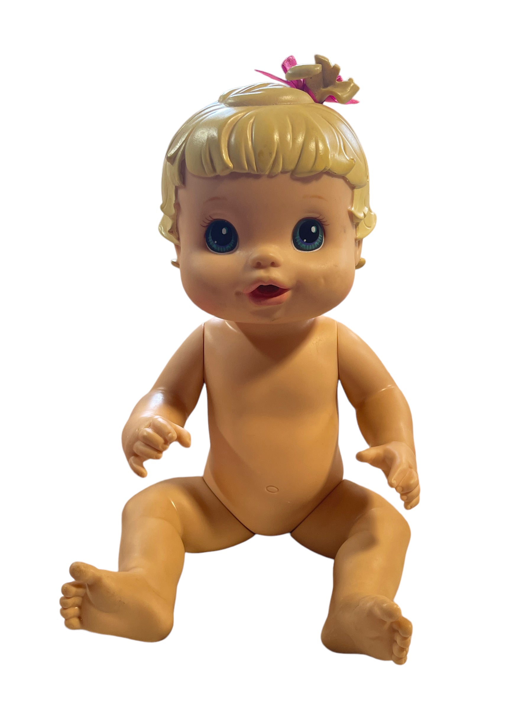 Baby Alive from 2008. This sweet girl is dressed in a cute romper and she still has the original bow in her sculpted blond hair. She drinks and wets and is in excellent preowned condition.