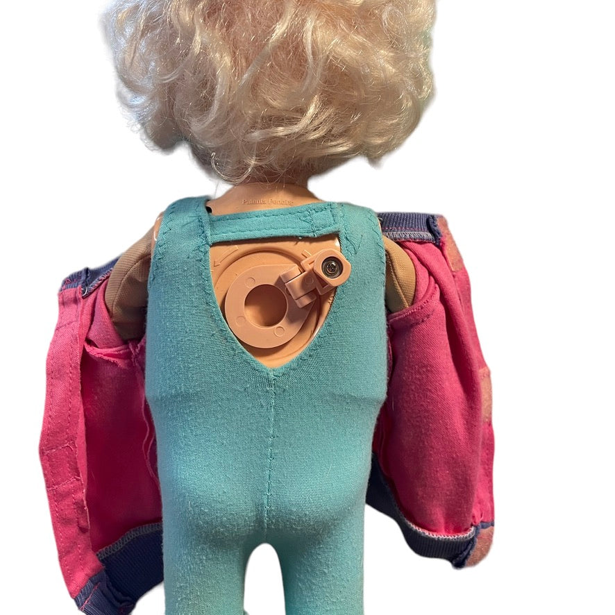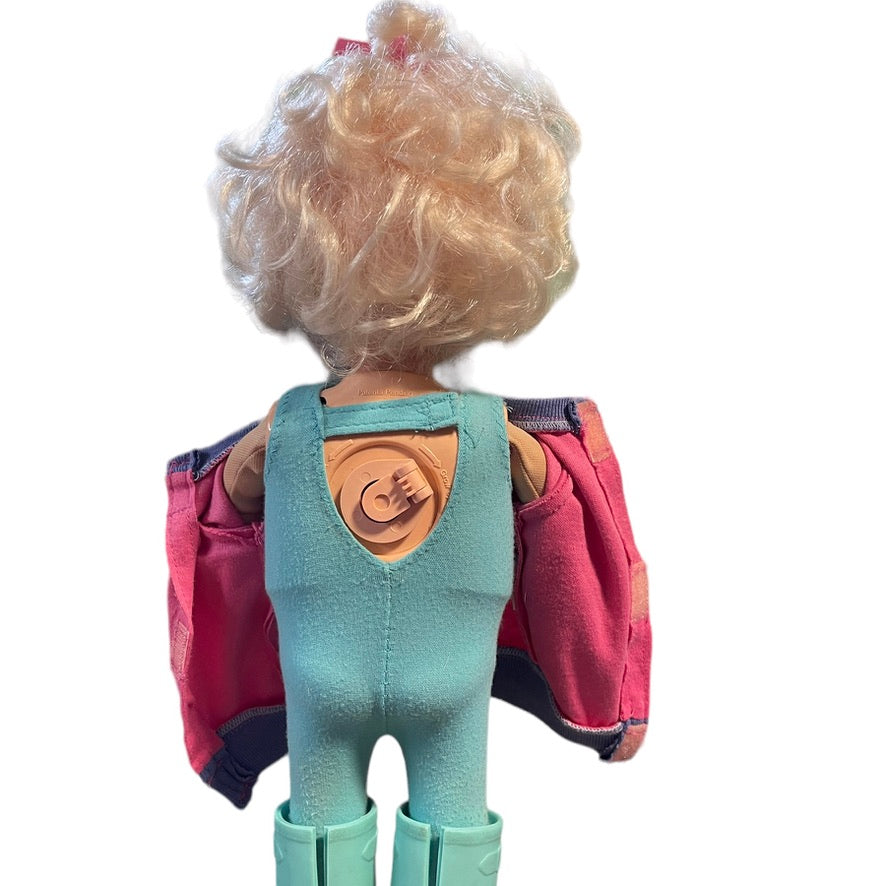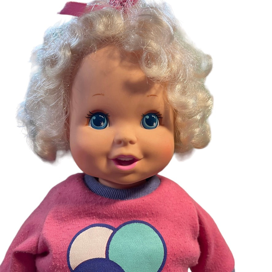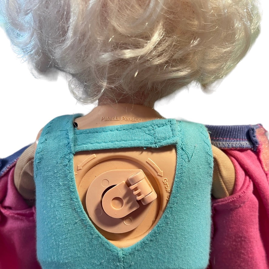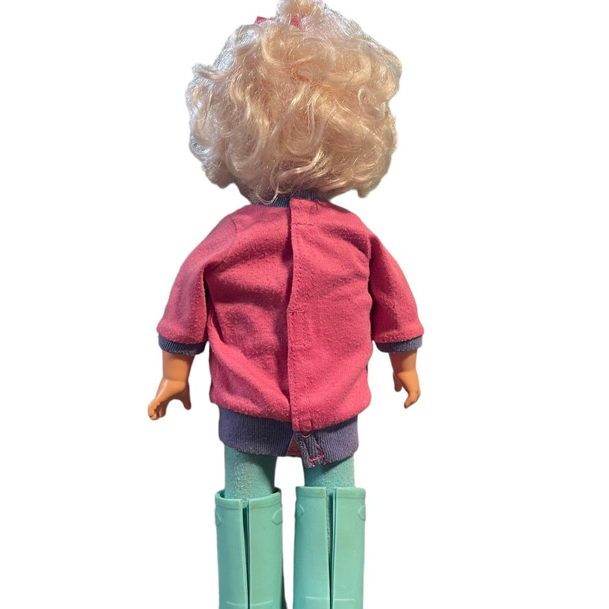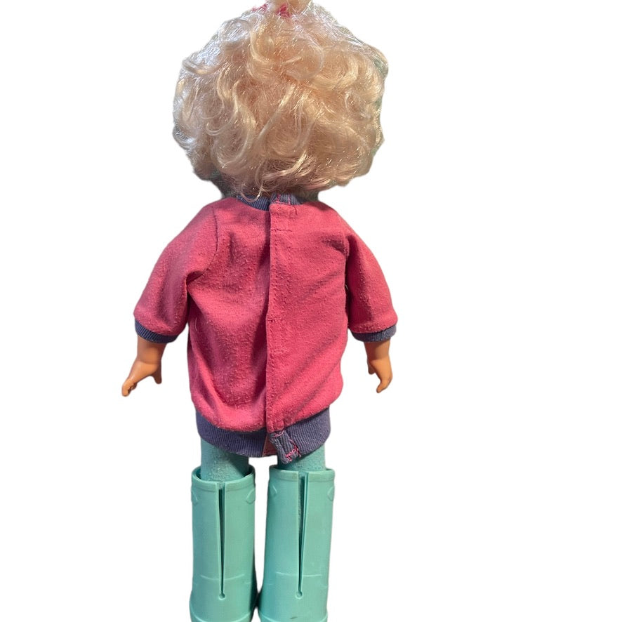Sweet Vintage Playmates Baby Grow Doll in original clothes, sweatshirt. bodysuit and aqua boots (some pilling on sweatshirt) Make her grow by twising control on her back. Great working condition!