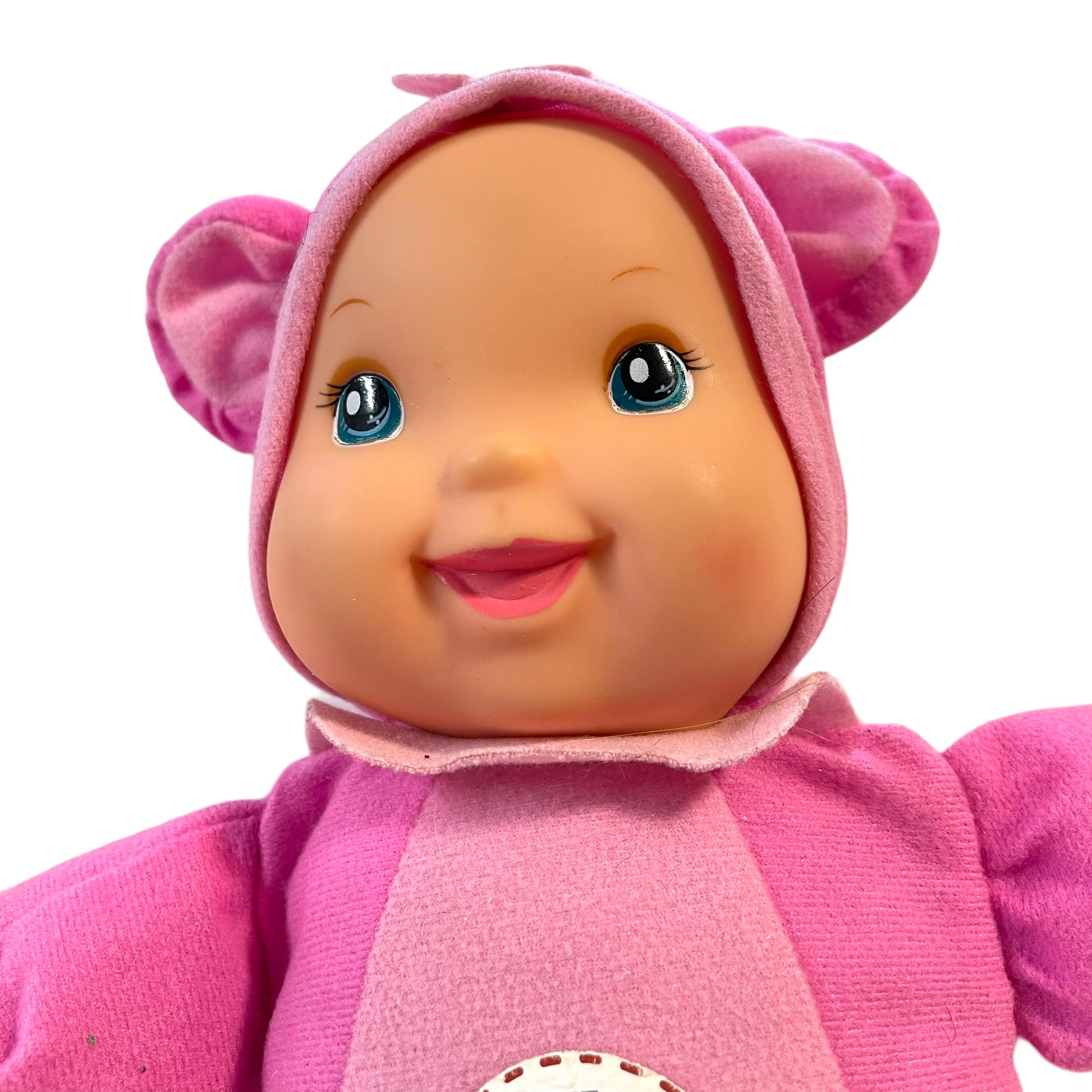 Adorable Baby Doll in Pink Bear Outfit. Preowned . Pretty painted vinyl face. Crinkle and Squeek arms. Perfect size for little hands! Non working voice.