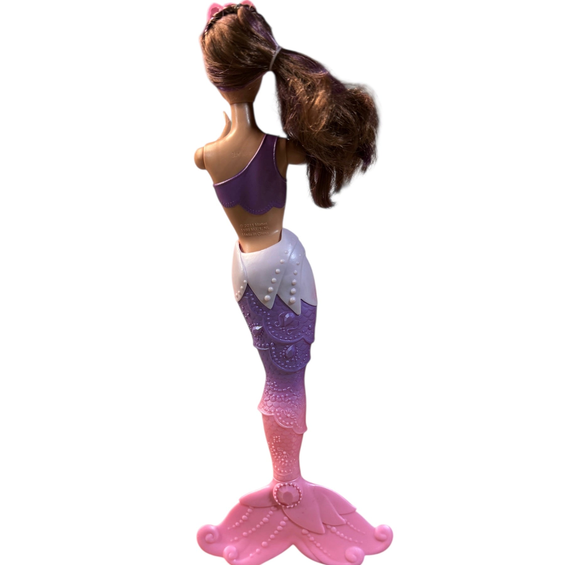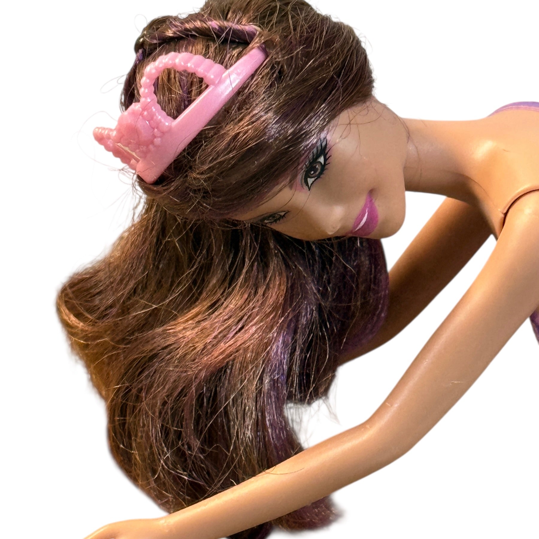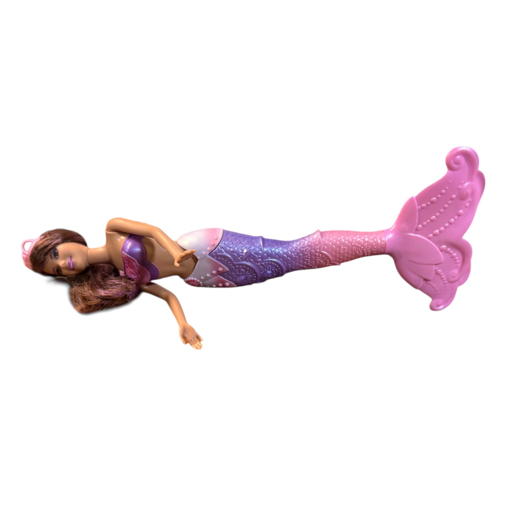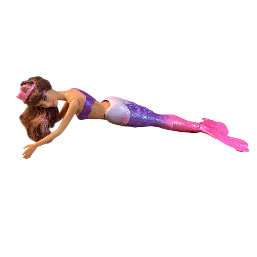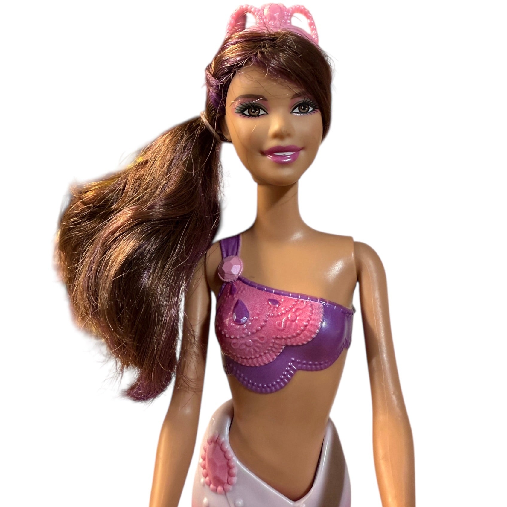 Beautiful preowned Barbie Dreamtopia Mermaid Doll in pink and lavender fins, swimsuit and pink tiara. She has beautifully detailed fins and brunette hair streaked with purple. In very good preowned condition. A lovely addition to your Barbie collection.
