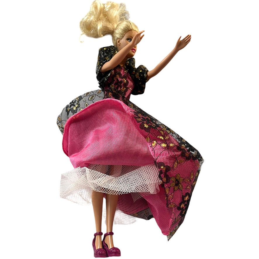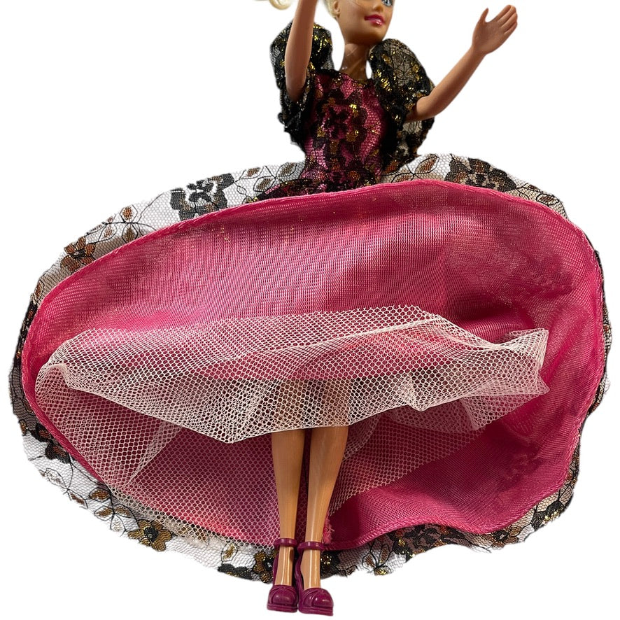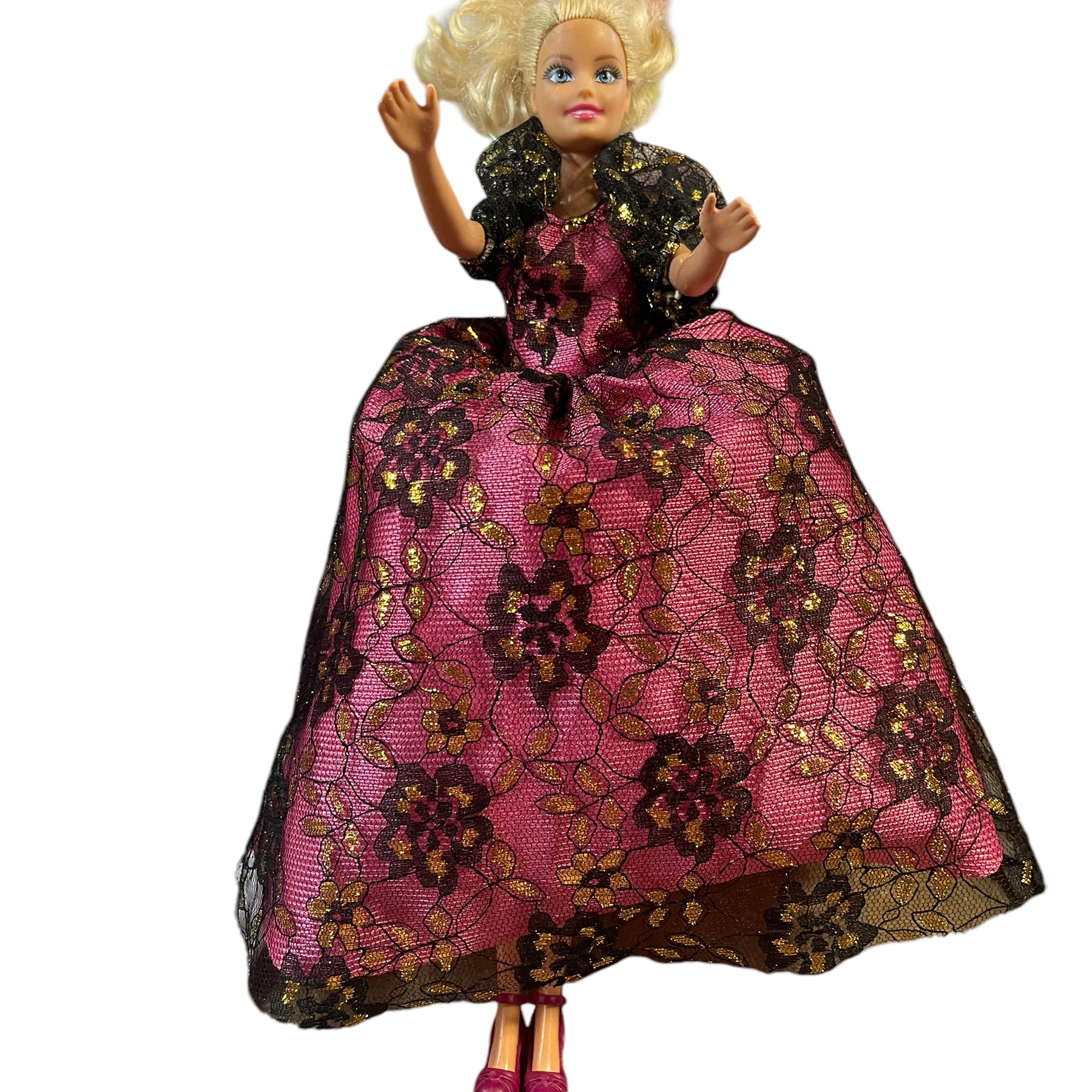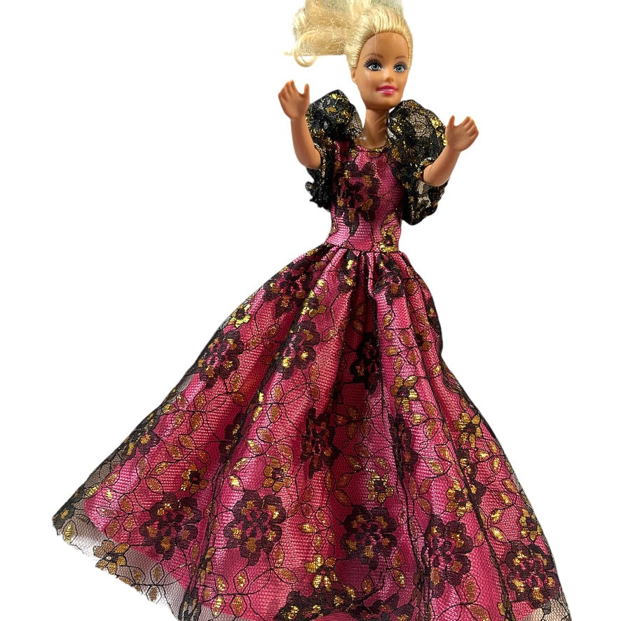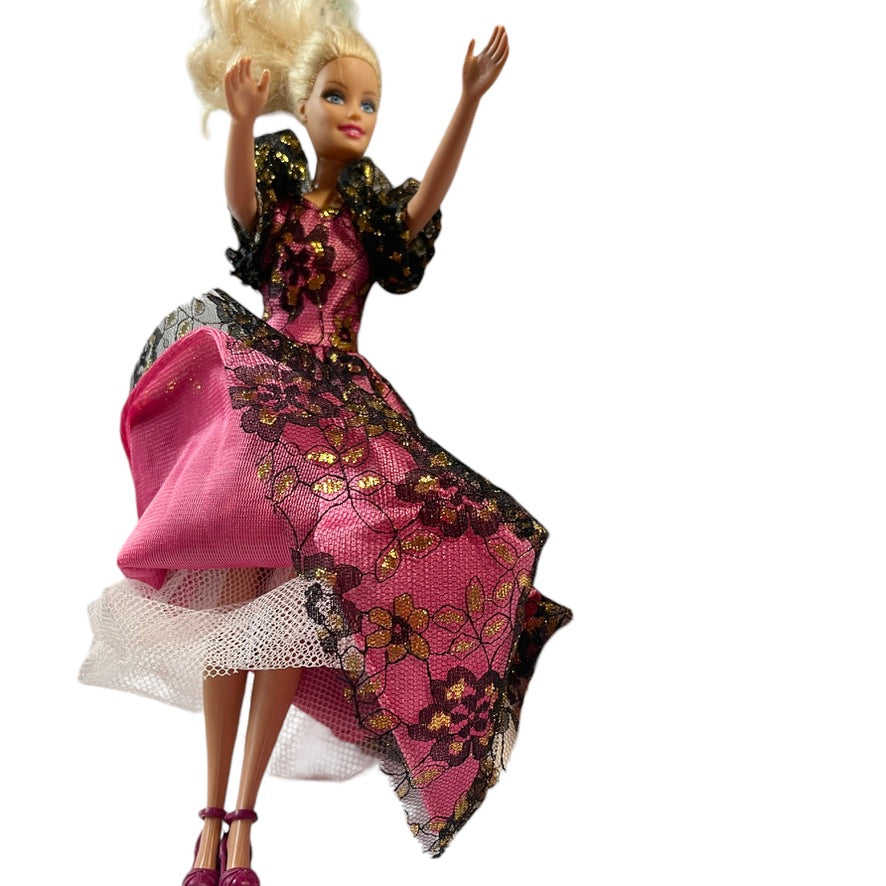 A really beautiful Mattel Barbie Doll dressed i a lovely deep pink dress with black and gold lace overlay, featuring oversize black and gold lace puffed sleeves. Barbie is also wearing coordinating high heel ankle strap sandals. She bends at the waist and is in excellent preowned collection. A real treasure for your collection!