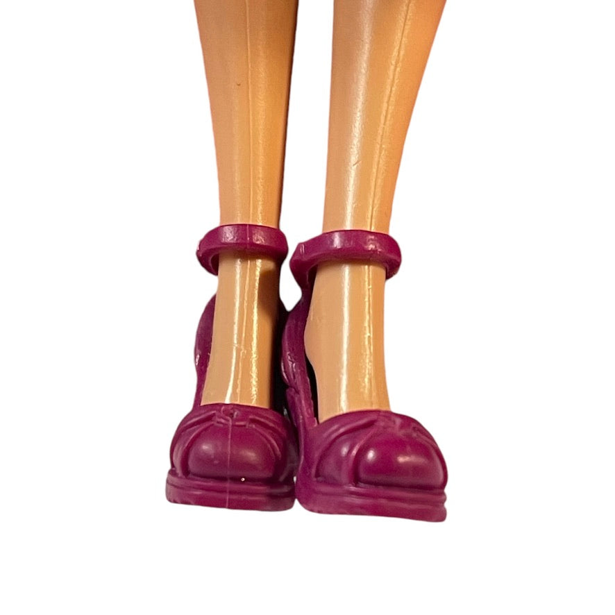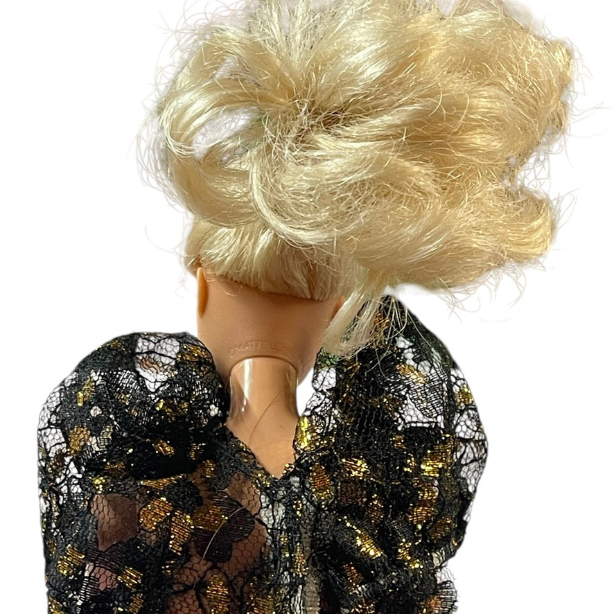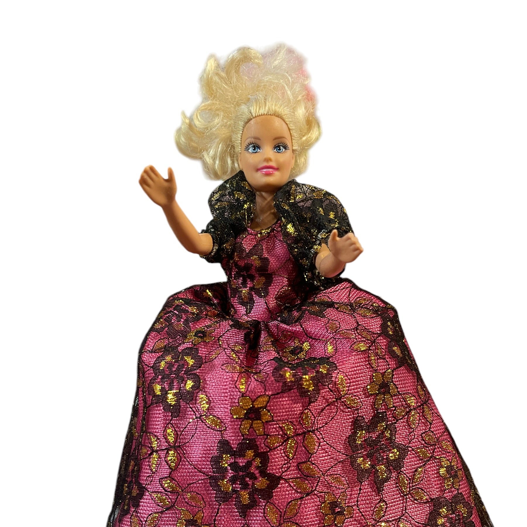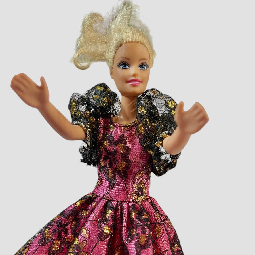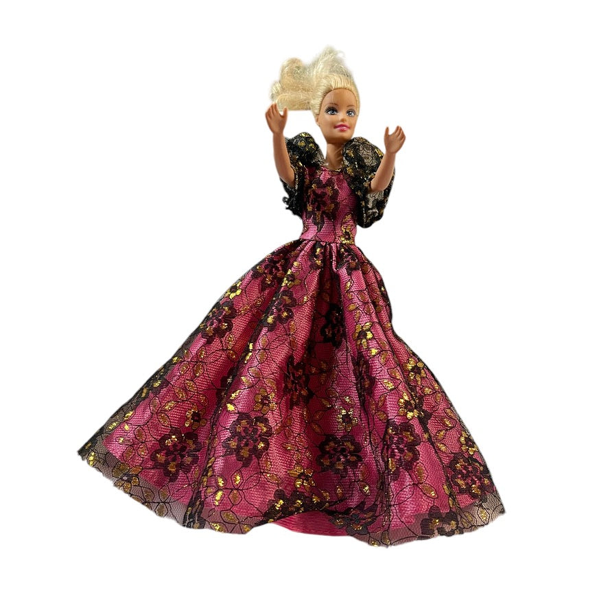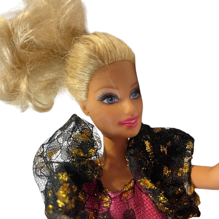 A really beautiful Mattel Barbie Doll dressed i a lovely deep pink dress with black and gold lace overlay, featuring oversize black and gold lace puffed sleeves. Barbie is also wearing coordinating high heel ankle strap sandals. She bends at the waist and is in excellent preowned collection. A real treasure for your collection!