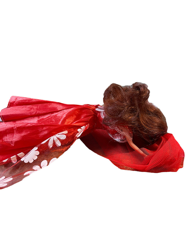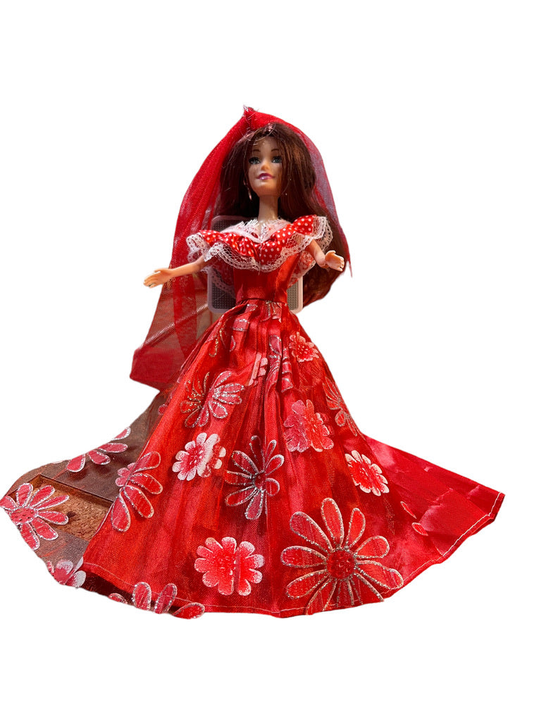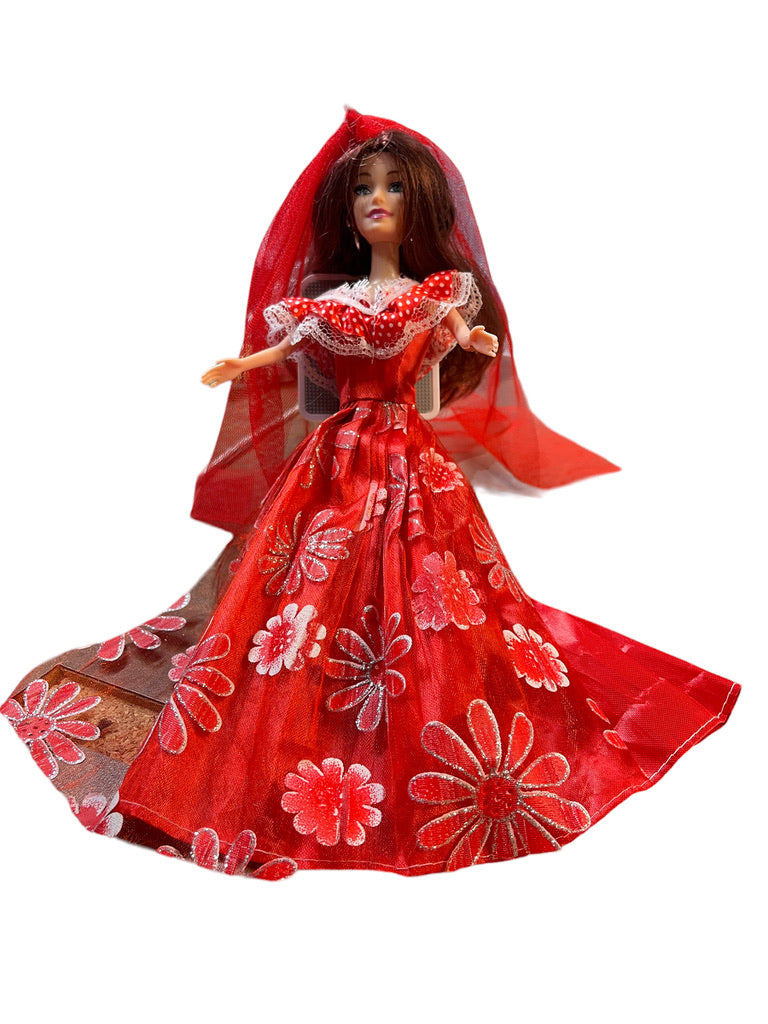 Beautiful Brunette Fashion Doll in Red Floral Sparkle Dress,Tulle Veil &Hoop Earrings