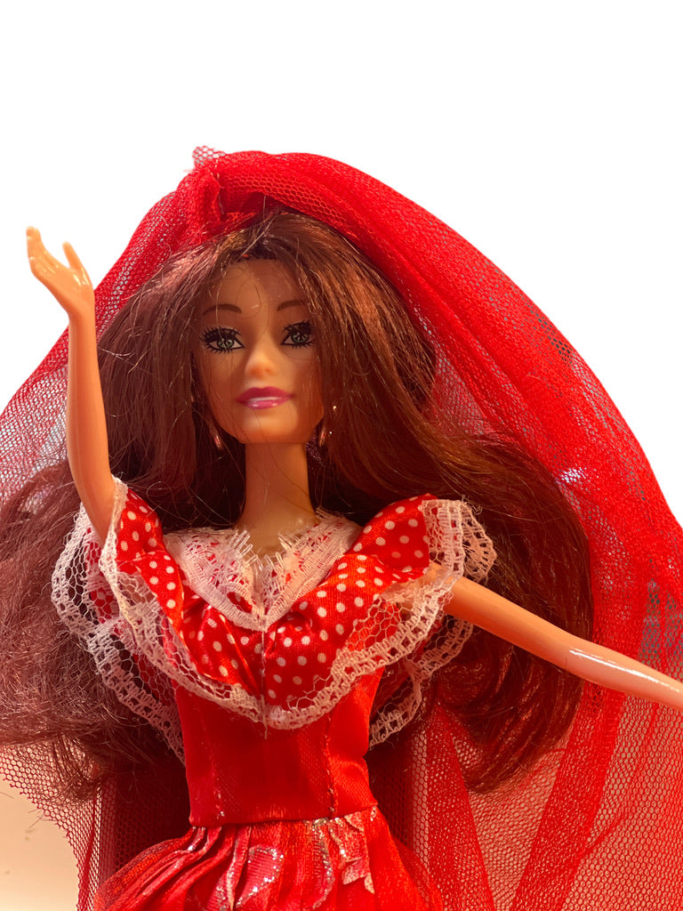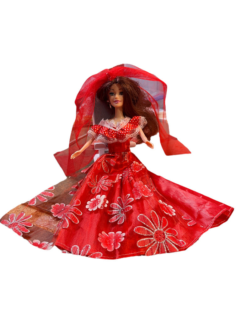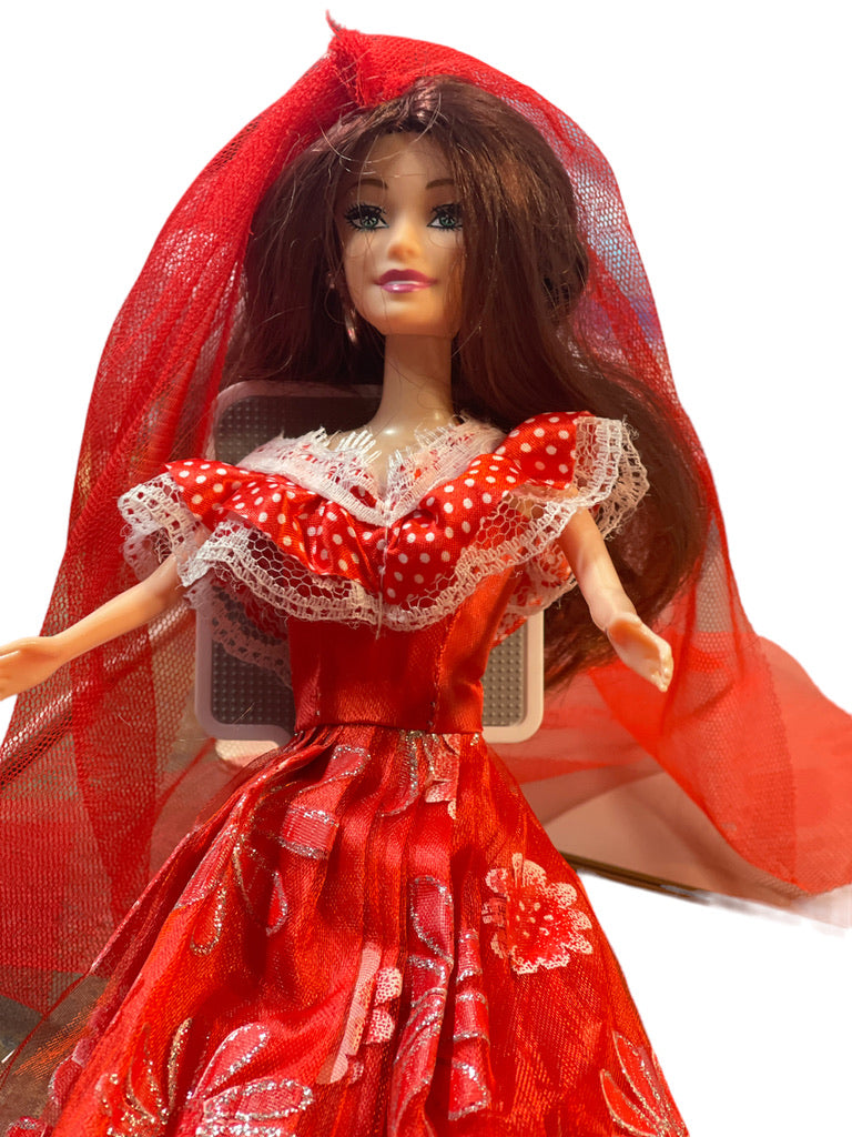 Beautiful Fashion Doll with long brunette hair covered with a red tulle veil. Her beautiful sparkly dress is accented with silver hoop earrings and pink shoes. She is in lovely preowned collection.