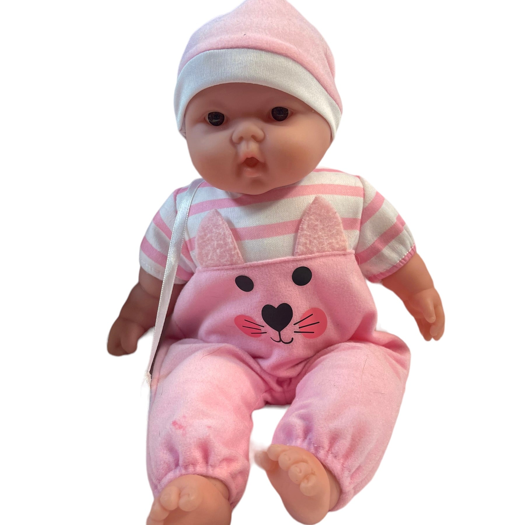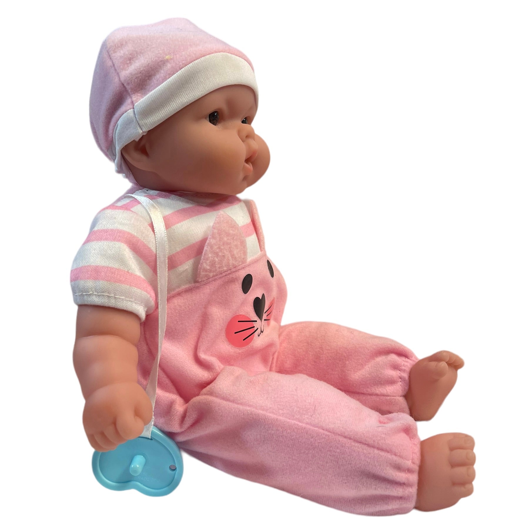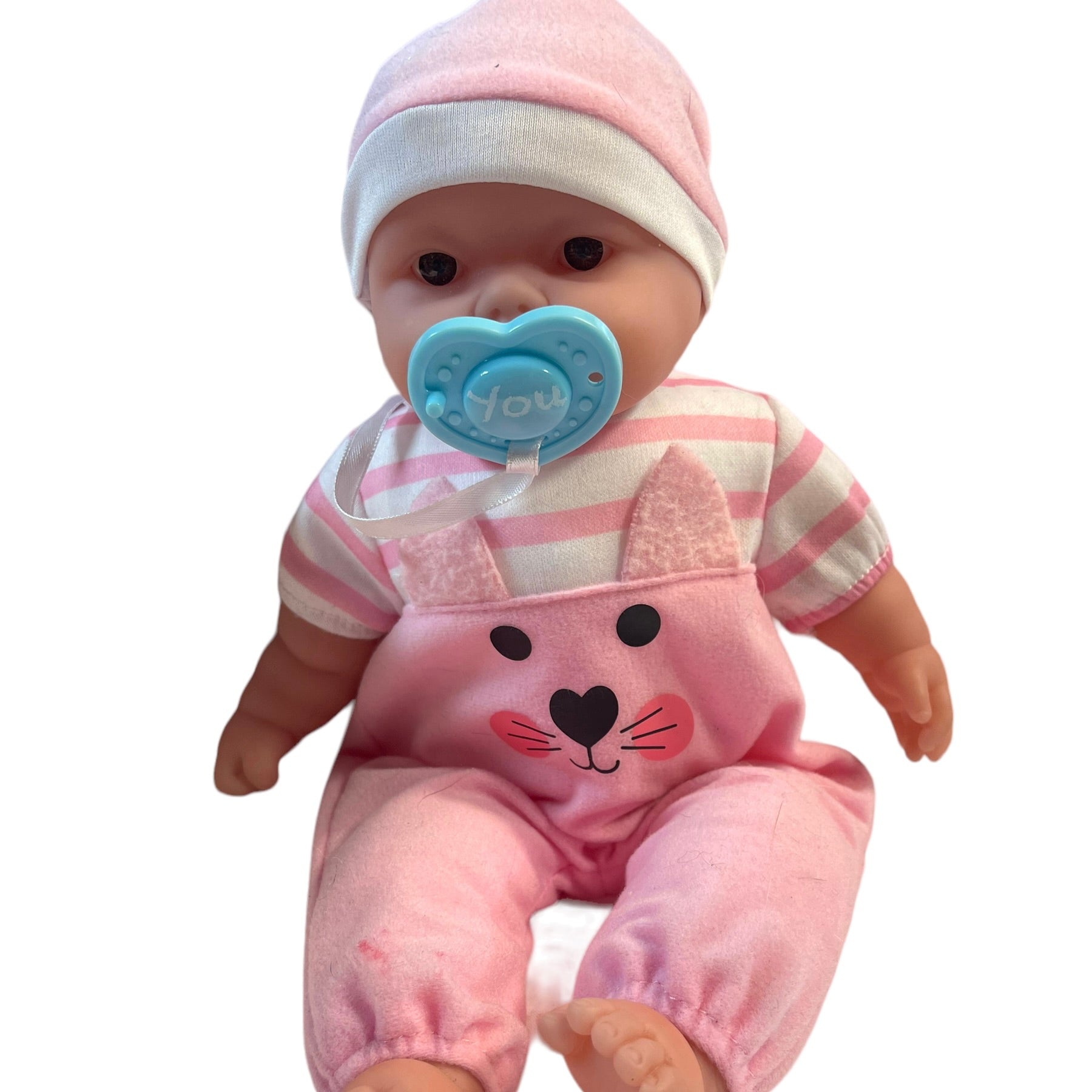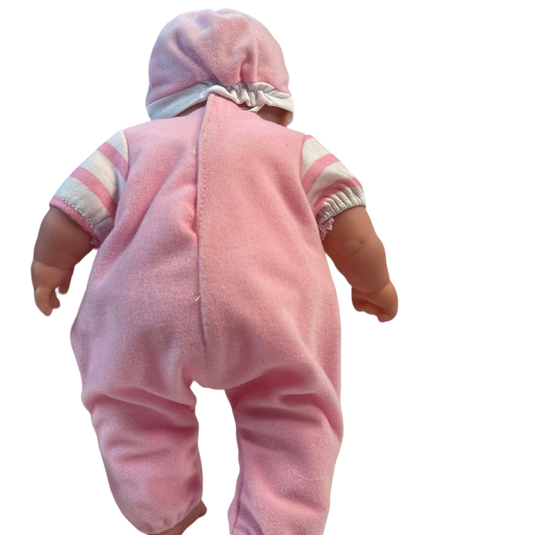 Adorable baby in a sweet pink outfit complete with cap & soother is ready to go to her new family. Vinyl with cuddly cloth body. Excellent preowned condition.