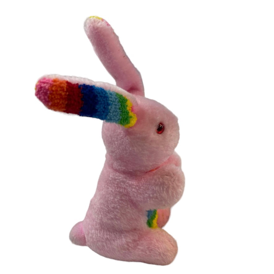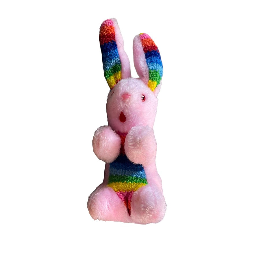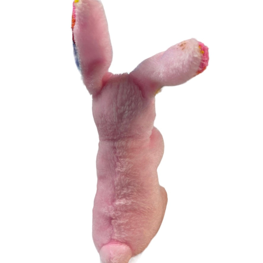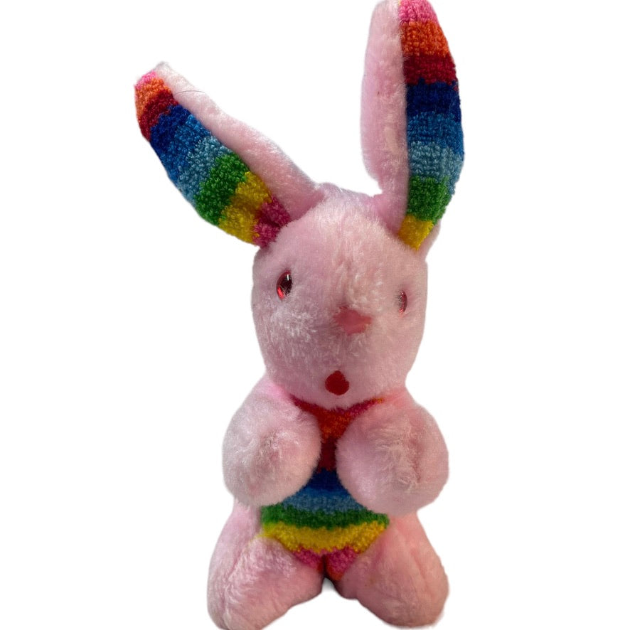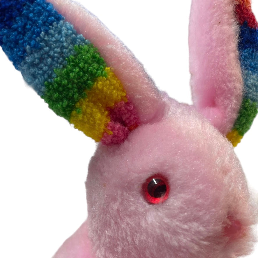 Adorable, vintage made in Taiwan Rainbow Bunny with Terrycloth ears and tummy, Bright Pink Glass Eyes. Very good preowned condition.
