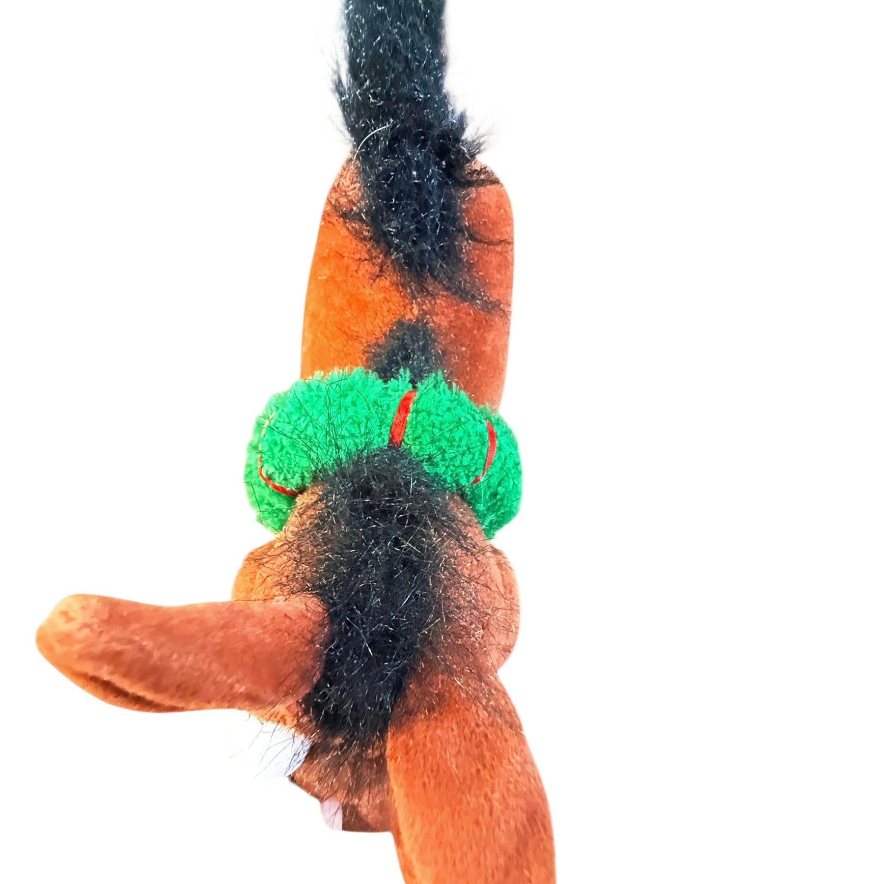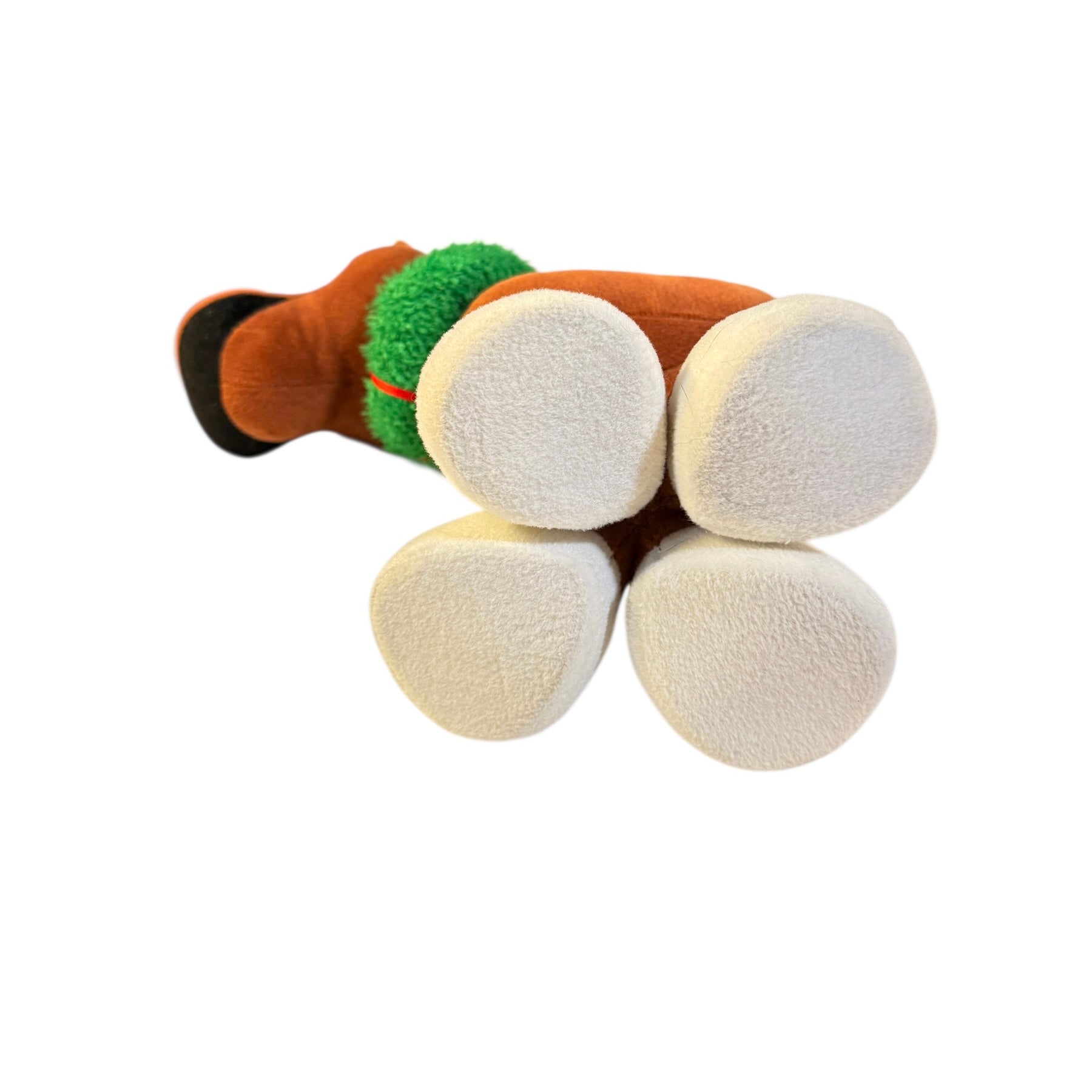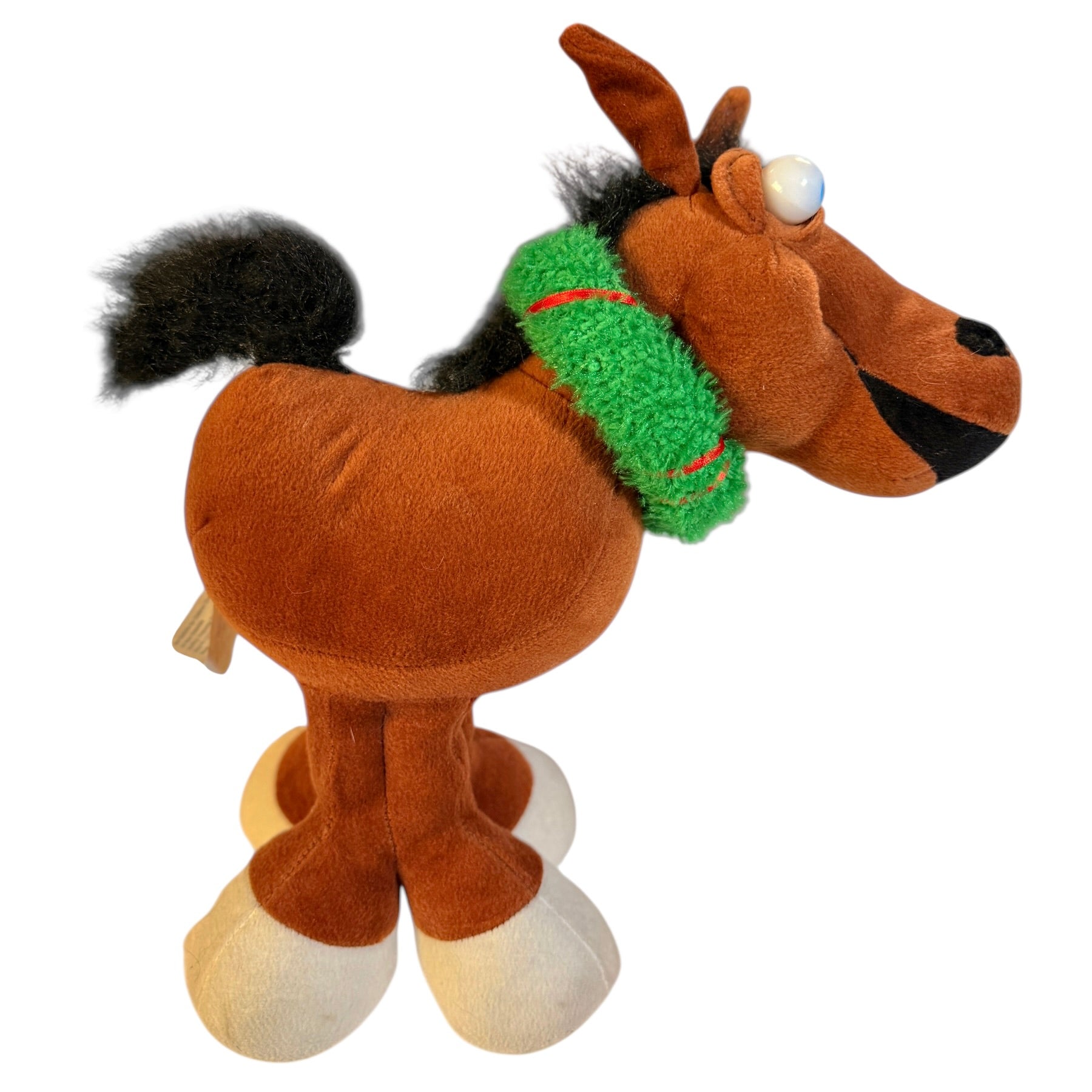 Adorable Horse from the Beverly Hills Teddy Bear Company wearing a jaunty green Christmas wreath that plays a medley of Christmas Carols while flashing little red lights. Very cute! In good, working, preowned condition.