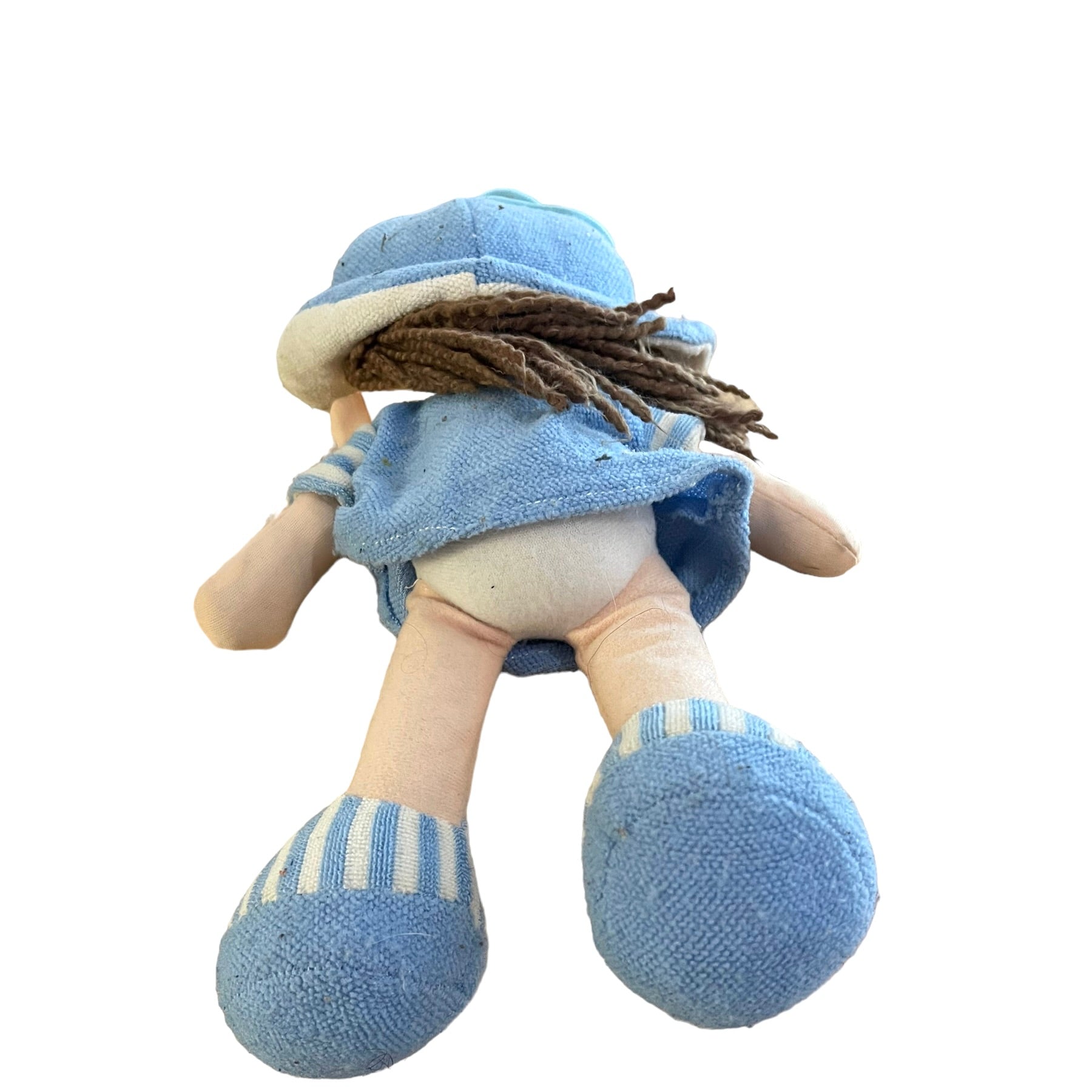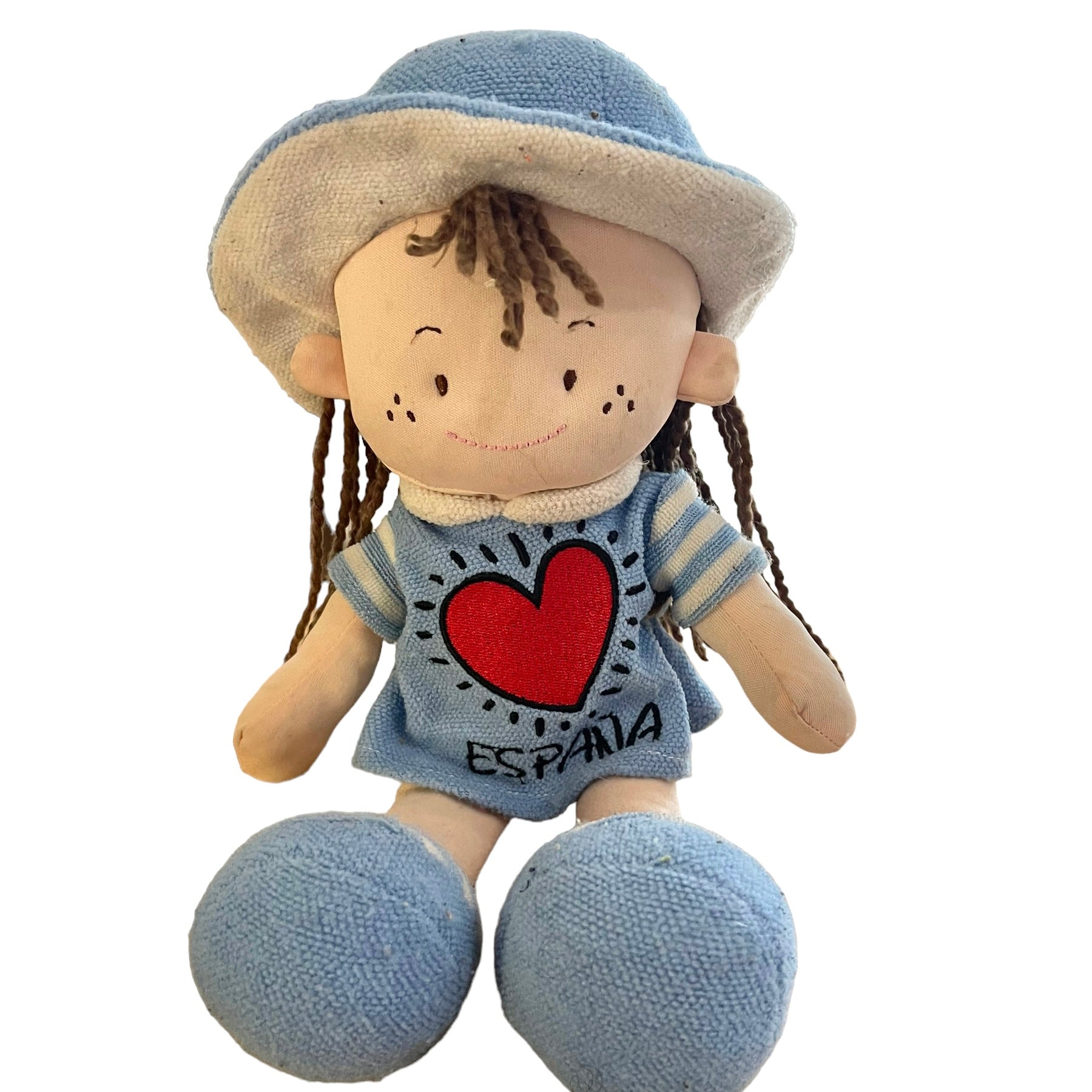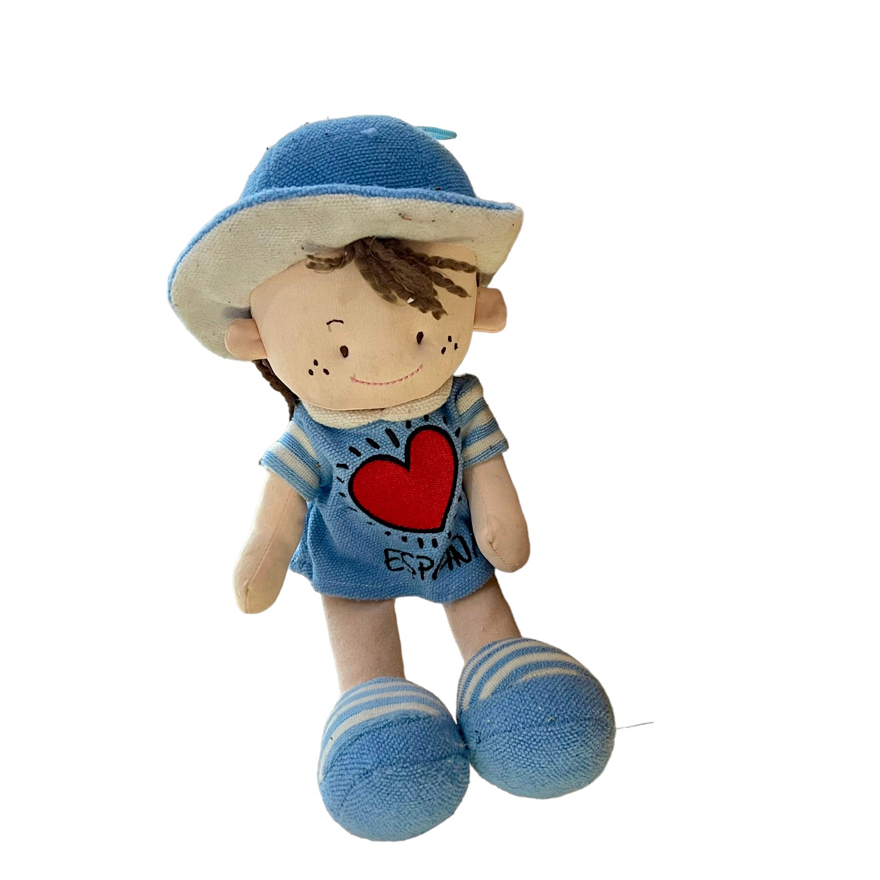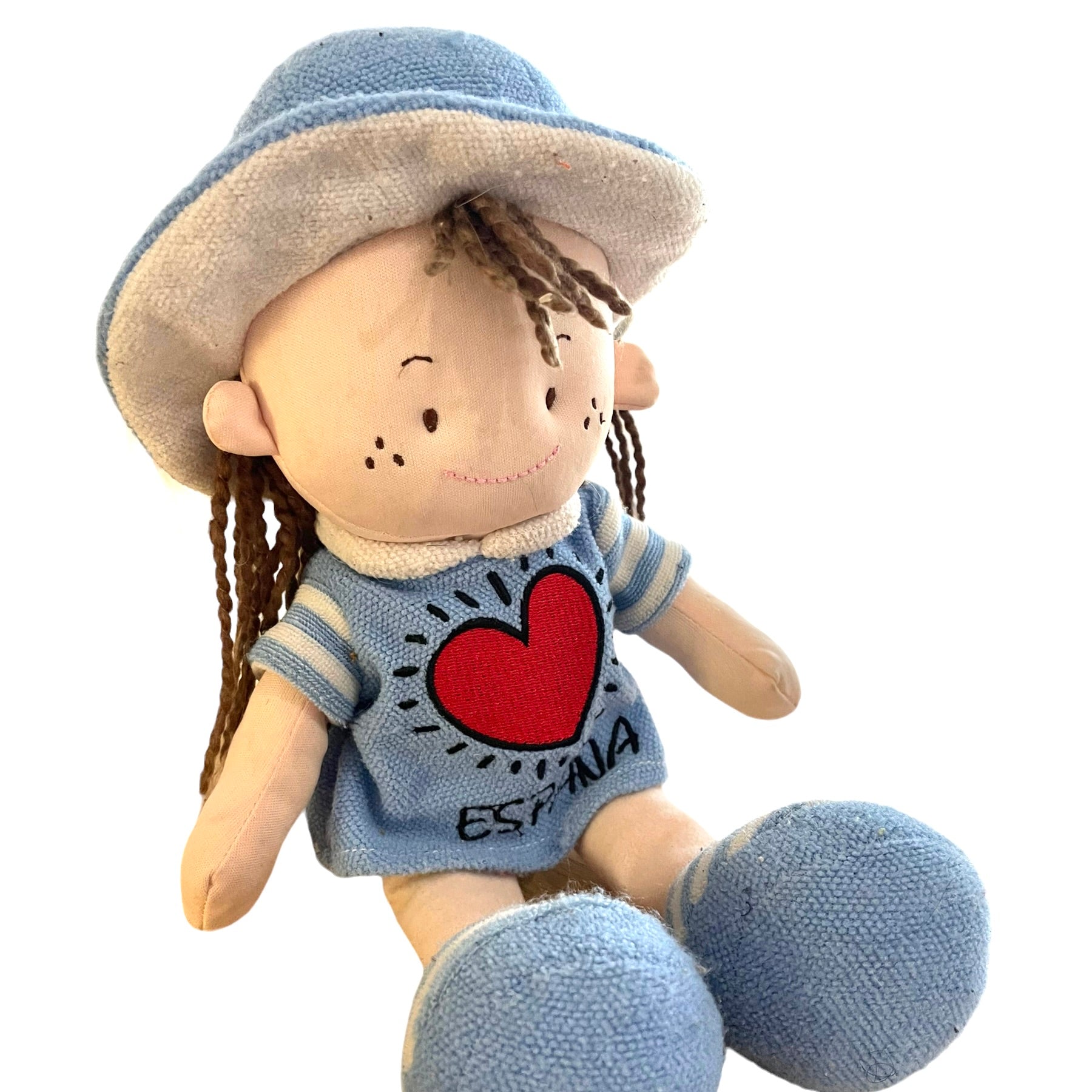12" Cloth Doll all dressed in blue with Embroidered Freckled Face and Crimped Wool hair. Red Heart with 'Espana' embroidered on her tunic. A very sweet dolly. Outfit does have some pilling.
