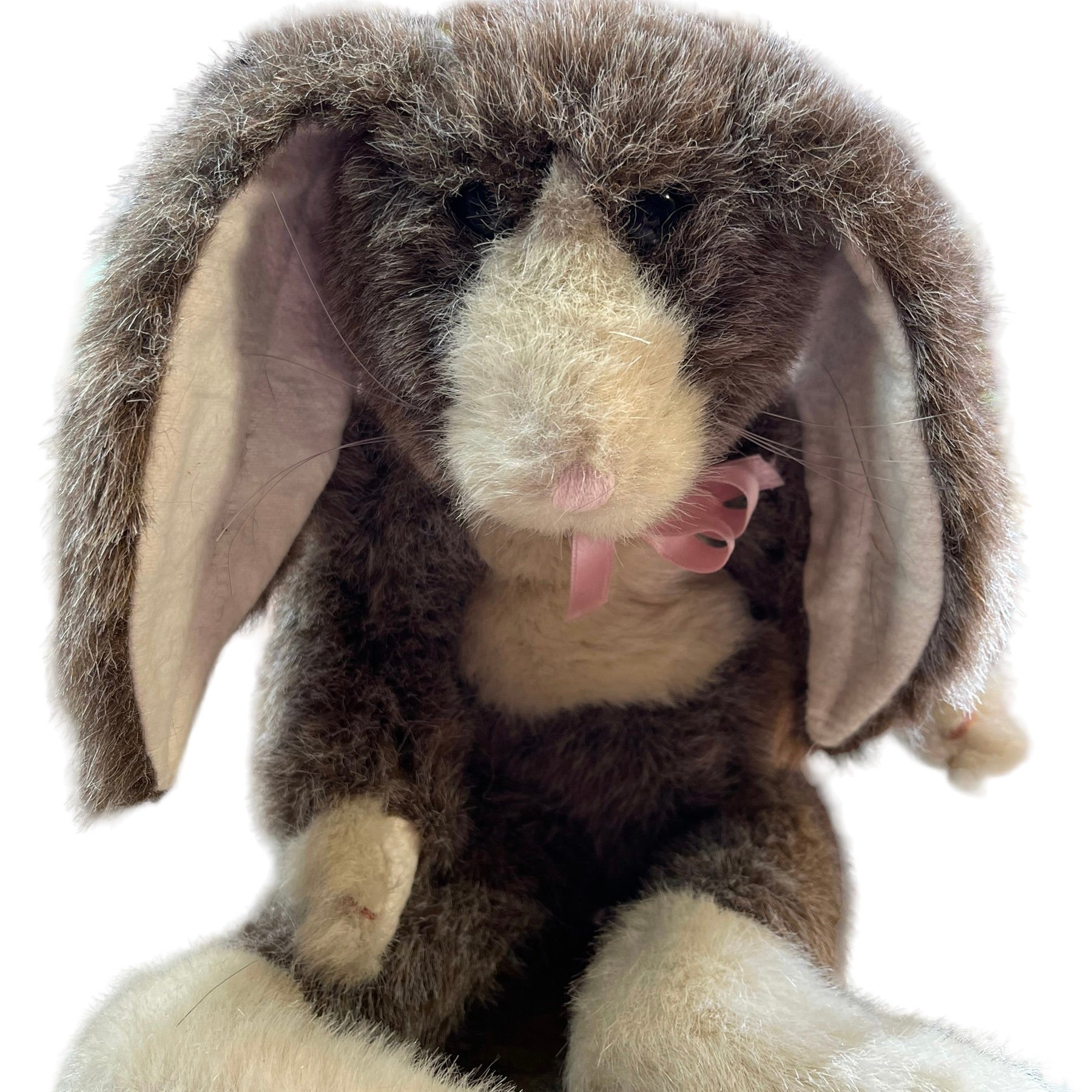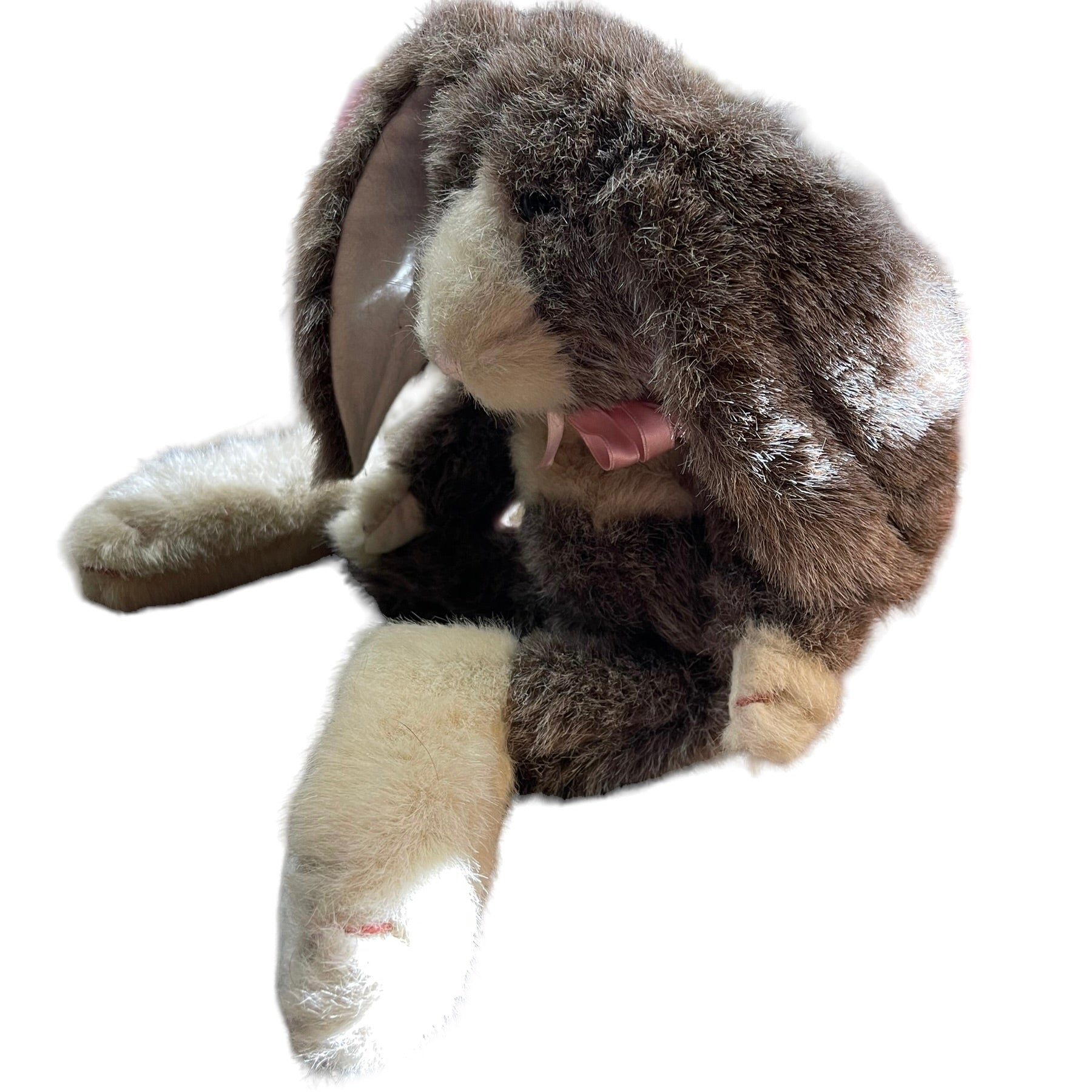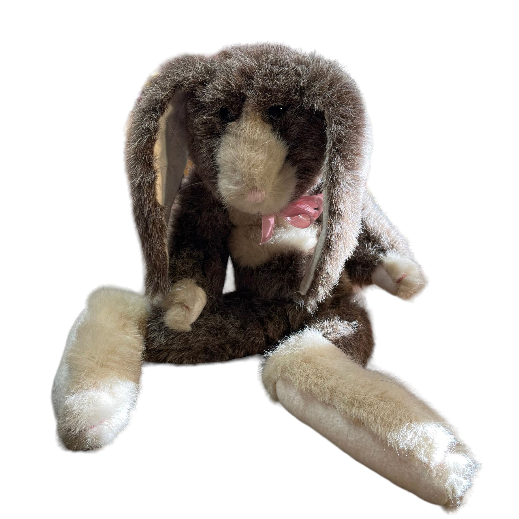 This adorable long eared bunny is heavily weighted and has jointed legs and extra long, heavily stuffed feet. This one is a treasure. Pink bow around it's neck. White tag, hard to find.