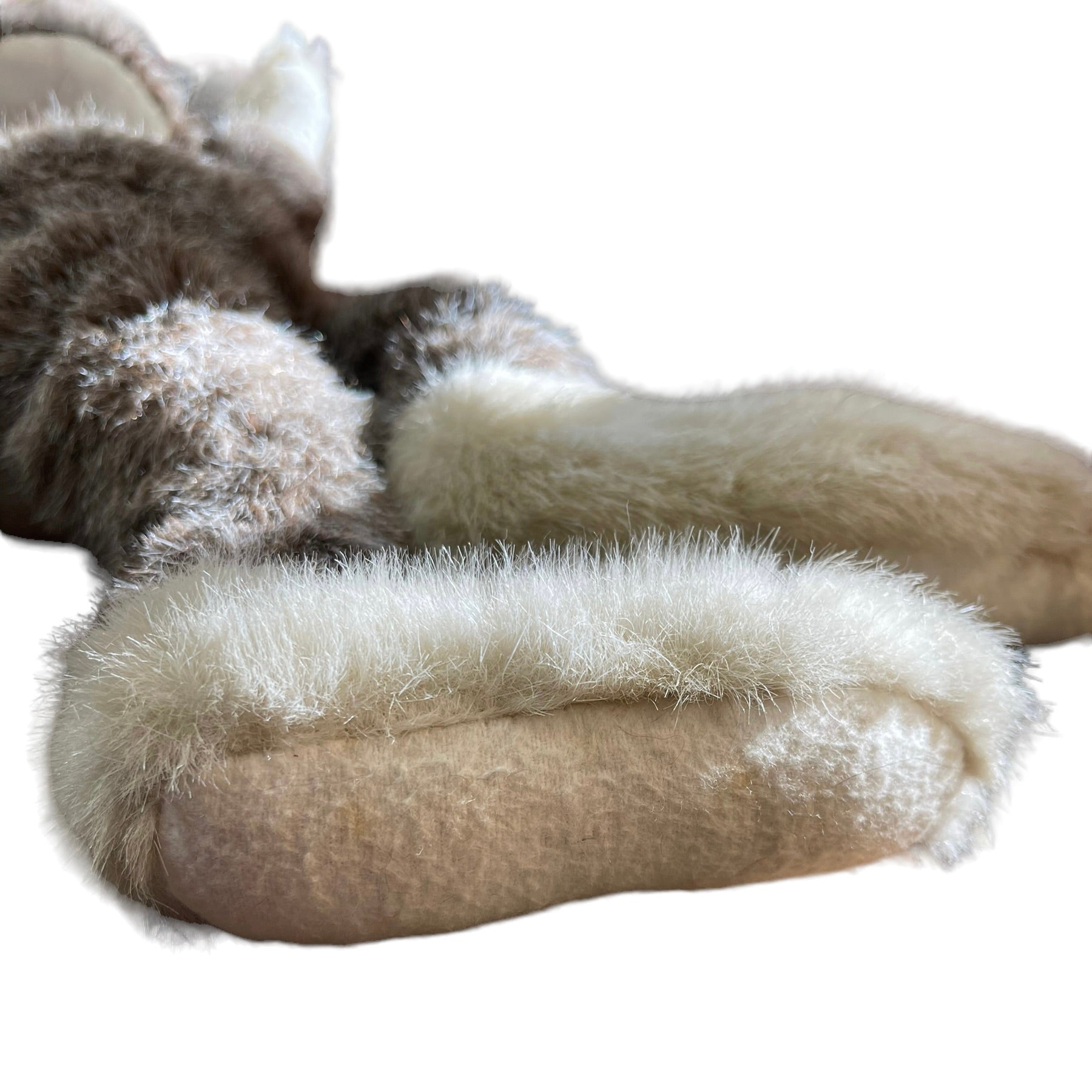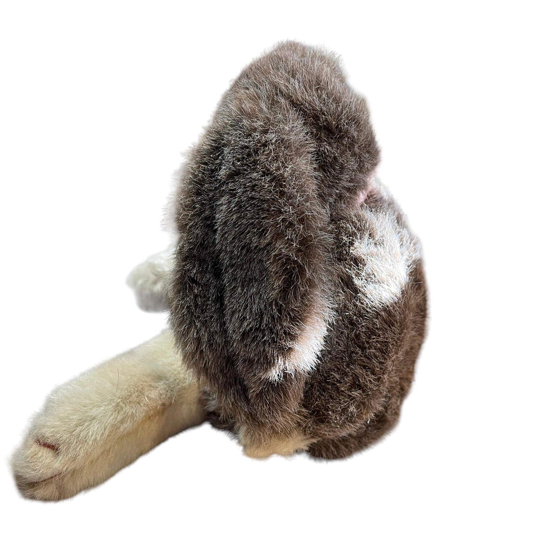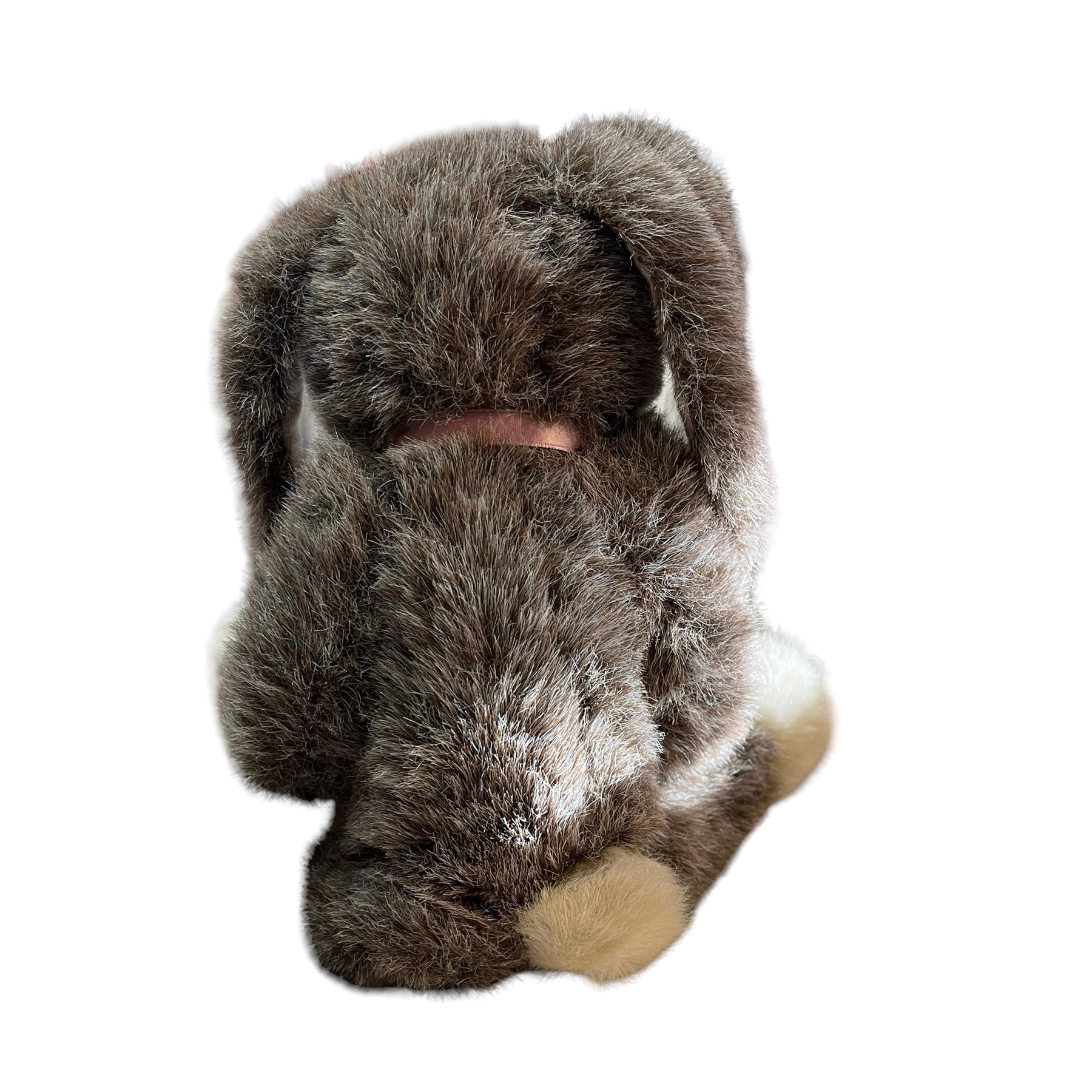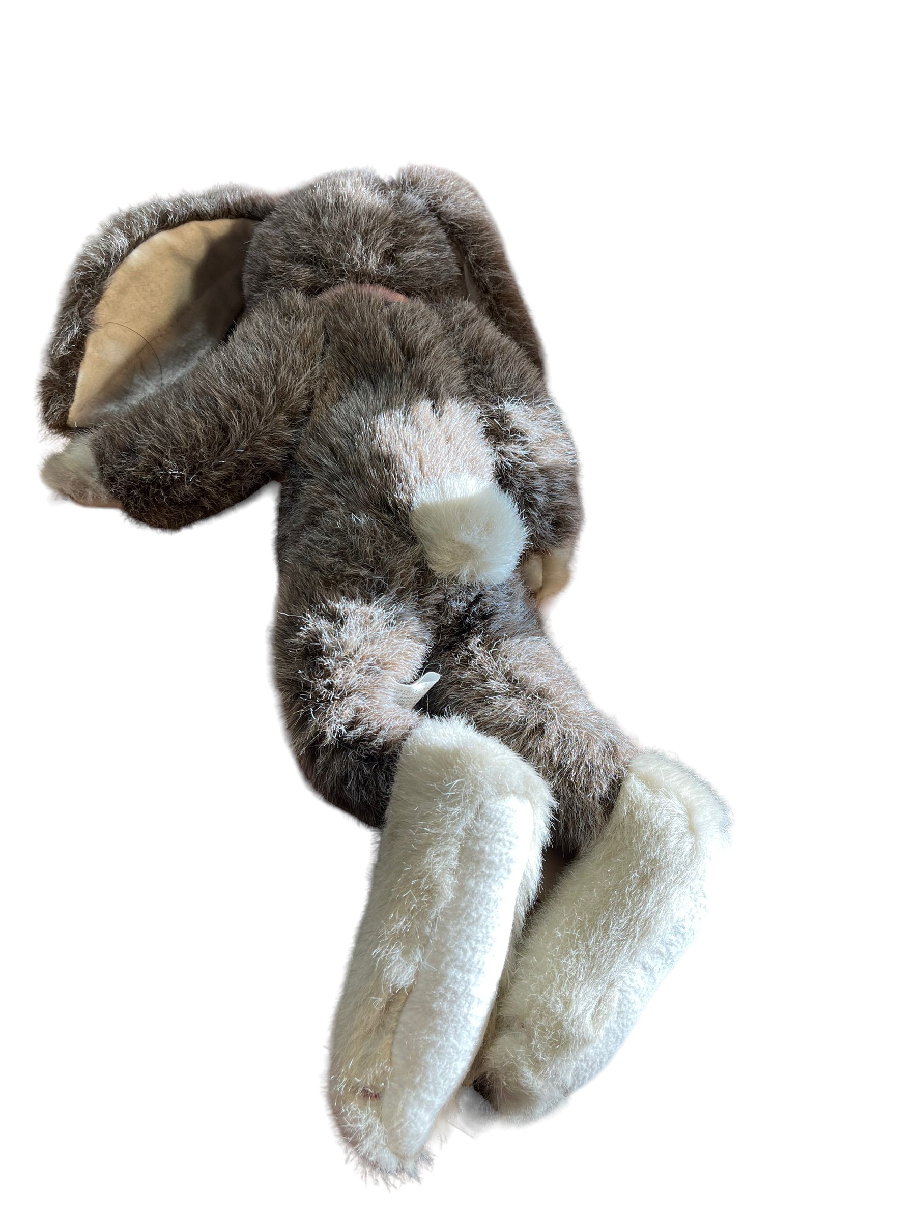 This adorable long eared bunny is heavily weighted and has jointed legs and extra long, heavily stuffed feet. This one is a treasure. Pink bow around it's neck. White tag, hard to find.