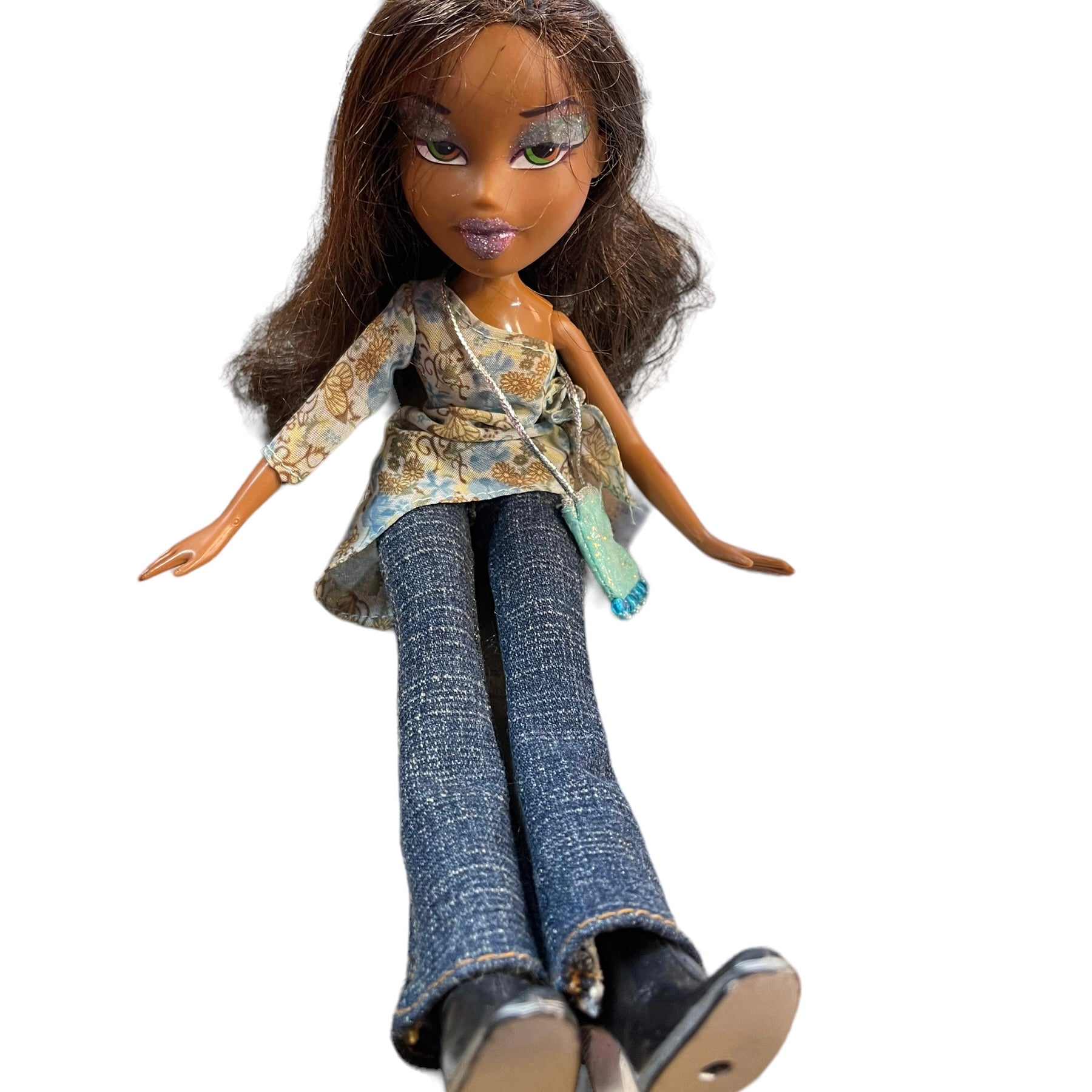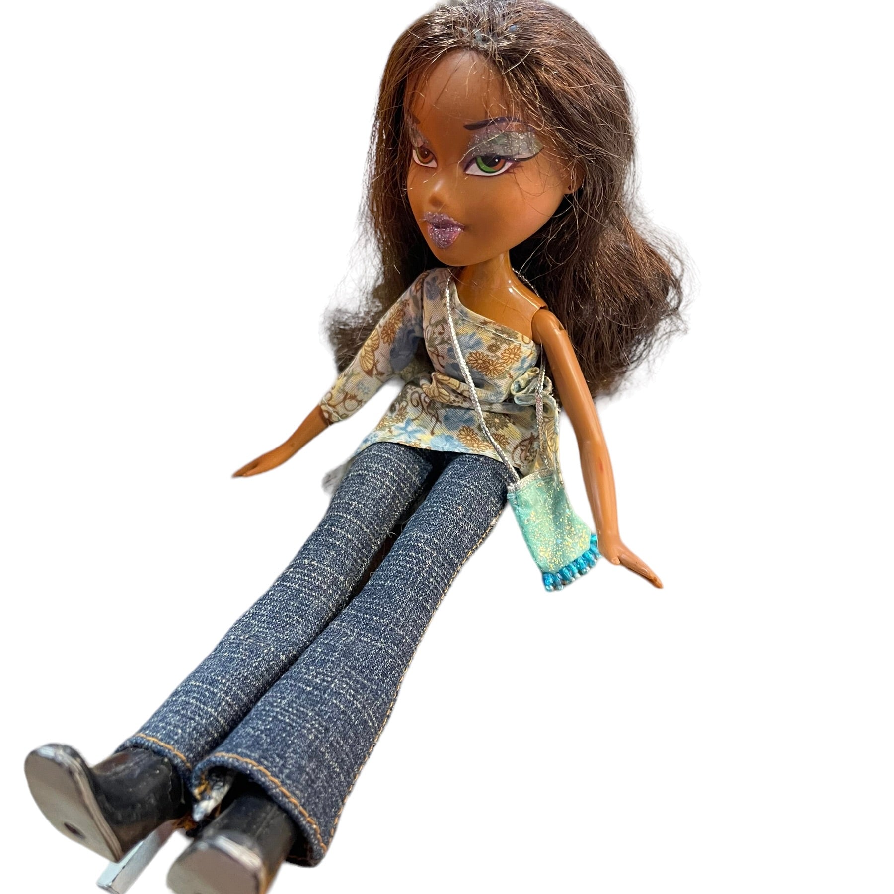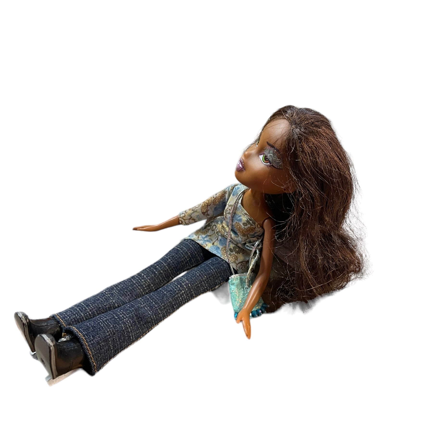 Exquisite 2015 Bratz Doll in gauzy one shoulder blouse with purse, denim bellbottoms & boots. Lots of sparkly make-up!