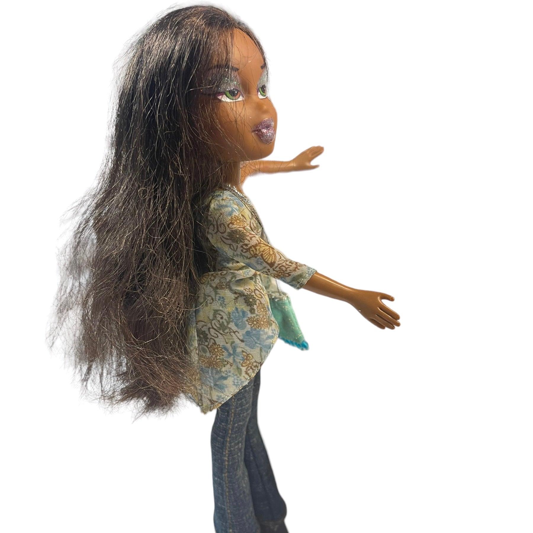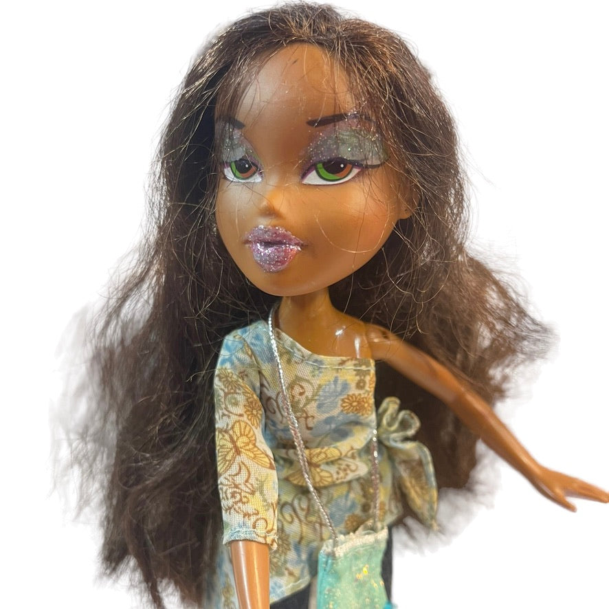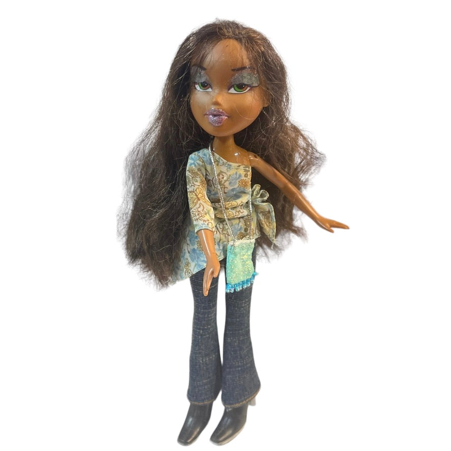 Exquisite 2015 Bratz Doll in gauzy one shoulder blouse with purse, denim bellbottoms & boots. Lots of sparkly make-up!