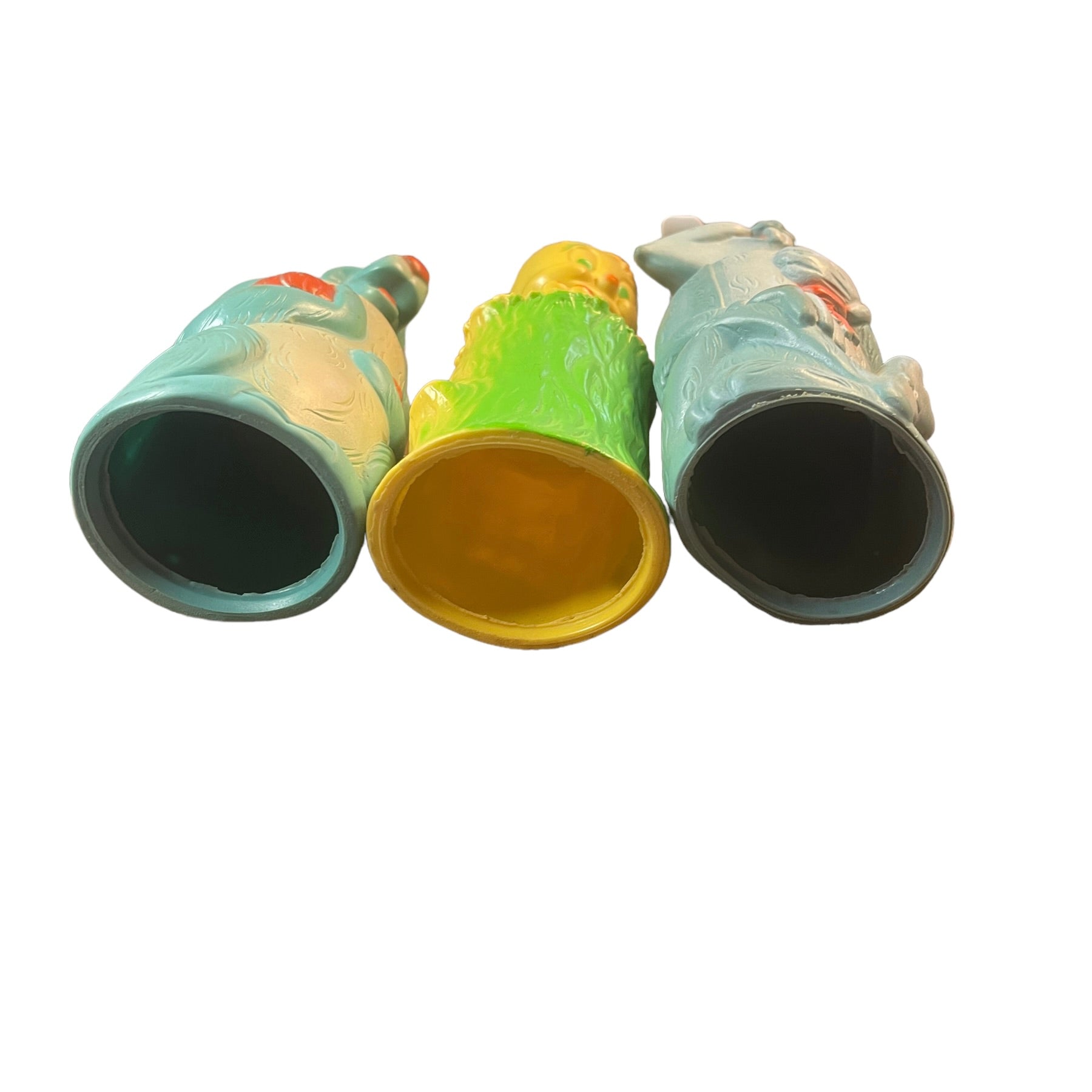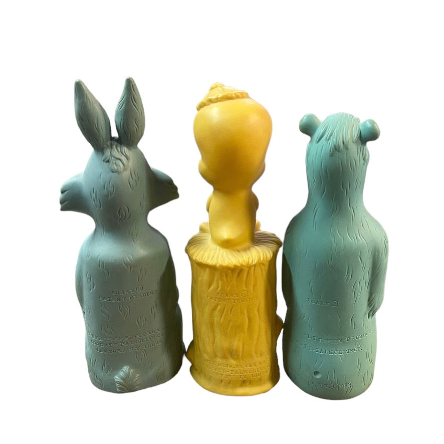 Vintage Colgate Palmolive Looney Tunes Tweety Bird Soaky, on Green Tree Stump, & Vintage Colgate Palmolive 1966 Disney Jungle Book Baloo Soaky, & Sweet Vintage Colgate Palmolive Warner Bros. Bugs Bunny Rabbit Shampoo Topper. A Blast from the Past! Great 60s and 70's Memorabilia in good Vintage Condition. Some minor fading and missing stoppers. 8.5-9" tall