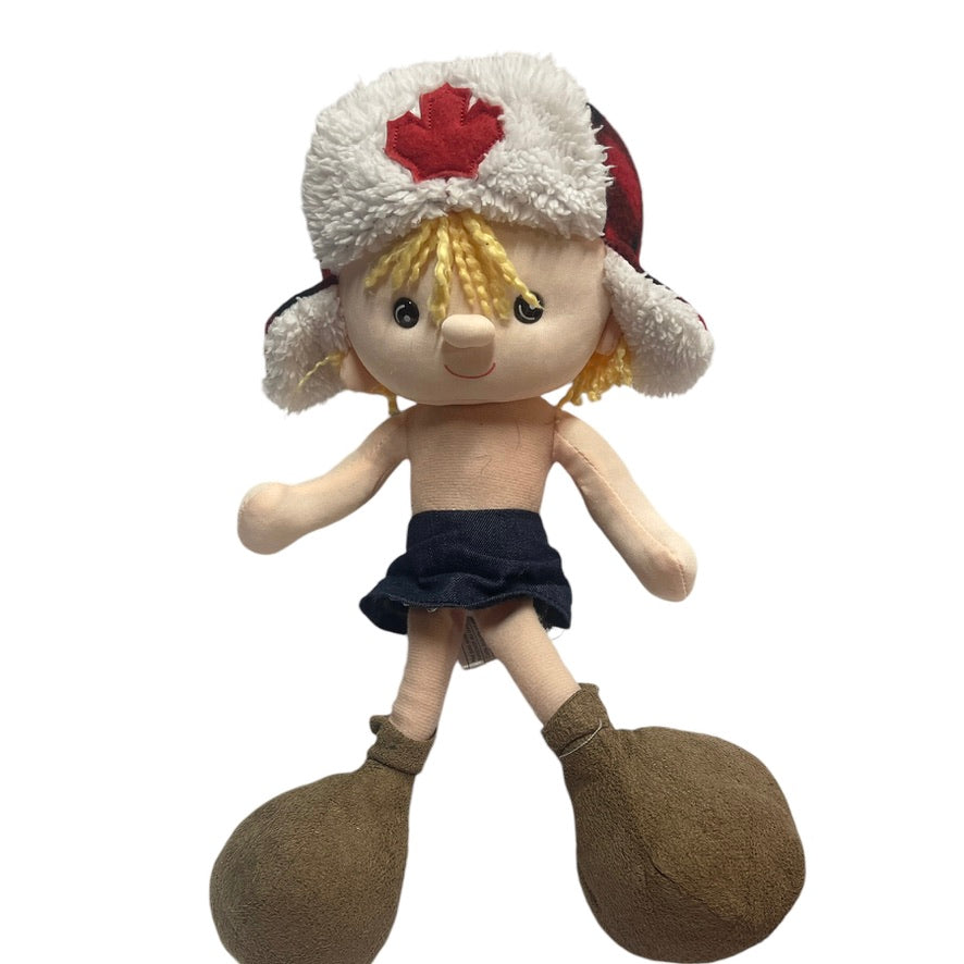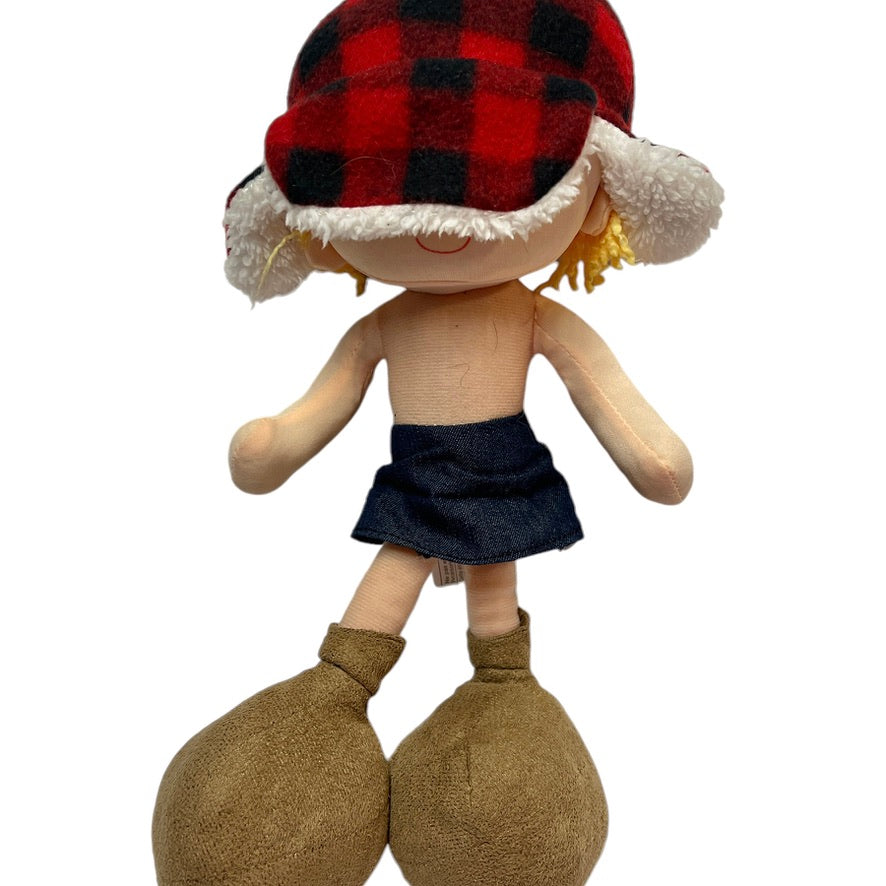 Absolutely Sweet! Canada Outdoor Girl Kickin's Kids 12" Girl Doll Complete with hat and skirt, Missing Jacket. Preowned, in great condition. She's keeping warm in a light Canadian Print flannel blanket!