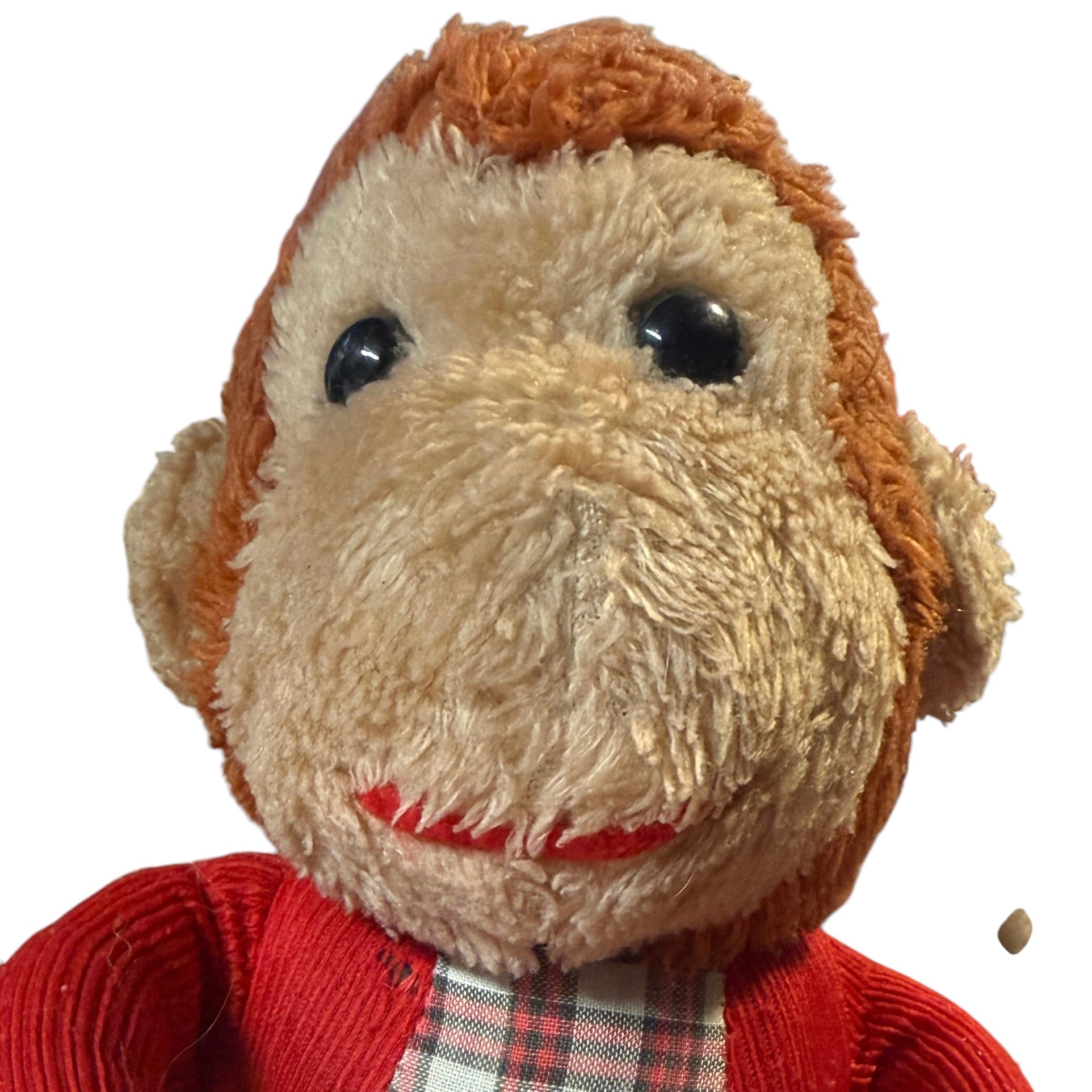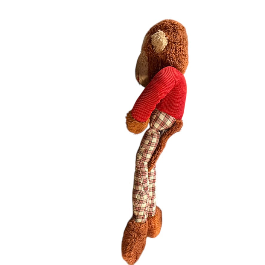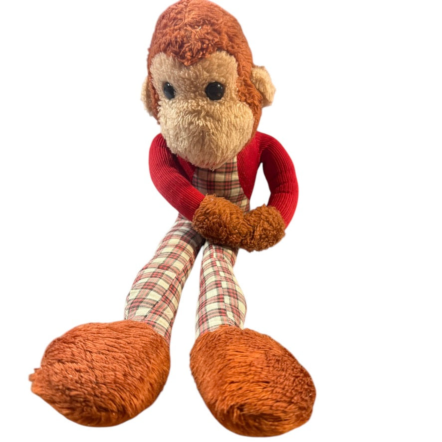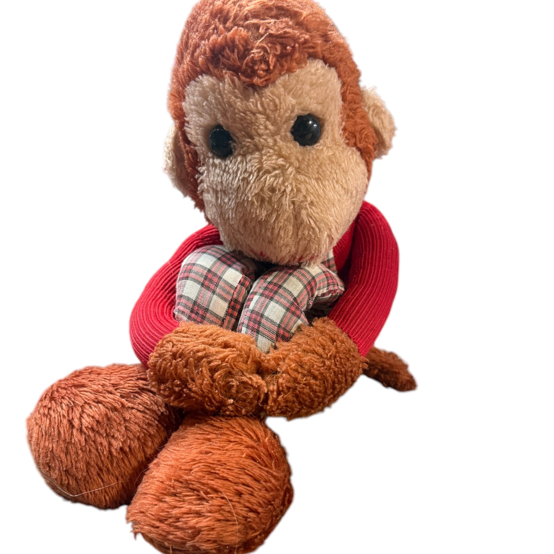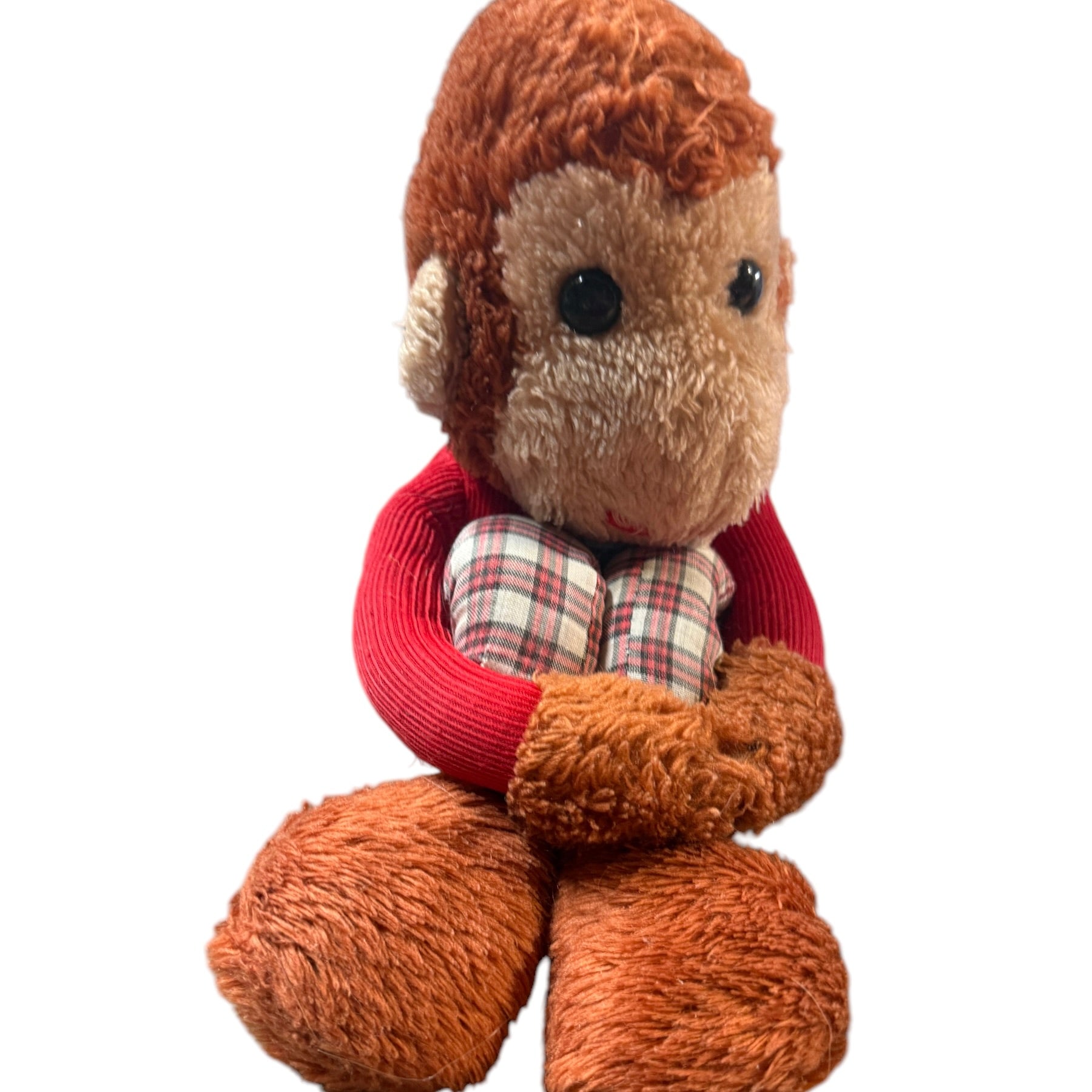 This classic long-legged stuffed monkey plush Knee Hugger is 17" and dressed in classic plaid overalls. Overalls have a repair from mid chest to groin (See pictures). With bright and shiny eyes and big smile, this monkey is a really special 1970's stuffed animal buddy.
