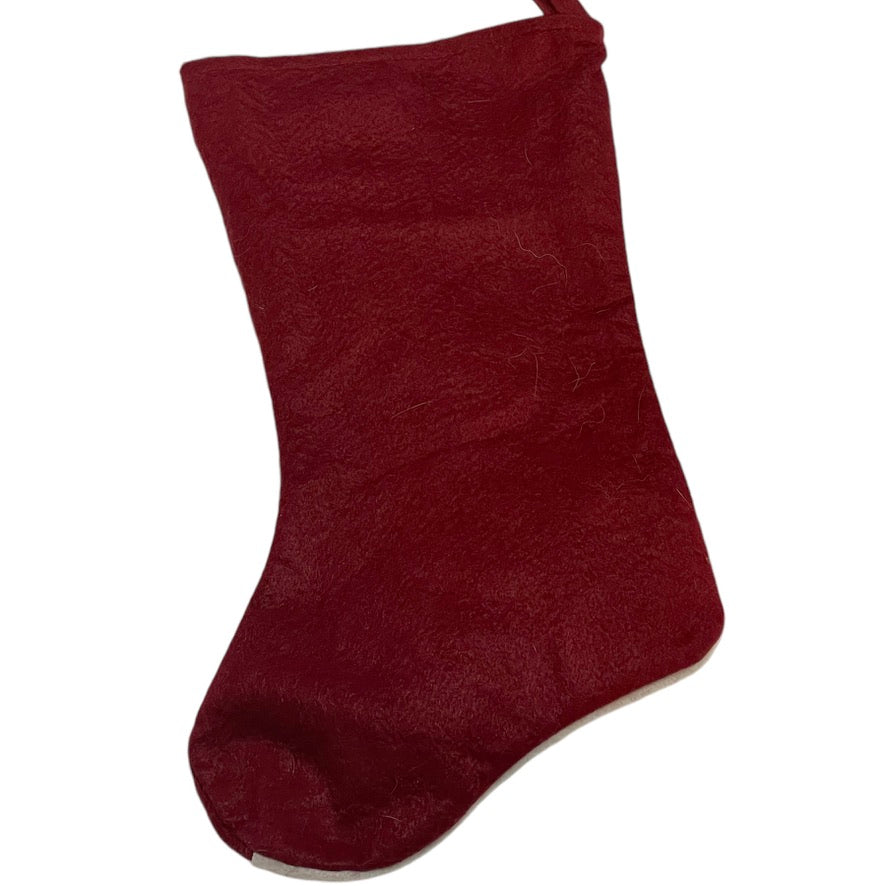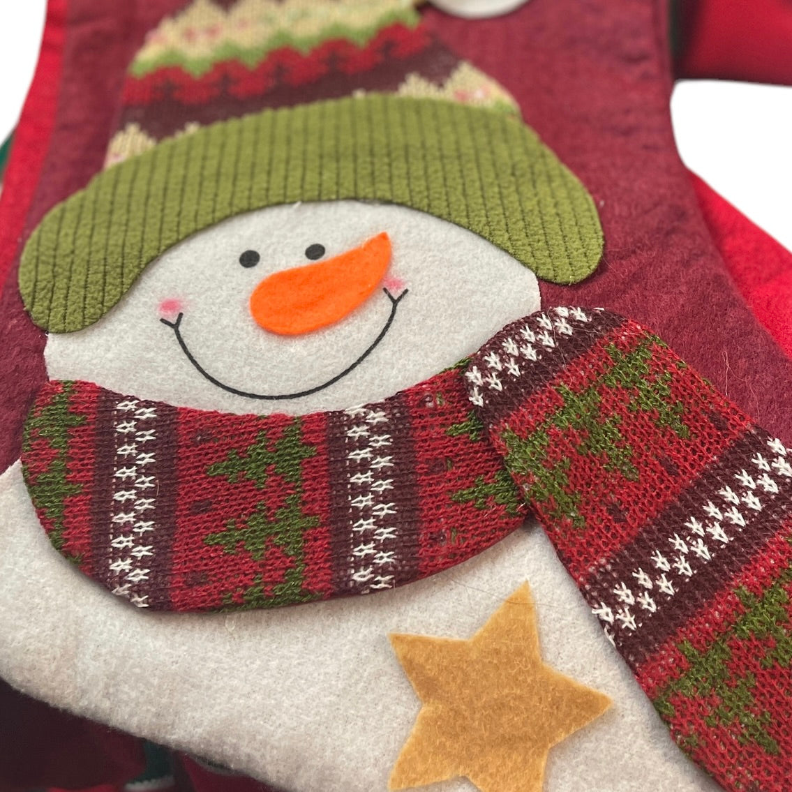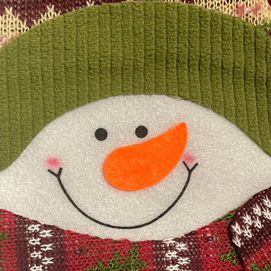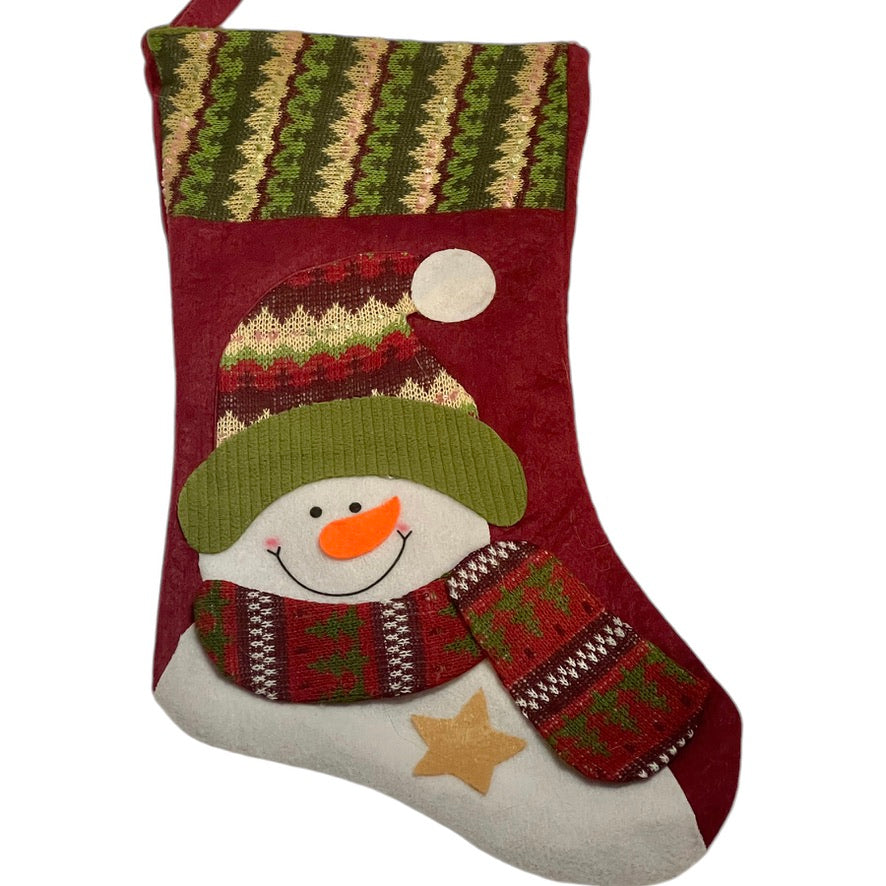 This generously sized Snowman Stocking has plenty of room for Santa's treats! Deep red, and olive green woven appliqued hat and scarf. Excellent preowned condition.