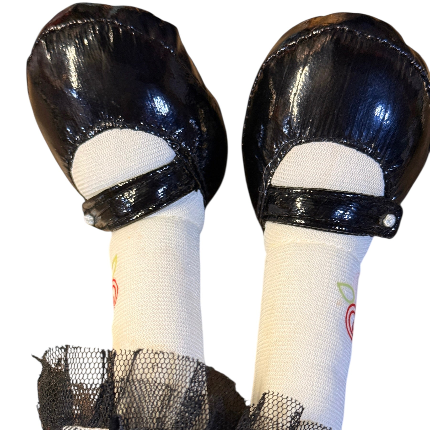 This pretty girl has an embroidered face, complete with a star on her cheek. Wearing a smart black and white outfit, with bows and net slip on her tartan skirt. Complete with pretty black purse and shoes, this doll is in very good preowned condition.