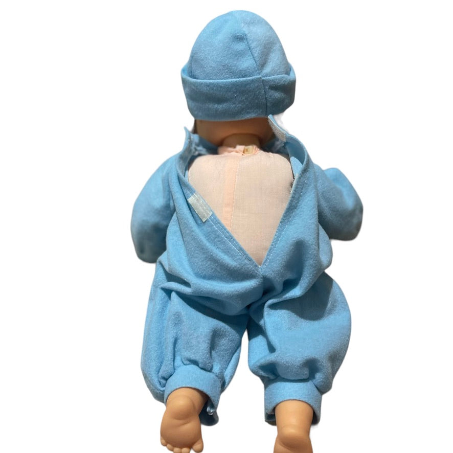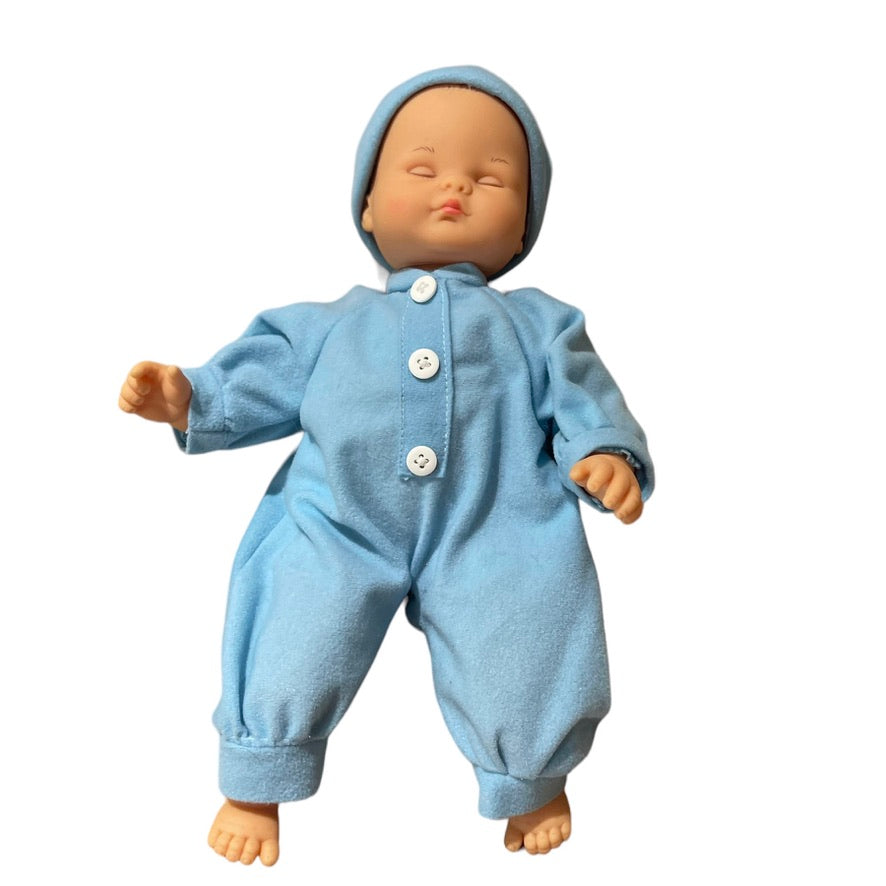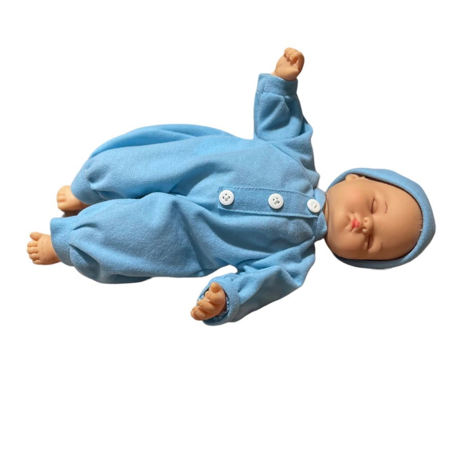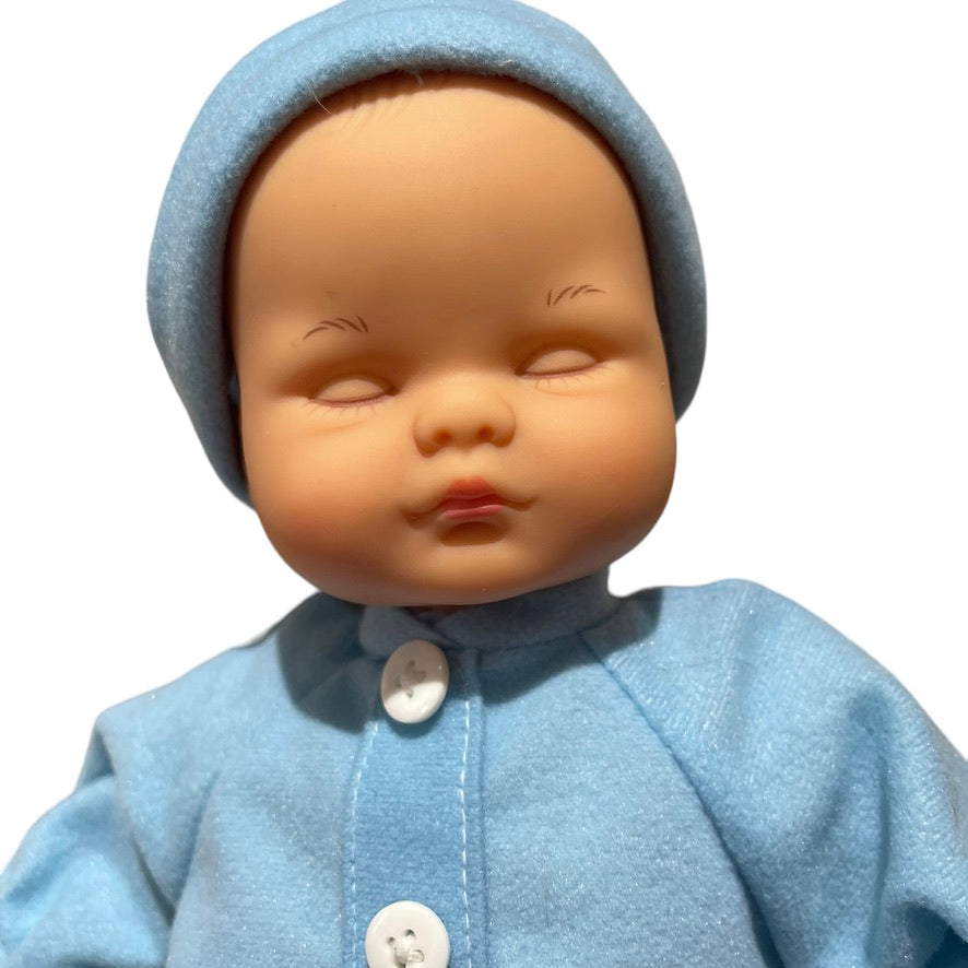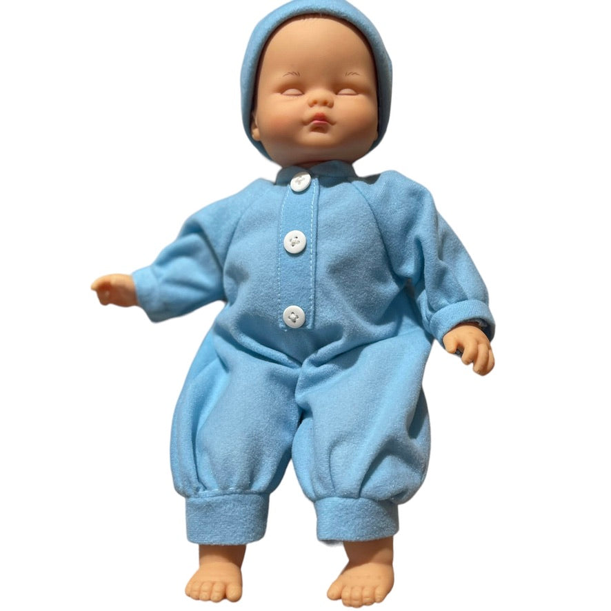 Incredibly sweet faced sleeping. baby doll dressed in traditional blue sleeper with matching cap. A sleepy friend, perfect for little hands!
