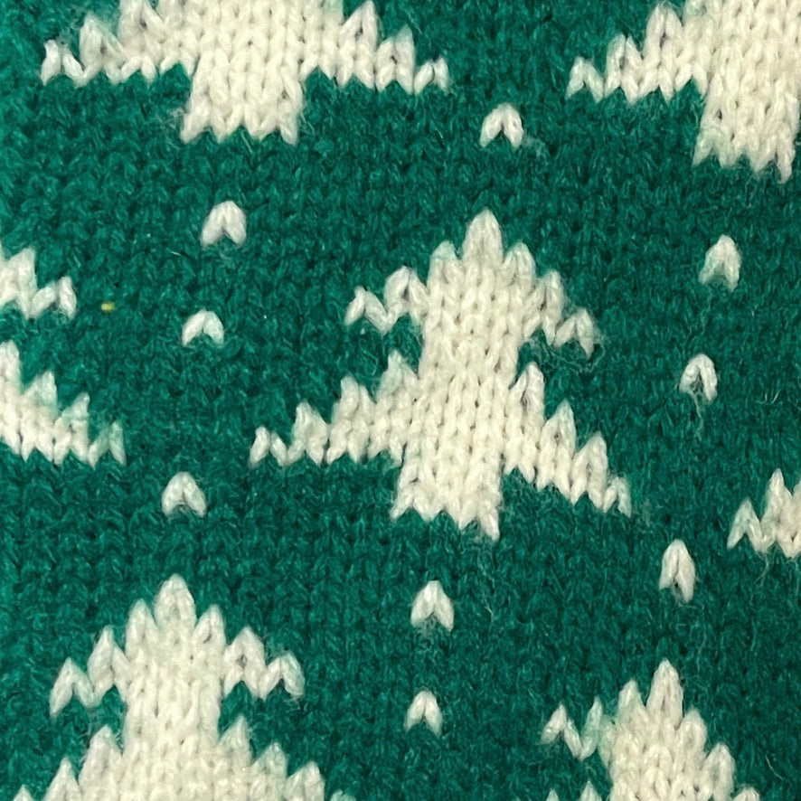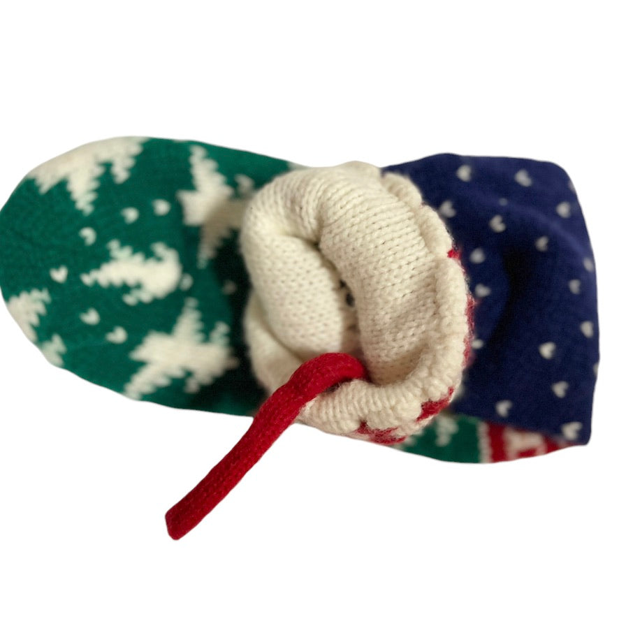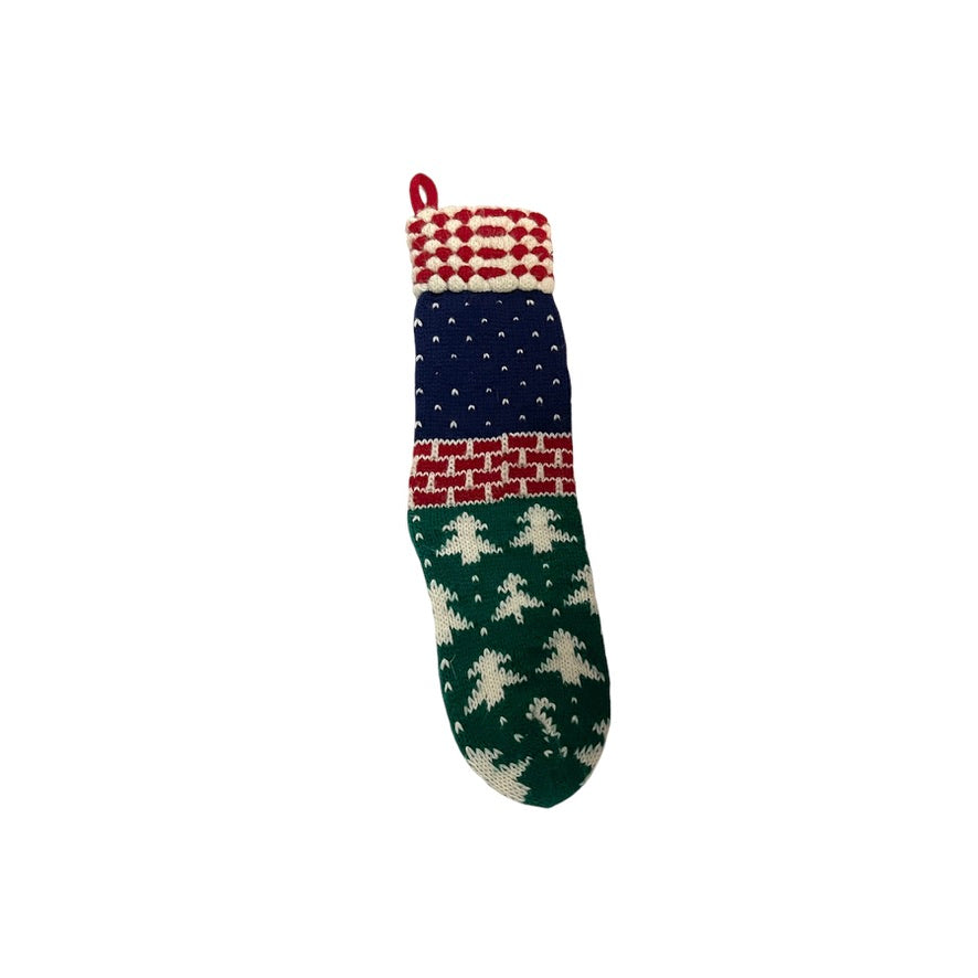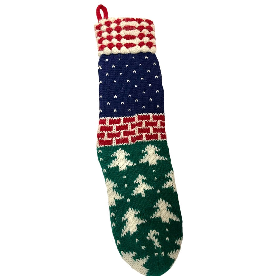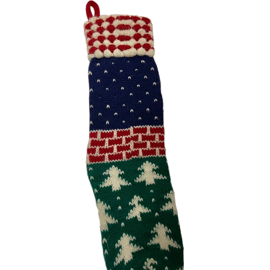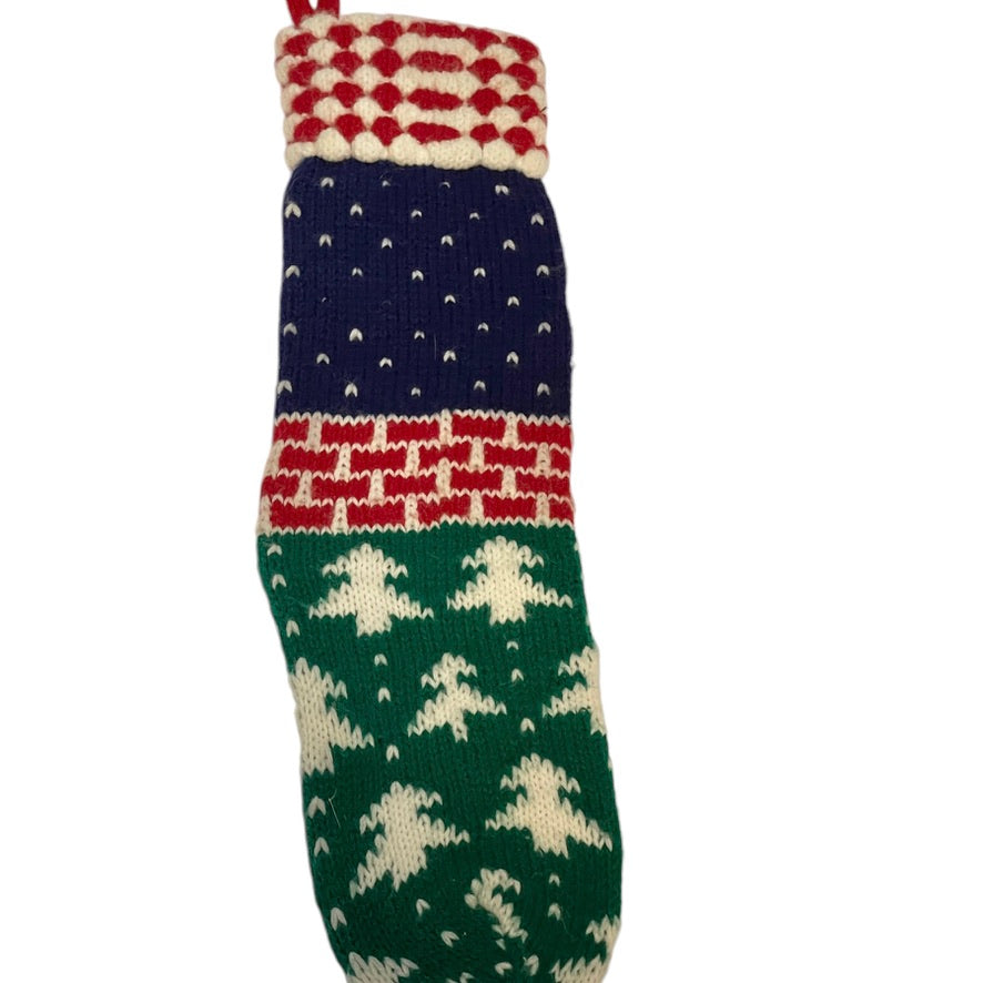 Lovely Vintage Knit Christmas Stocking, features Santa, complete with Toy Bag, Chimney, Starry Night and a Forest of Trees. Stocking is 19" Long and 5" Wide. A really special Christmas Stocking.