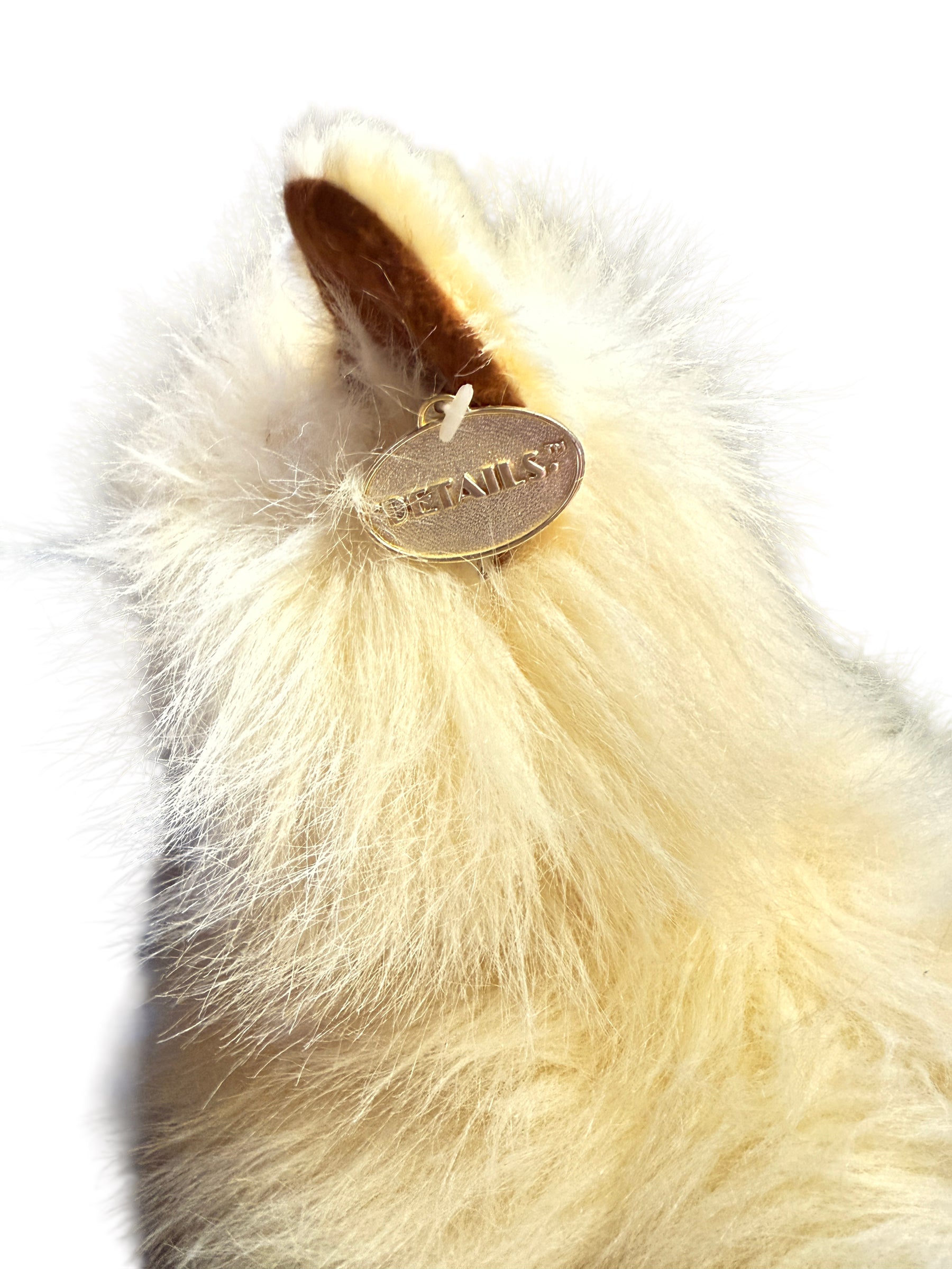 This beautiful, realistic cream and tan plush stuffed Himalayan cat has brown & topaz glass eyes, a luxuriously thick coat, and sports a gold plastic ear tag. This 16" Toy has a 12" fuzzy tail and is in excellent preowned condition, suitable for gift giving.