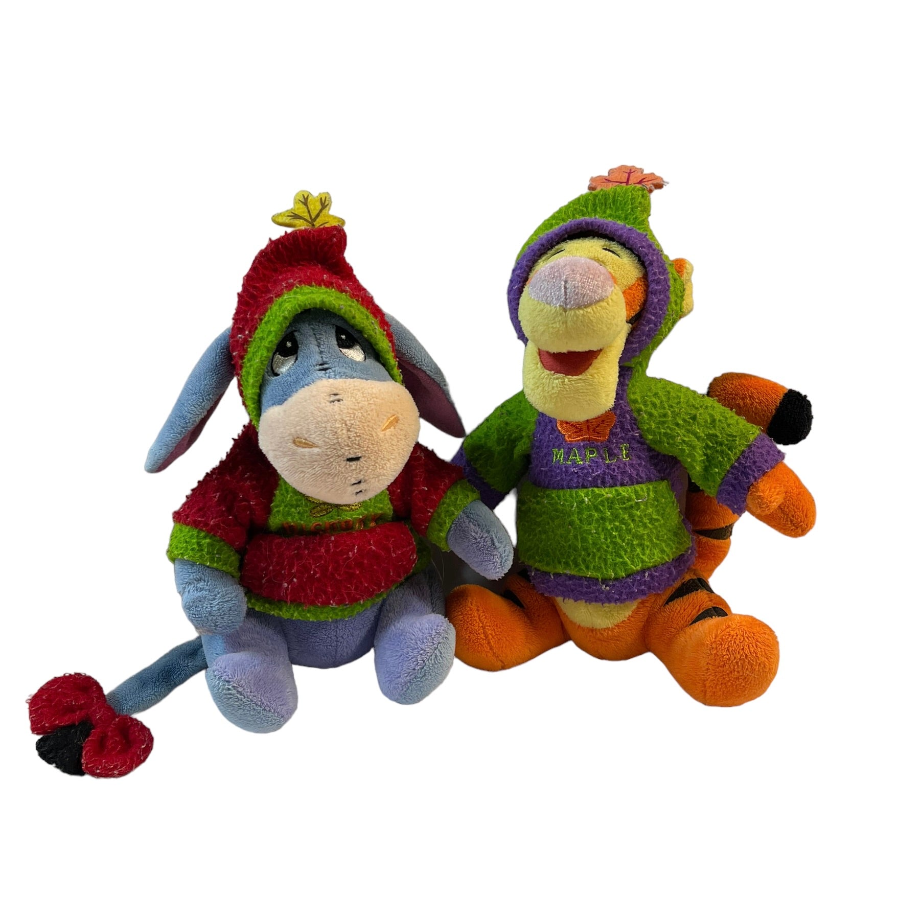 Disney 7 & 8" Eeyore and Tigger Bean Bag Plush Stuffed Animal toys wearing Fuzzy Tree themed Hoodies- Eeyore is Hickory and Tigger is in Maple. These adorable plush are wonderful for the collector or a new little friend!