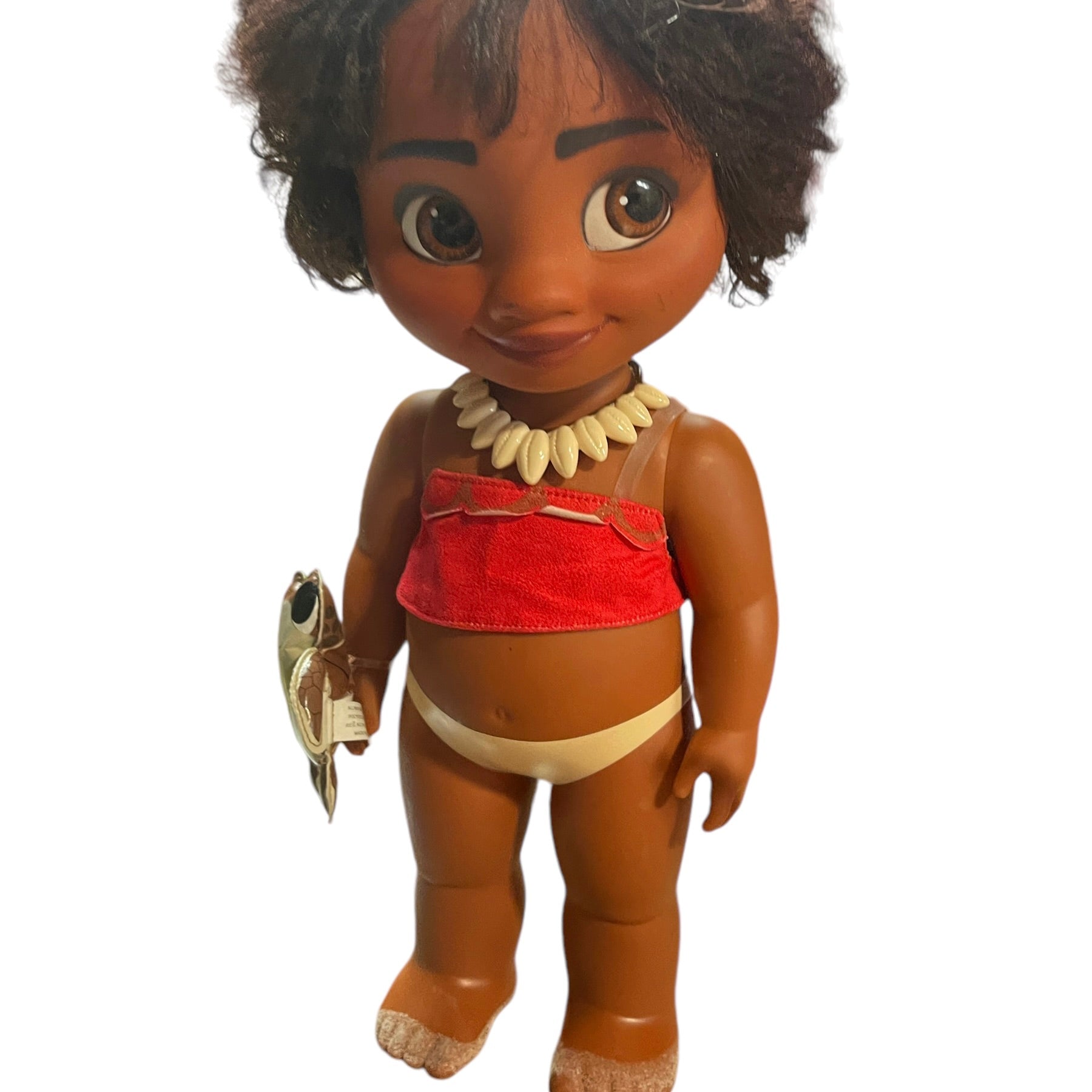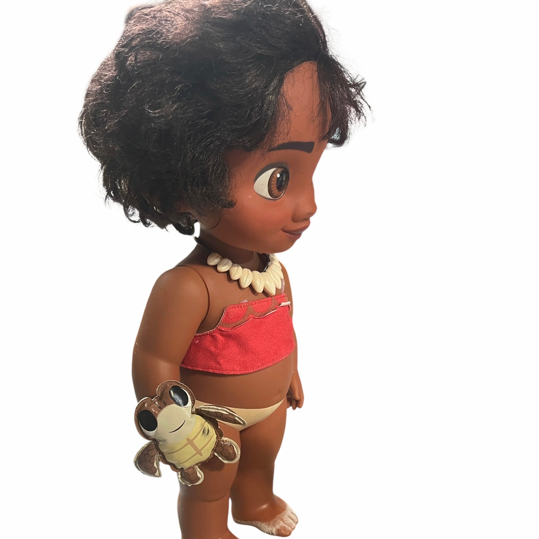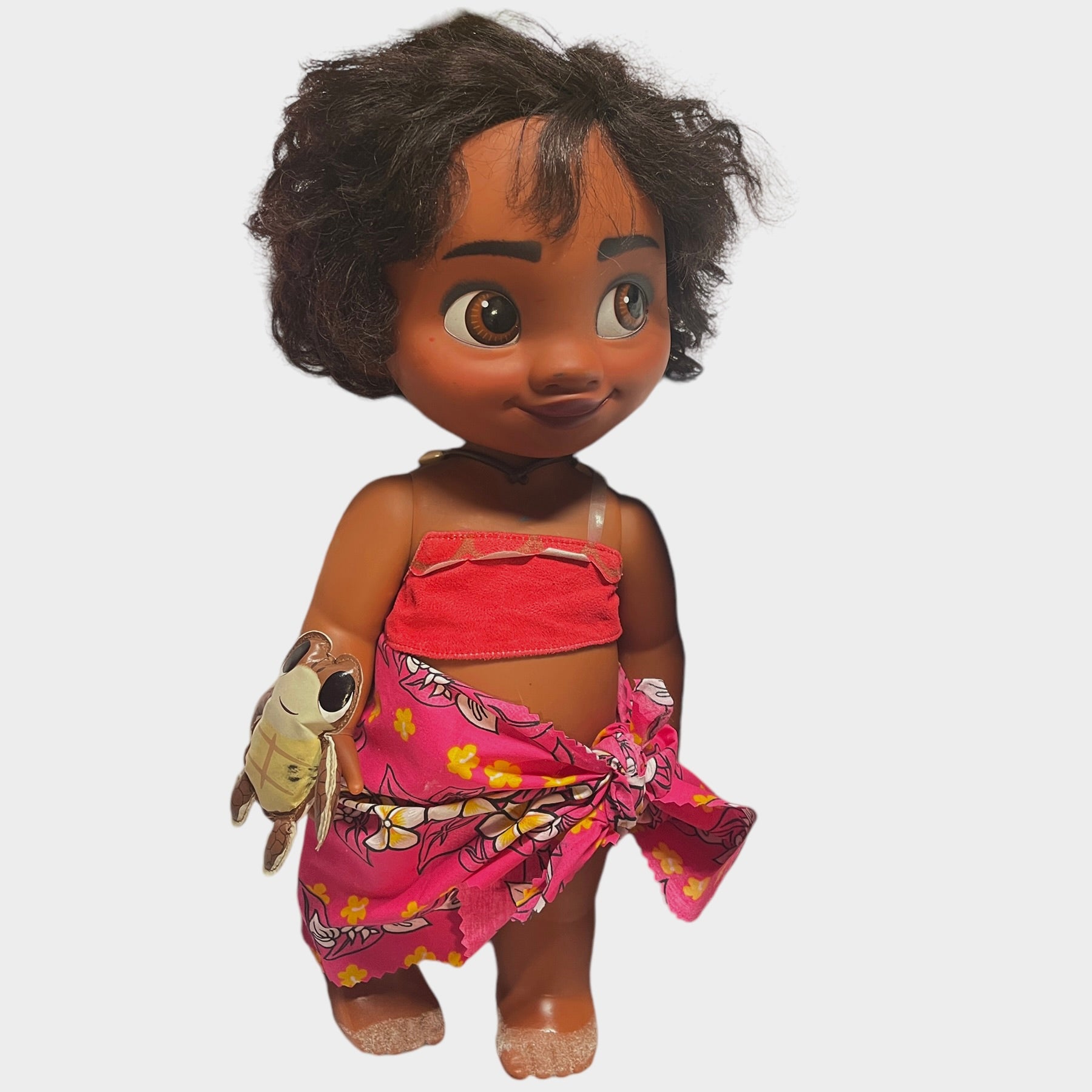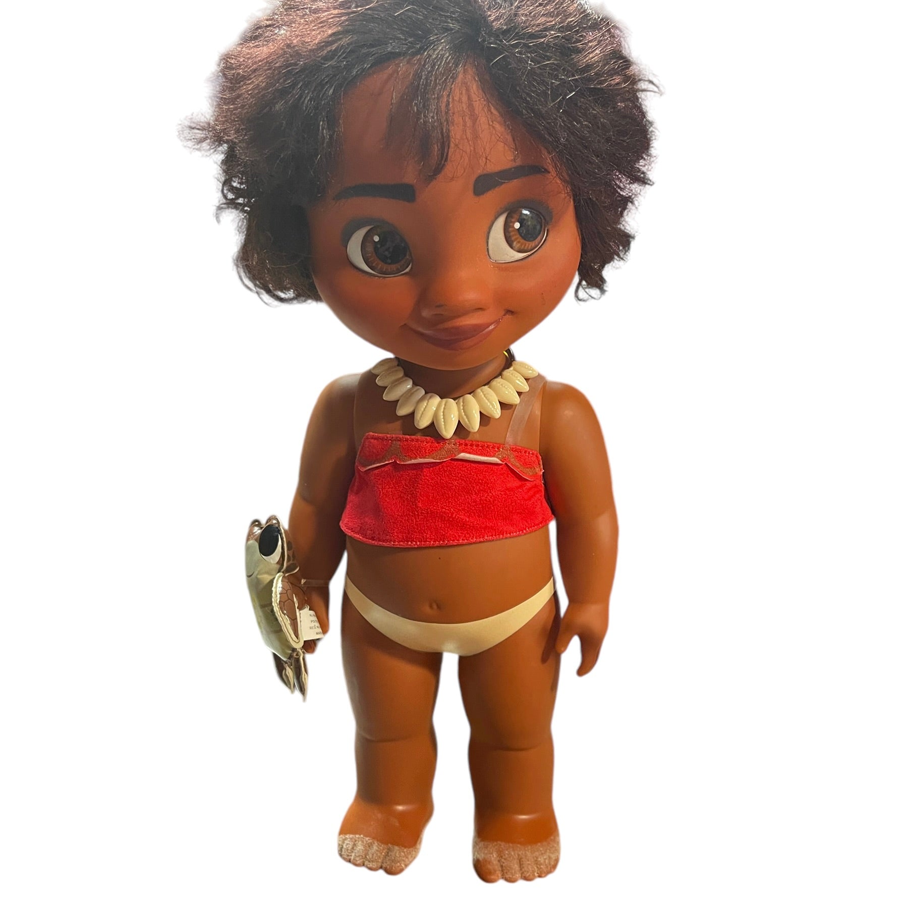 Beautiful Toddler 15" Moana doll, moveable arms and legs and sandy little feet. Moana has a vinyl turtle on her wrist, a shell necklace with faux leather strap, replacement Hawaiian skirt and blanket. and gorgeous huge brown eyes and black curly hair. This sweet little girl is in very good preowned condition.