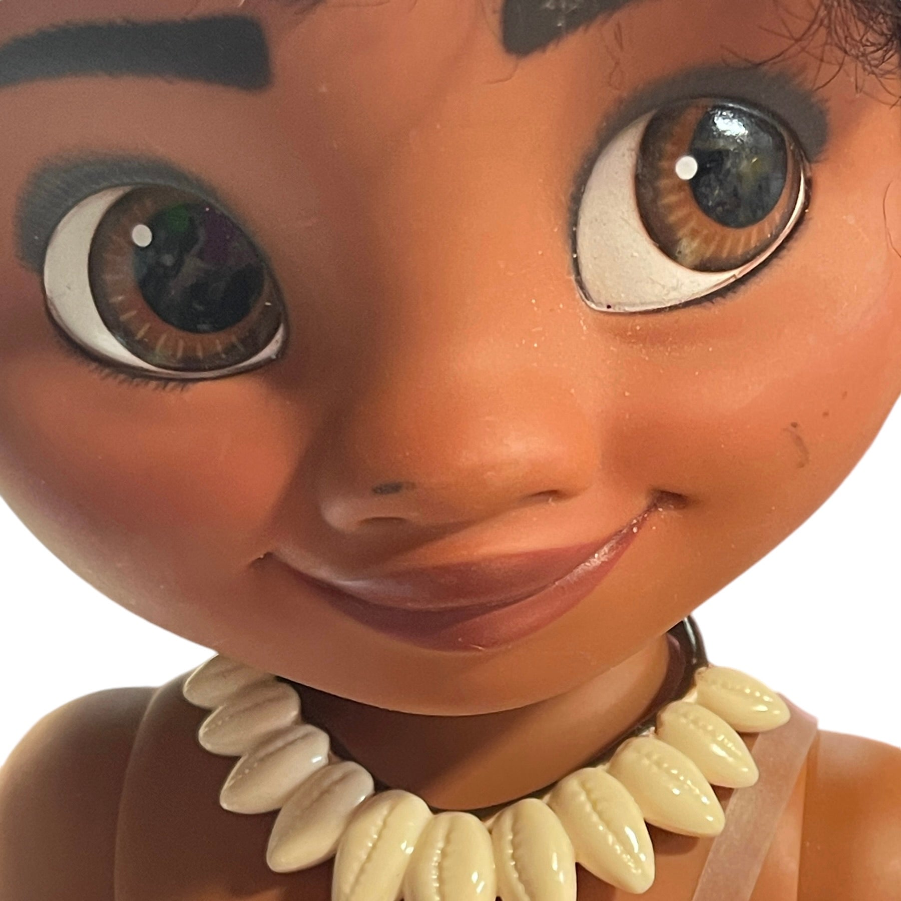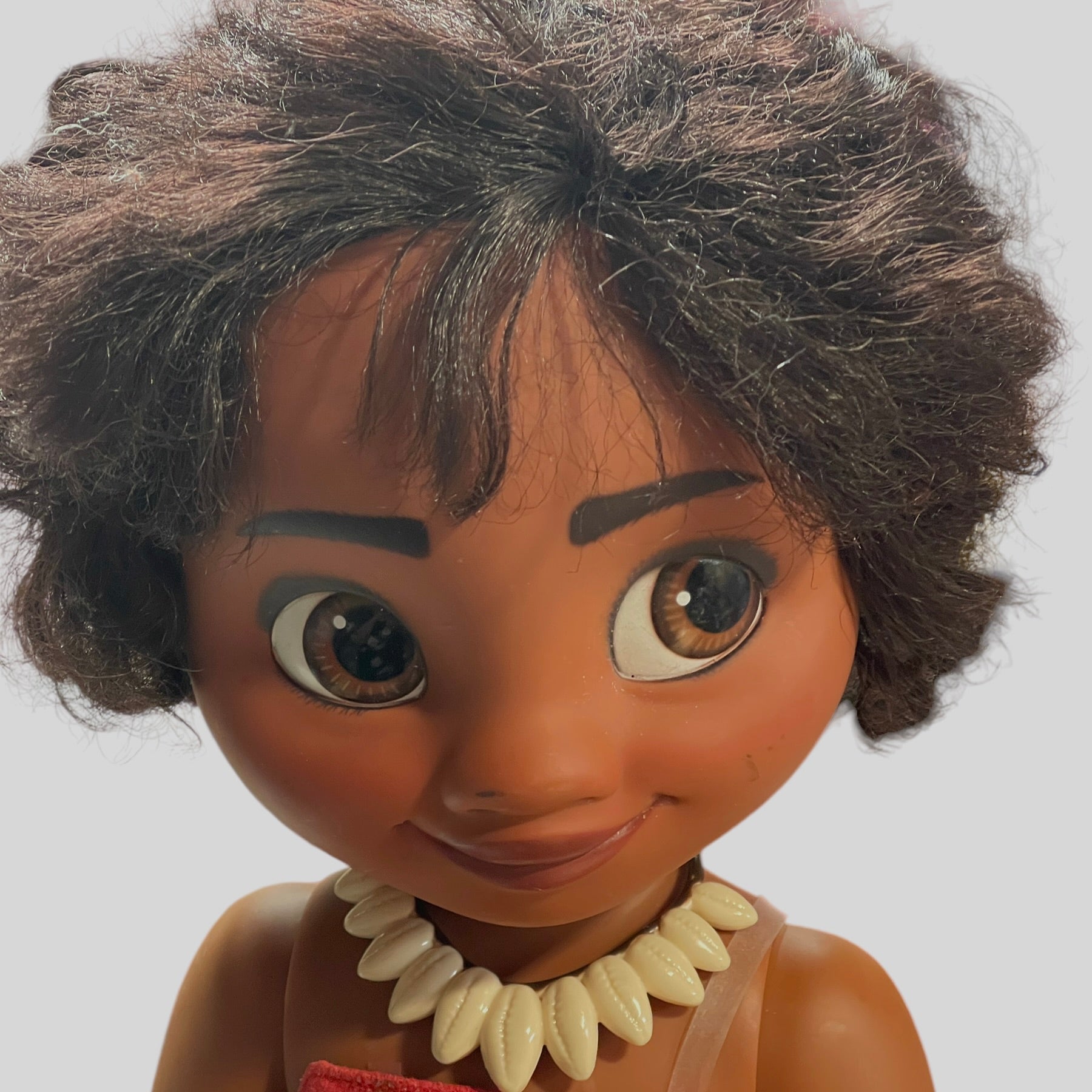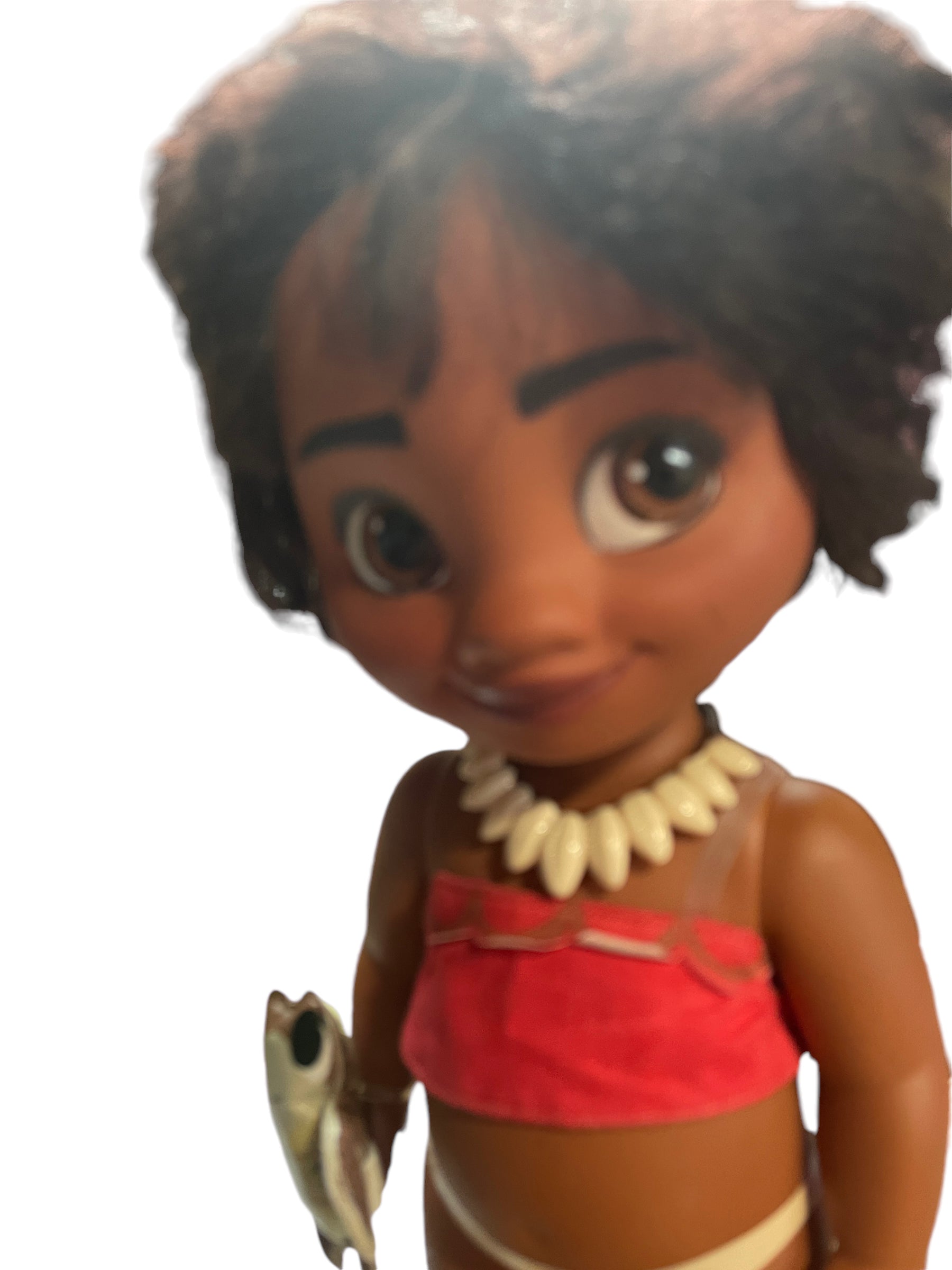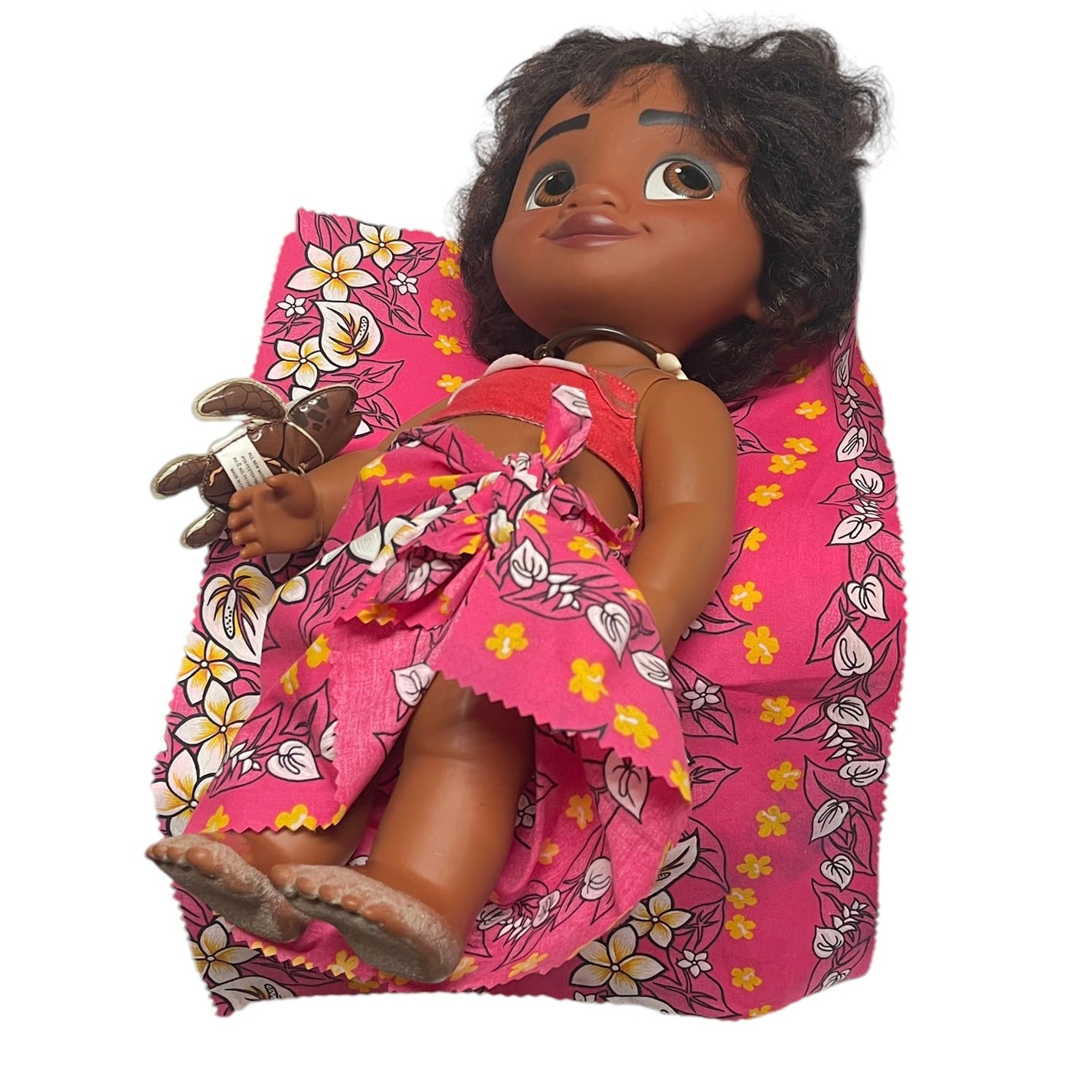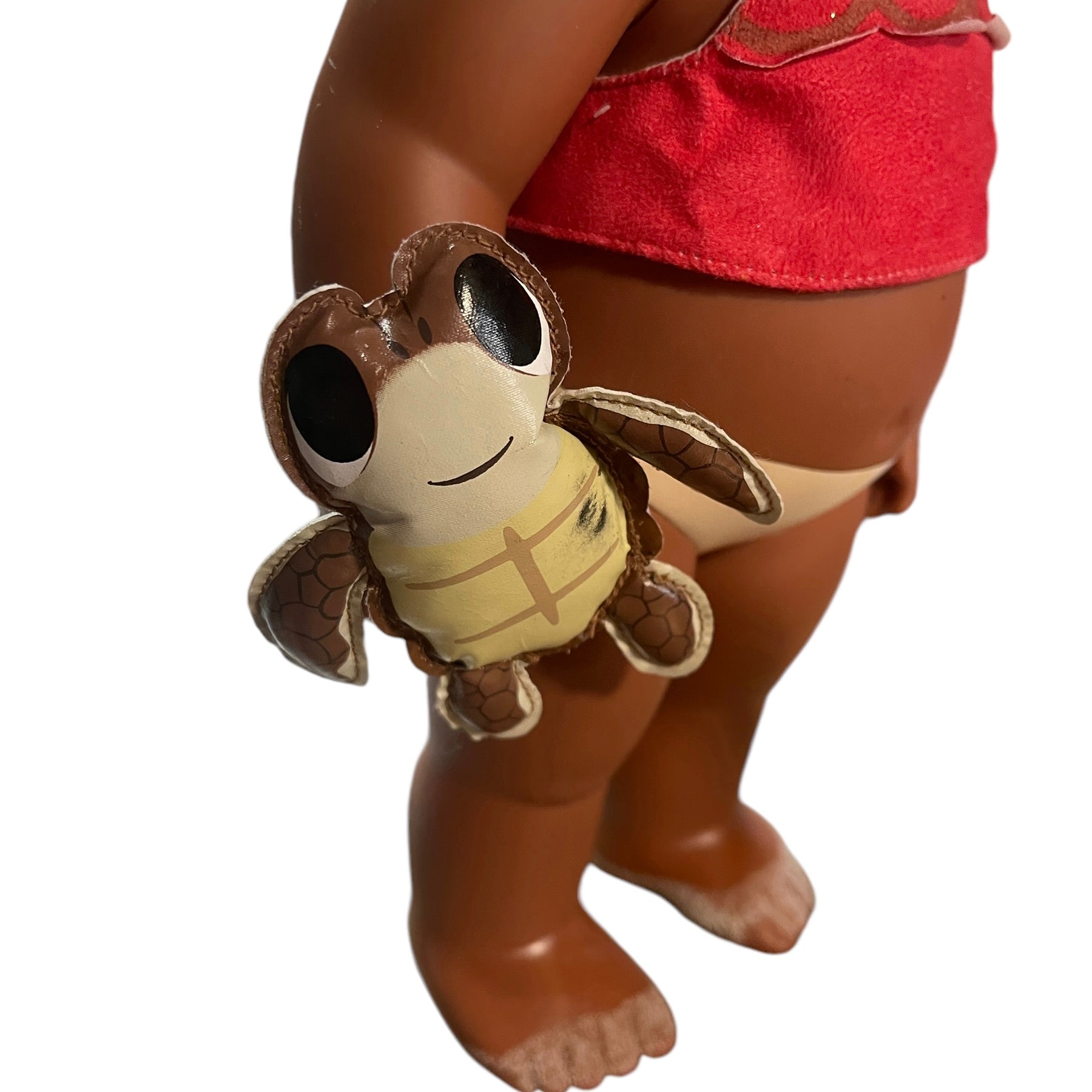 Beautiful Toddler 15" Moana doll, moveable arms and legs and sandy little feet. Moana has a vinyl turtle on her wrist, a shell necklace with faux leather strap, replacement Hawaiian skirt and blanket. and gorgeous huge brown eyes and black curly hair. This sweet little girl is in very good preowned condition.