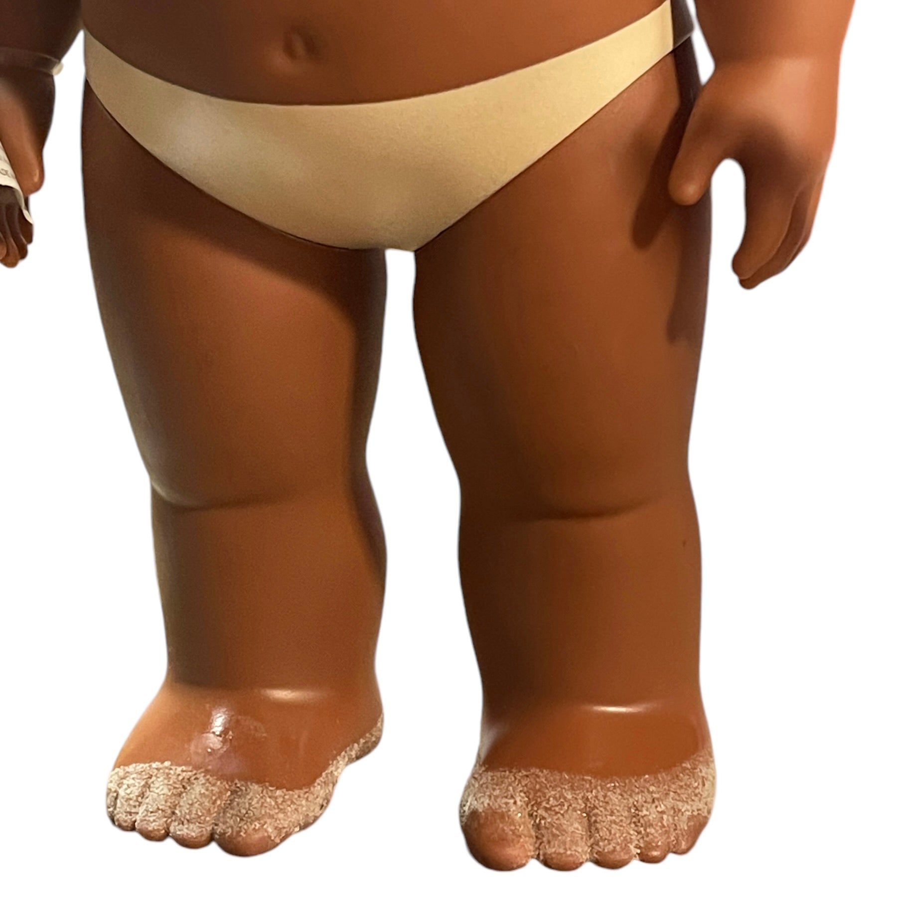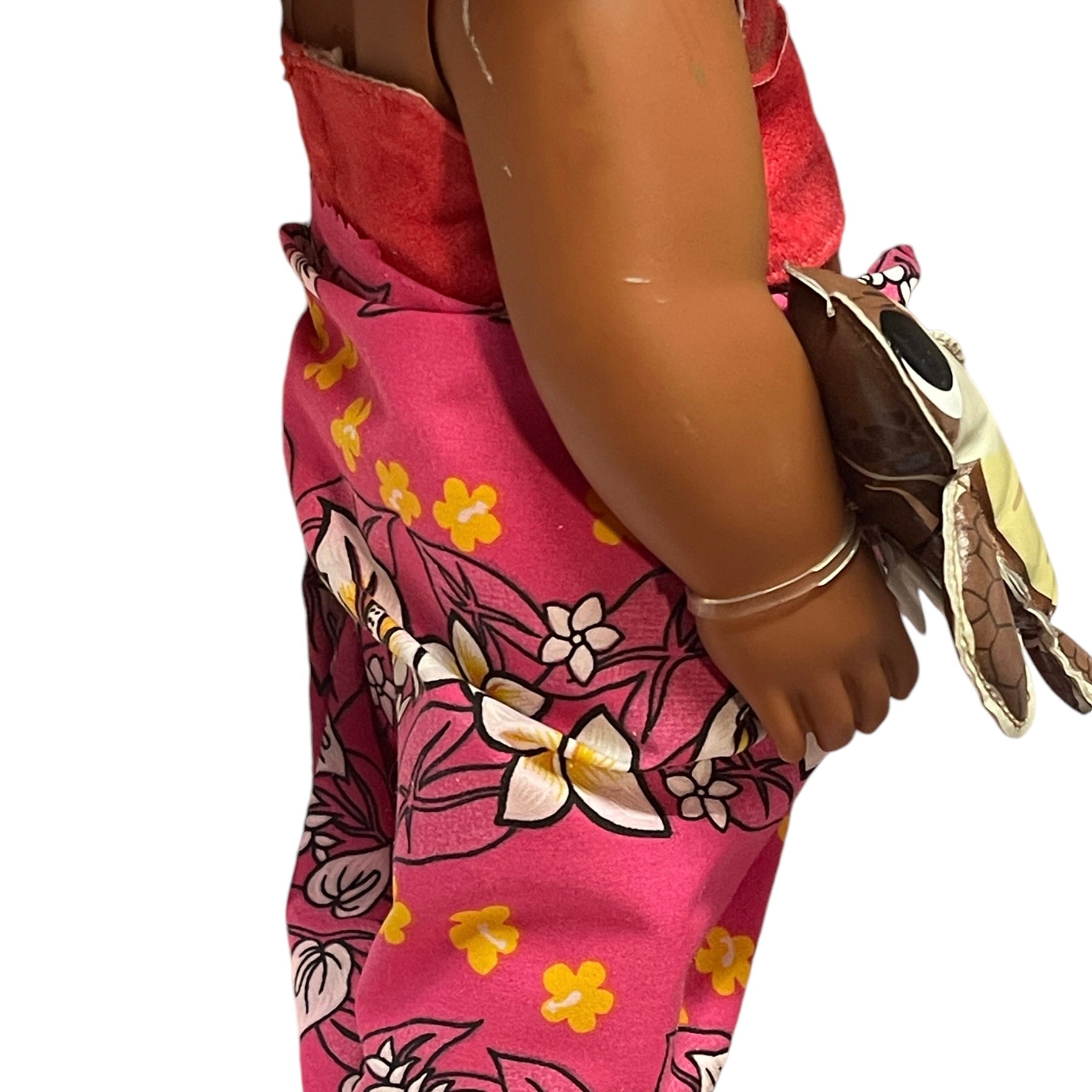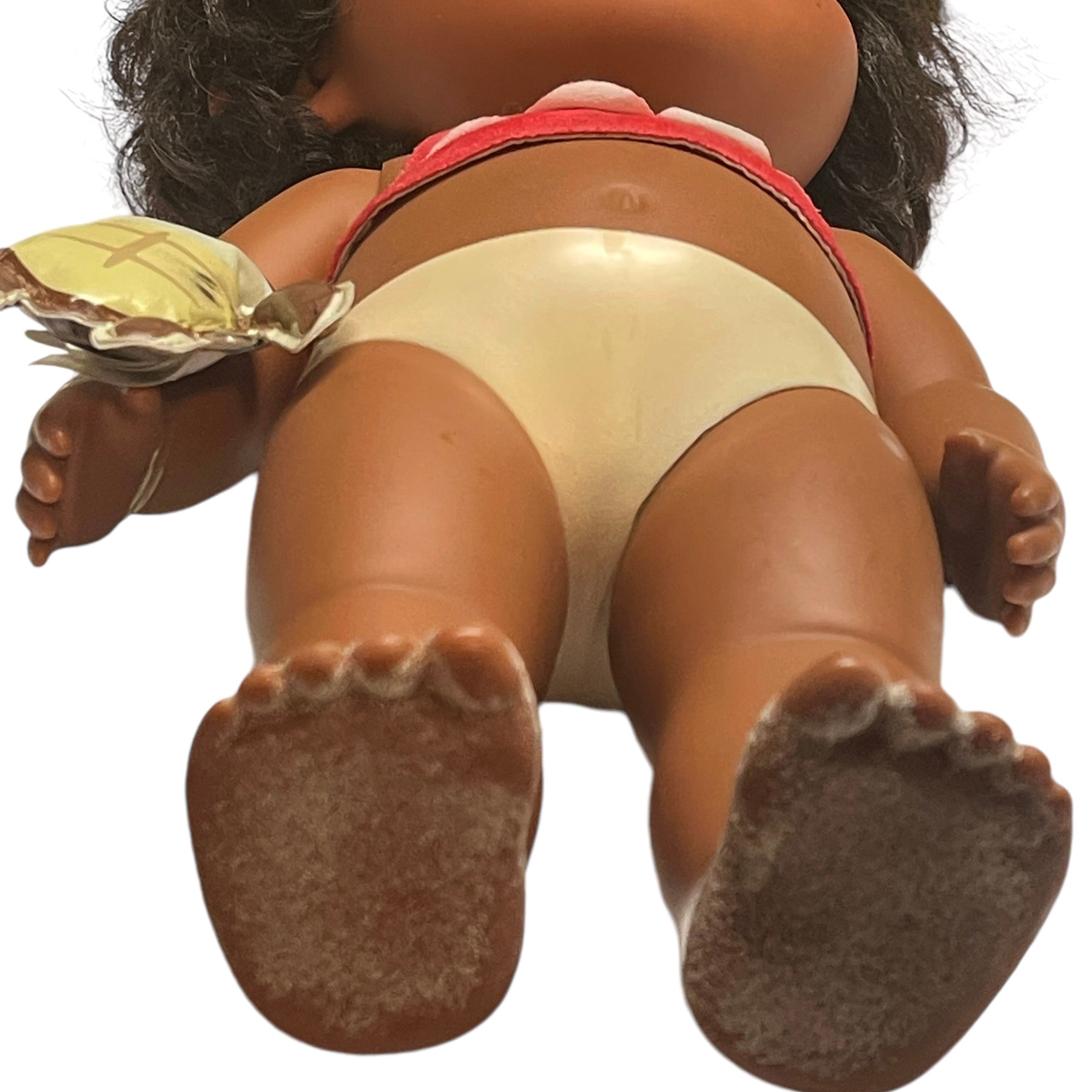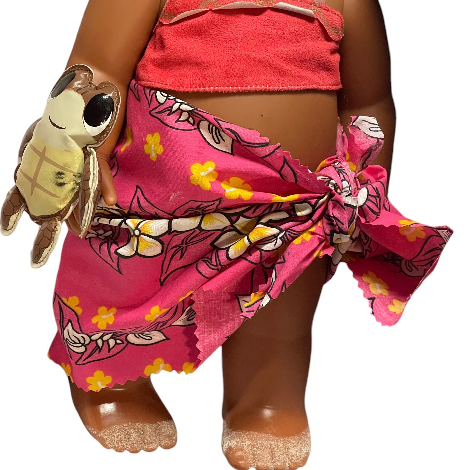 Beautiful Toddler 15" Moana doll, moveable arms and legs and sandy little feet. Moana has a vinyl turtle on her wrist, a shell necklace with faux leather strap, replacement Hawaiian skirt and blanket. and gorgeous huge brown eyes and black curly hair. This sweet little girl is in very good preowned condition.