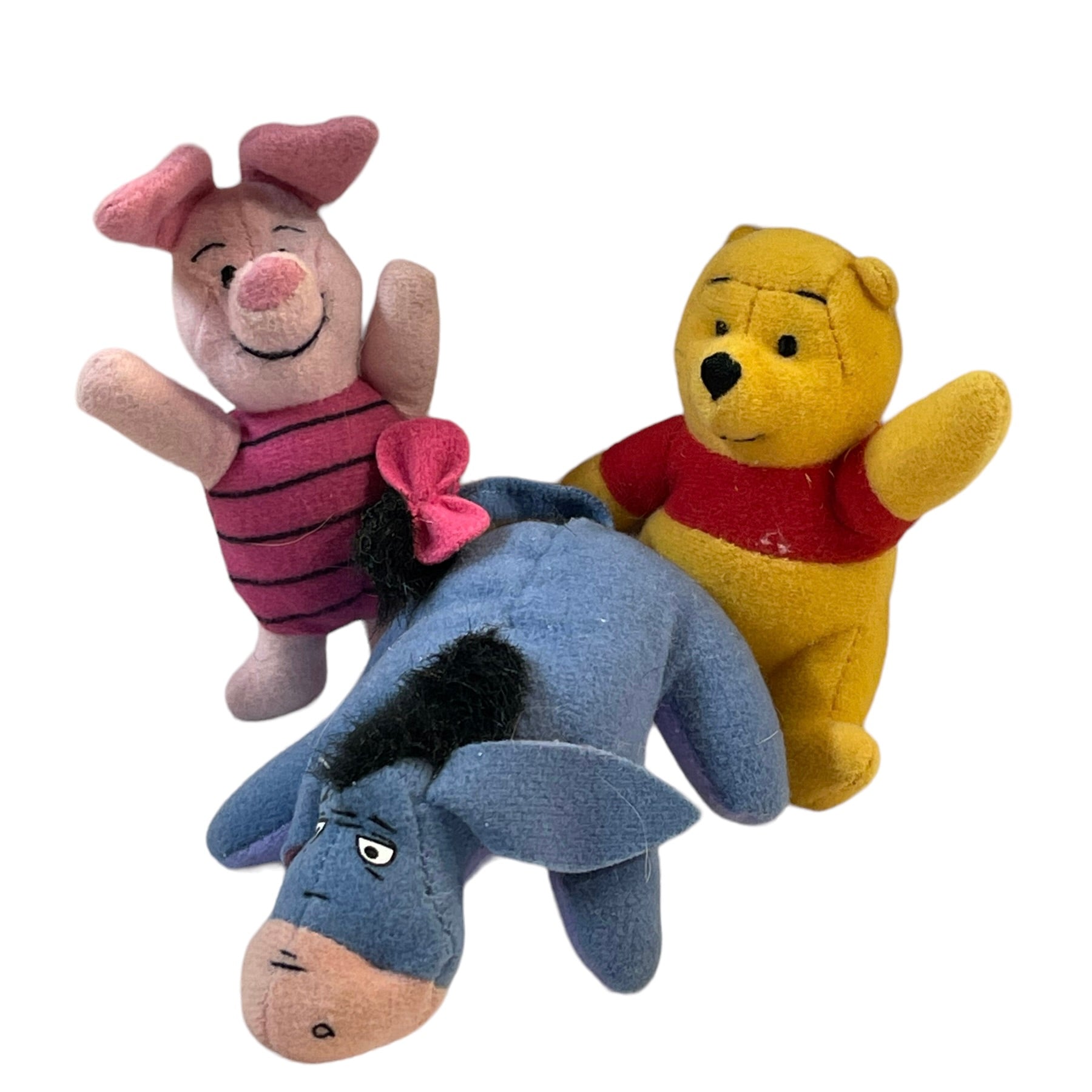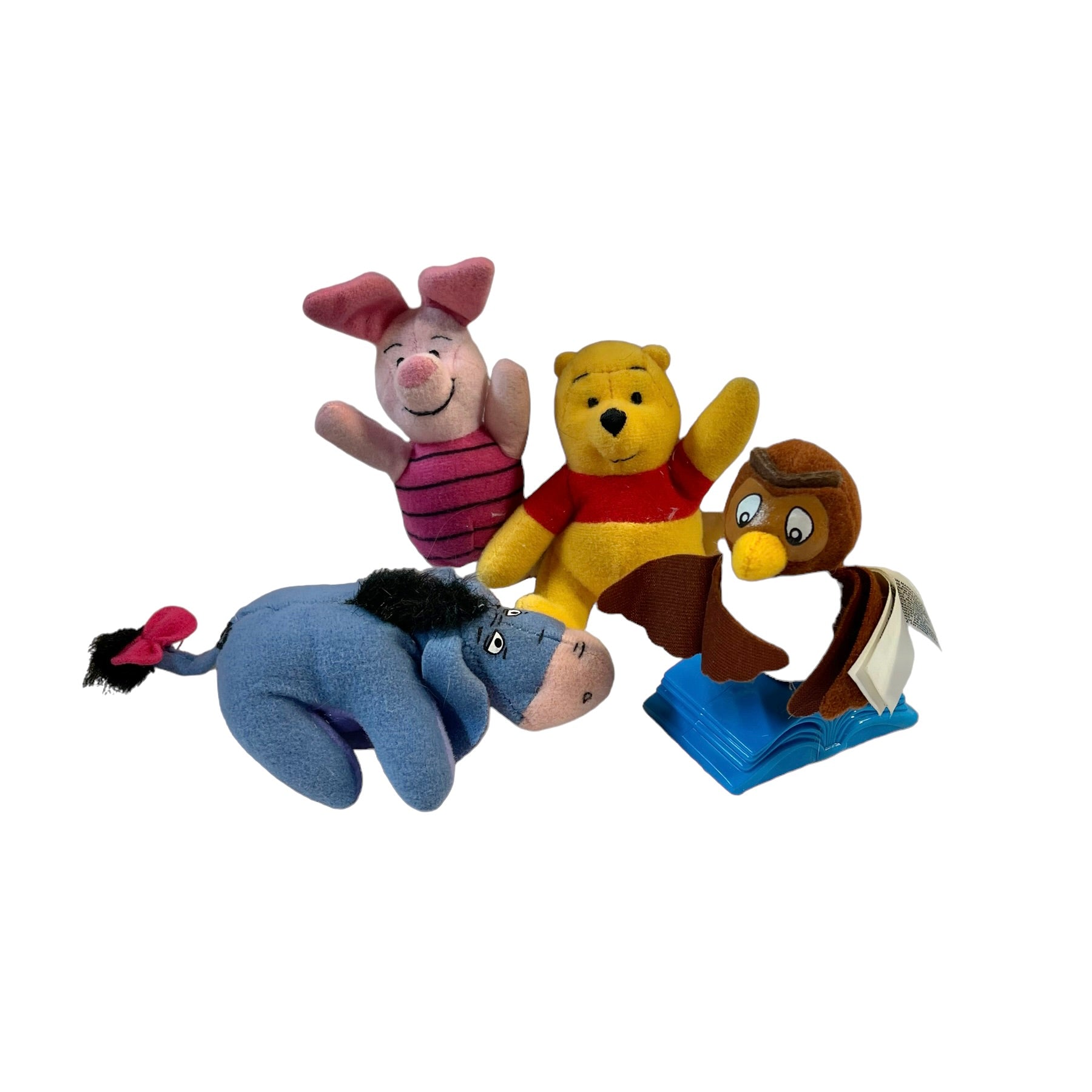 Lot of 4" Disney Winnie the Pooh Plush characters, Pooh, Eeyore, Piglet and Owl. A delightful collection of new friends in very good preowned condition. Owl s also a stamp!