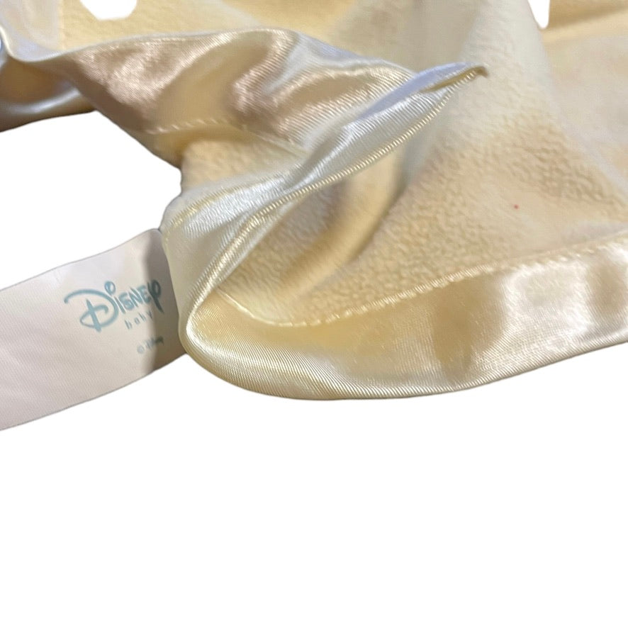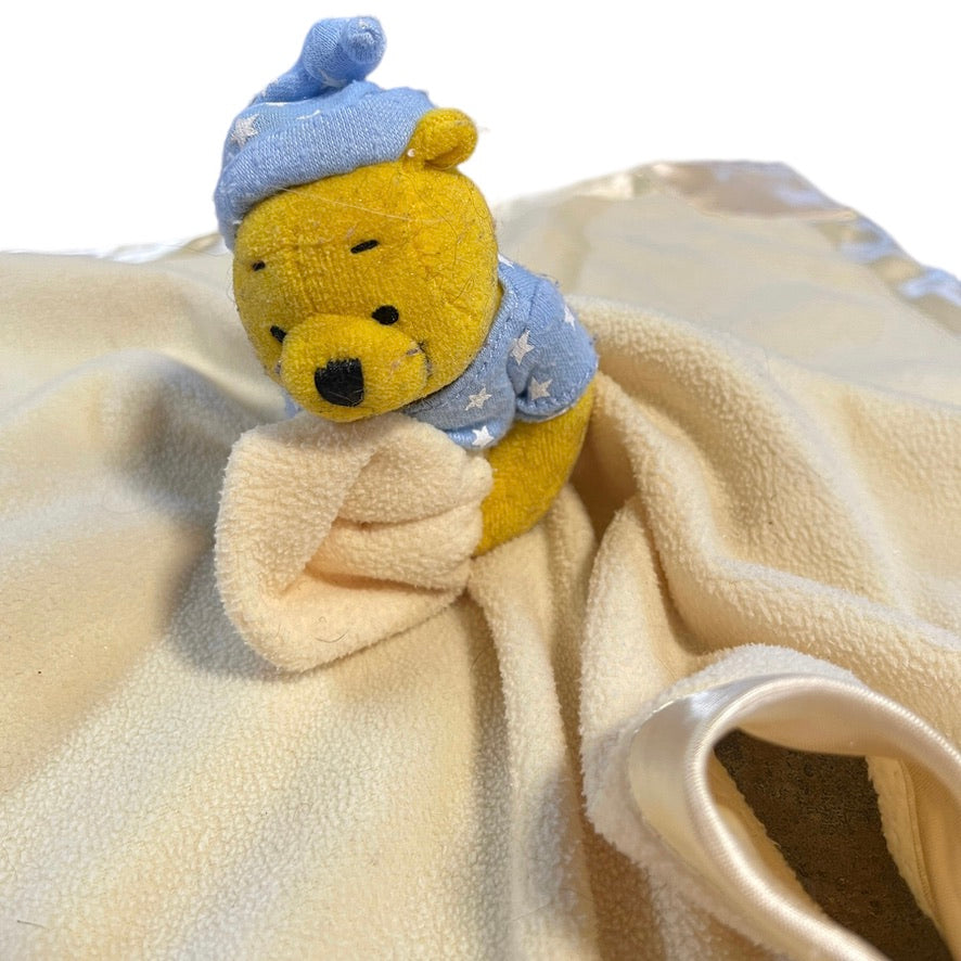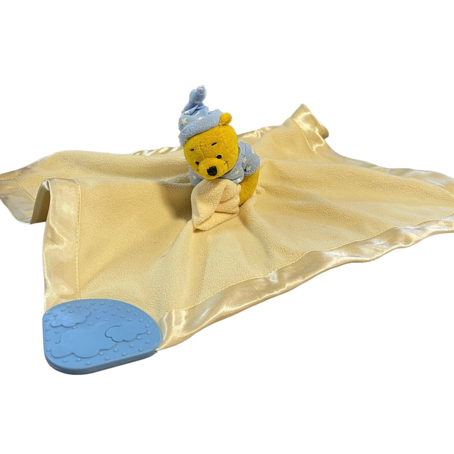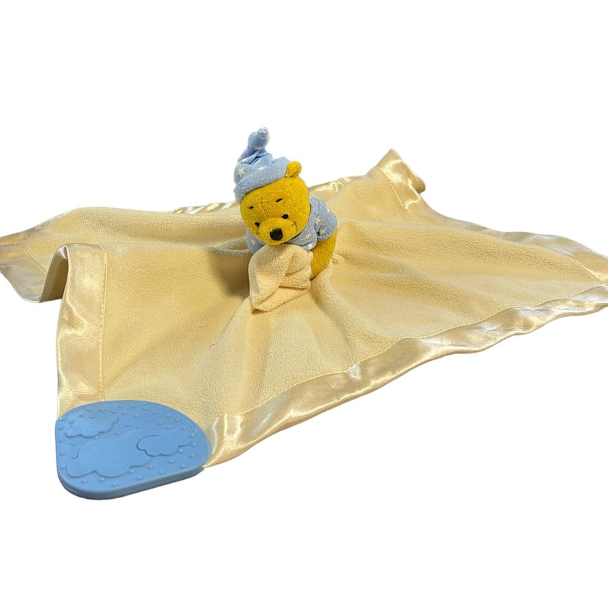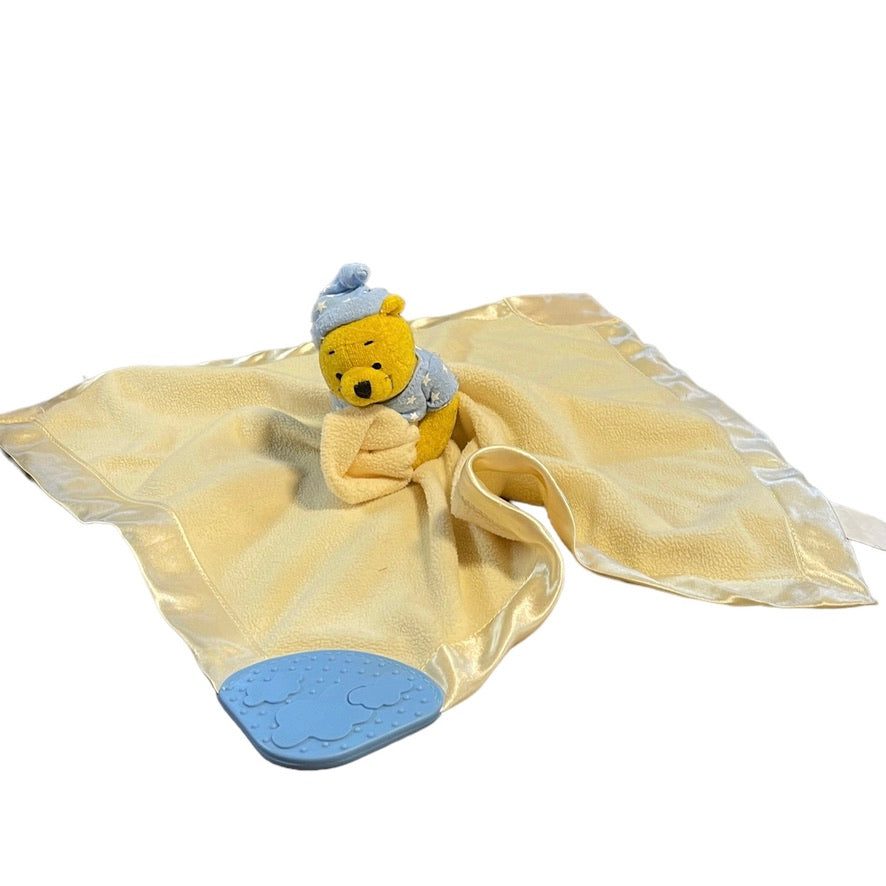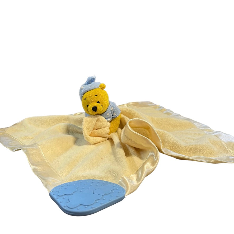 Sweet Disney Winnie the Pooh, yellow satin edged security lovey. with blue accents and teether in good preloved condition. A real treasure!