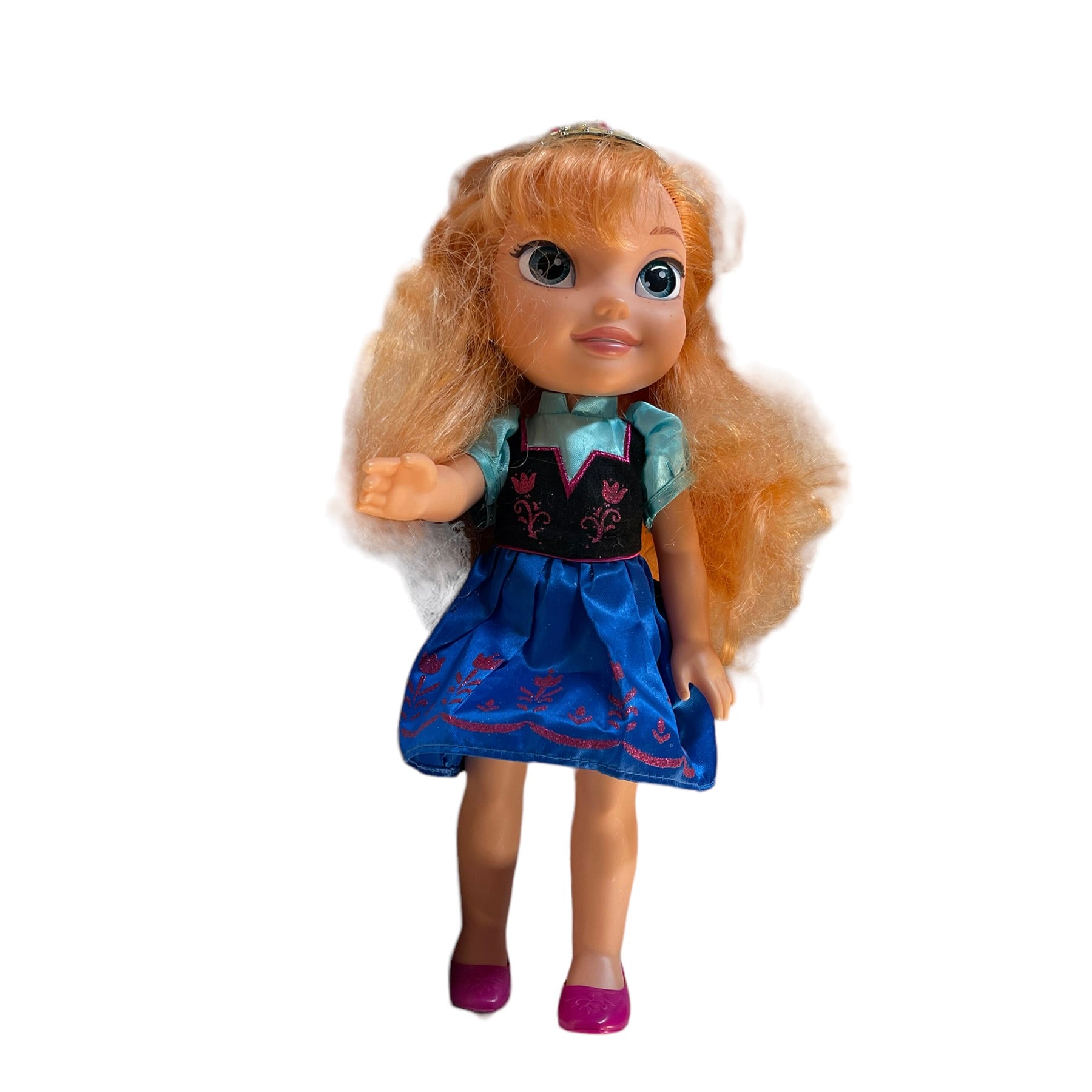 Toddler Anna from Disney's Frozen wearing original outfit with tiara and shoes. Hair is in good condition, but a bit frizzy, see pictures. In very good preloved condition.