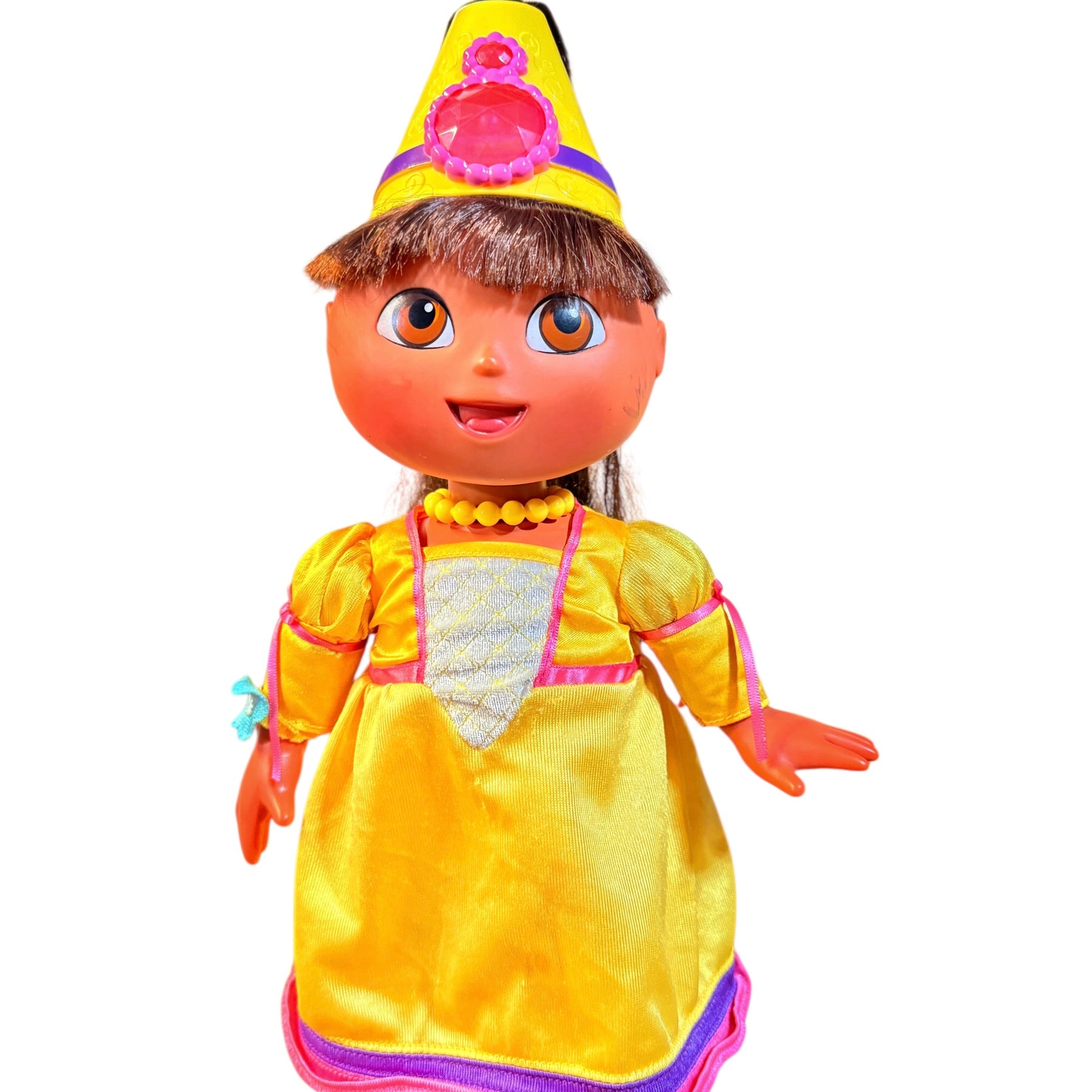 Beautiful Princess Dora, released in 2004 to coincide with a TV special. She has a magic hair function where her hair can grow or shorten, and she speaks and sings in both English and Spanish. This girl is in good preowned, working condition, with some minor wear on her gown. She is complete with her necklace, ring and bracelet!