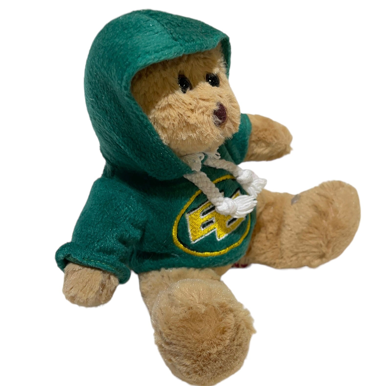 Classic green & gold hoody on 6" CFL bear. black bead eyes, embroidered features. football souvenir. A perfect size for little hands. Some writing on tag.
