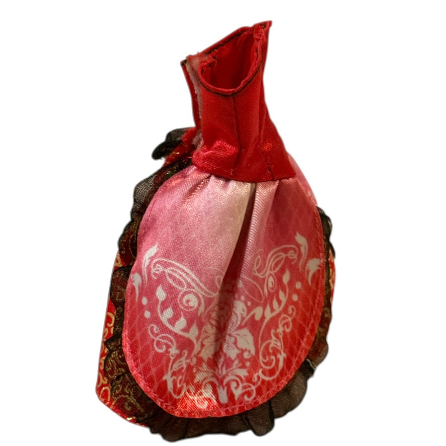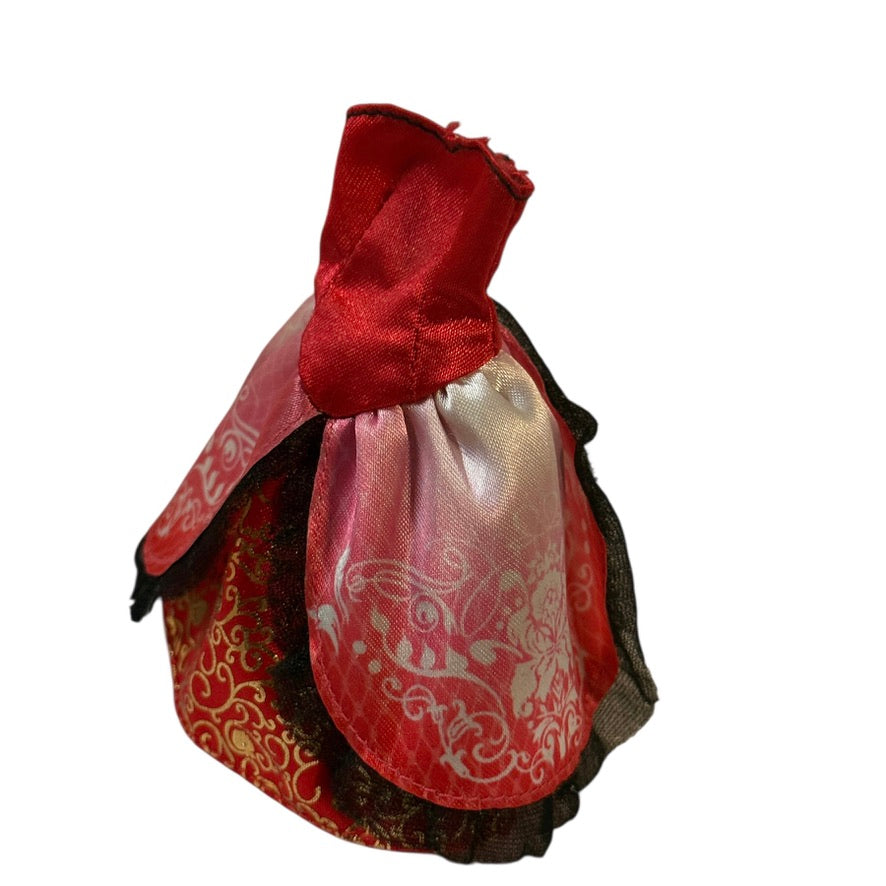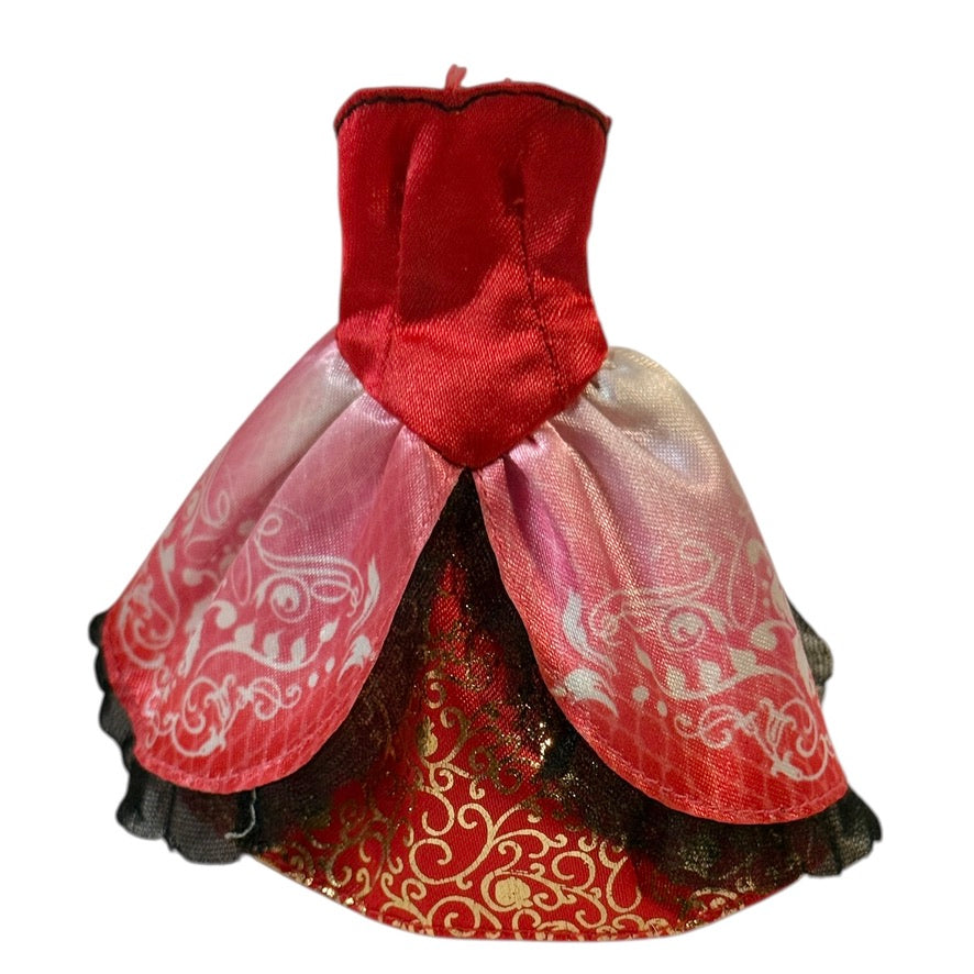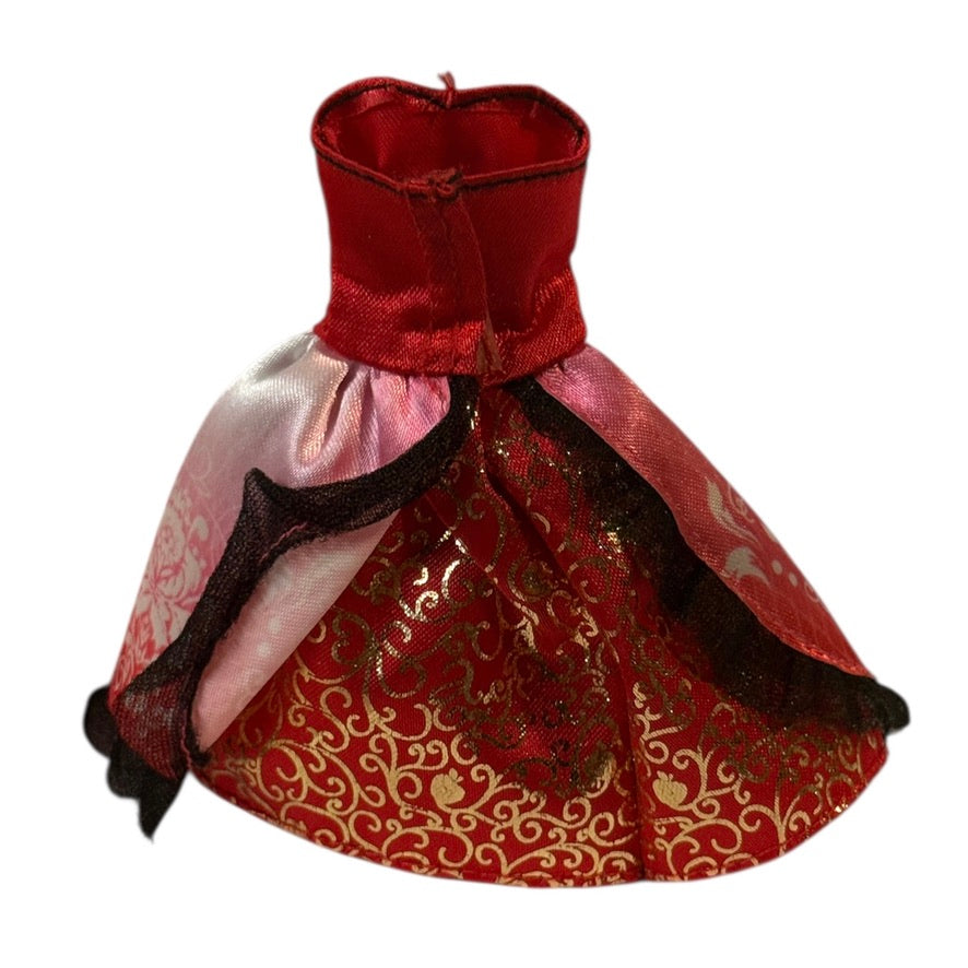 Sweet Little Red Dress from Ever After High, Apple White's Gold, White & Red Party Dress, with a shiny pattern and bklack lace trim. Good Preowned Condition.